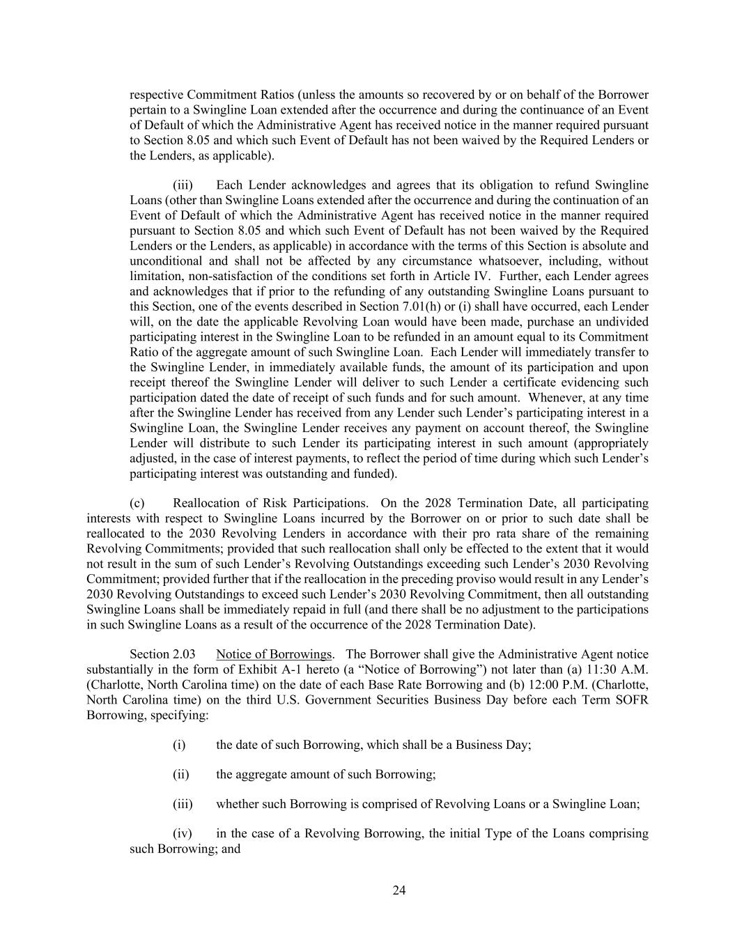 24 respective Commitment Ratios (unless the amounts so recovered by or on behalf of the Borrower pertain to a Swingline Loan extended after the occurrence and during the continuance of an Event of Default of which the Administrative Agent has received notice in the manner required pursuant to Section 8.05 and which such Event of Default has not been waived by the Required Lenders or the Lenders, as applicable). (iii) Each Lender acknowledges and agrees that its obligation to refund Swingline Loans (other than Swingline Loans extended after the occurrence and during the continuation of an Event of Default of which the Administrative Agent has received notice in the manner required pursuant to Section 8.05 and which such Event of Default has not been waived by the Required Lenders or the Lenders, as applicable) in accordance with the terms of this Section is absolute and unconditional and shall not be affected by any circumstance whatsoever, including, without limitation, non-satisfaction of the conditions set forth in Article IV. Further, each Lender agrees and acknowledges that if prior to the refunding of any outstanding Swingline Loans pursuant to this Section, one of the events described in Section 7.01(h) or (i) shall have occurred, each Lender will, on the date the applicable Revolving Loan would have been made, purchase an undivided participating interest in the Swingline Loan to be refunded in an amount equal to its Commitment Ratio of the aggregate amount of such Swingline Loan. Each Lender will immediately transfer to the Swingline Lender, in immediately available funds, the amount of its participation and upon receipt thereof the Swingline Lender will deliver to such Lender a certificate evidencing such participation dated the date of receipt of such funds and for such amount. Whenever, at any time after the Swingline Lender has received from any Lender such Lender’s participating interest in a Swingline Loan, the Swingline Lender receives any payment on account thereof, the Swingline Lender will distribute to such Lender its participating interest in such amount (appropriately adjusted, in the case of interest payments, to reflect the period of time during which such Lender’s participating interest was outstanding and funded). (c) Reallocation of Risk Participations. On the 2028 Termination Date, all participating interests with respect to Swingline Loans incurred by the Borrower on or prior to such date shall be reallocated to the 2030 Revolving Lenders in accordance with their pro rata share of the remaining Revolving Commitments; provided that such reallocation shall only be effected to the extent that it would not result in the sum of such Lender’s Revolving Outstandings exceeding such Lender’s 2030 Revolving Commitment; provided further that if the reallocation in the preceding proviso would result in any Lender’s 2030 Revolving Outstandings to exceed such Lender’s 2030 Revolving Commitment, then all outstanding Swingline Loans shall be immediately repaid in full (and there shall be no adjustment to the participations in such Swingline Loans as a result of the occurrence of the 2028 Termination Date). Section 2.03 Notice of Borrowings. The Borrower shall give the Administrative Agent notice substantially in the form of Exhibit A-1 hereto (a “Notice of Borrowing”) not later than (a) 11:30 A.M. (Charlotte, North Carolina time) on the date of each Base Rate Borrowing and (b) 12:00 P.M. (Charlotte, North Carolina time) on the third U.S. Government Securities Business Day before each Term SOFR Borrowing, specifying: (i) the date of such Borrowing, which shall be a Business Day; (ii) the aggregate amount of such Borrowing; (iii) whether such Borrowing is comprised of Revolving Loans or a Swingline Loan; (iv) in the case of a Revolving Borrowing, the initial Type of the Loans comprising such Borrowing; and