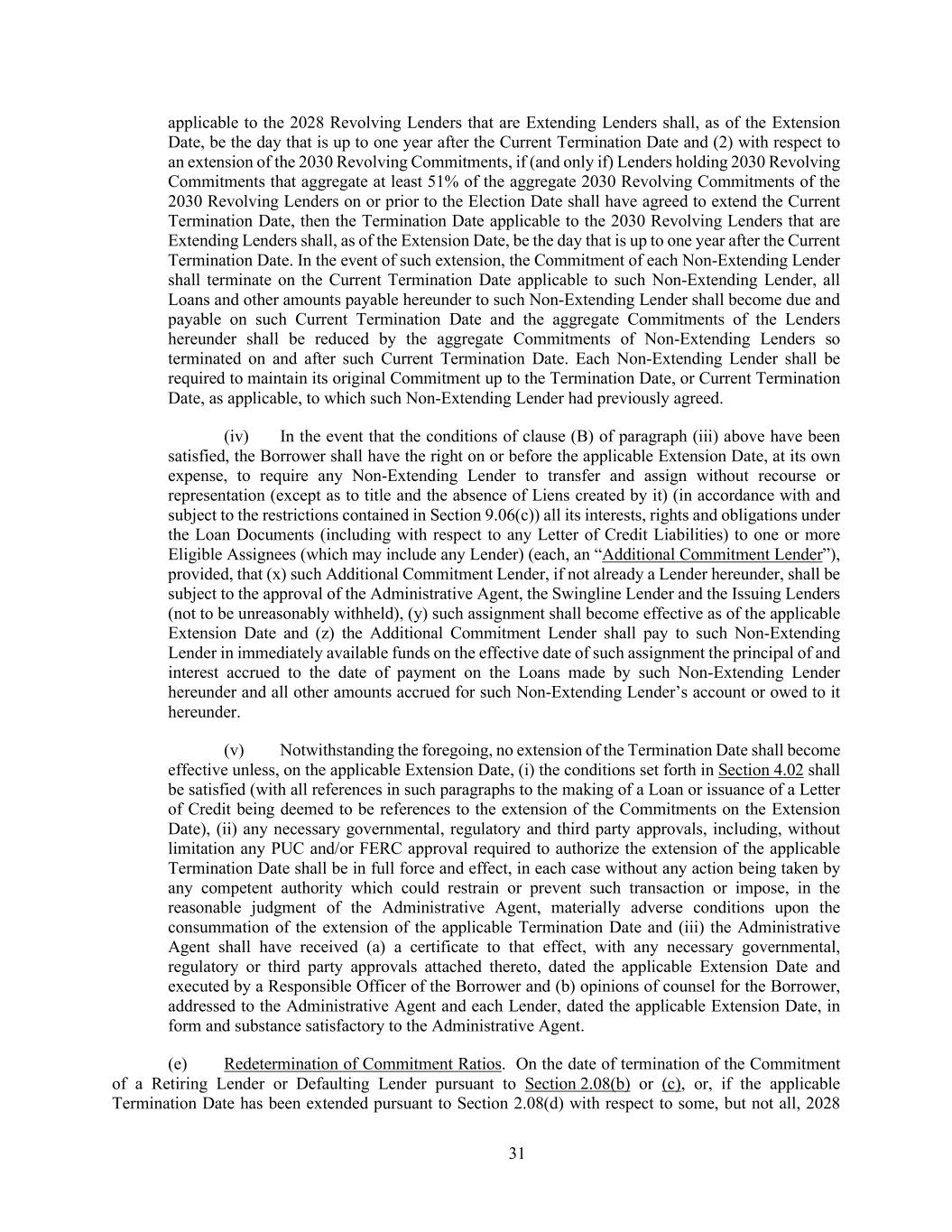 31 applicable to the 2028 Revolving Lenders that are Extending Lenders shall, as of the Extension Date, be the day that is up to one year after the Current Termination Date and (2) with respect to an extension of the 2030 Revolving Commitments, if (and only if) Lenders holding 2030 Revolving Commitments that aggregate at least 51% of the aggregate 2030 Revolving Commitments of the 2030 Revolving Lenders on or prior to the Election Date shall have agreed to extend the Current Termination Date, then the Termination Date applicable to the 2030 Revolving Lenders that are Extending Lenders shall, as of the Extension Date, be the day that is up to one year after the Current Termination Date. In the event of such extension, the Commitment of each Non-Extending Lender shall terminate on the Current Termination Date applicable to such Non-Extending Lender, all Loans and other amounts payable hereunder to such Non-Extending Lender shall become due and payable on such Current Termination Date and the aggregate Commitments of the Lenders hereunder shall be reduced by the aggregate Commitments of Non-Extending Lenders so terminated on and after such Current Termination Date. Each Non-Extending Lender shall be required to maintain its original Commitment up to the Termination Date, or Current Termination Date, as applicable, to which such Non-Extending Lender had previously agreed. (iv) In the event that the conditions of clause (B) of paragraph (iii) above have been satisfied, the Borrower shall have the right on or before the applicable Extension Date, at its own expense, to require any Non-Extending Lender to transfer and assign without recourse or representation (except as to title and the absence of Liens created by it) (in accordance with and subject to the restrictions contained in Section 9.06(c)) all its interests, rights and obligations under the Loan Documents (including with respect to any Letter of Credit Liabilities) to one or more Eligible Assignees (which may include any Lender) (each, an “Additional Commitment Lender”), provided, that (x) such Additional Commitment Lender, if not already a Lender hereunder, shall be subject to the approval of the Administrative Agent, the Swingline Lender and the Issuing Lenders (not to be unreasonably withheld), (y) such assignment shall become effective as of the applicable Extension Date and (z) the Additional Commitment Lender shall pay to such Non-Extending Lender in immediately available funds on the effective date of such assignment the principal of and interest accrued to the date of payment on the Loans made by such Non-Extending Lender hereunder and all other amounts accrued for such Non-Extending Lender’s account or owed to it hereunder. (v) Notwithstanding the foregoing, no extension of the Termination Date shall become effective unless, on the applicable Extension Date, (i) the conditions set forth in Section 4.02 shall be satisfied (with all references in such paragraphs to the making of a Loan or issuance of a Letter of Credit being deemed to be references to the extension of the Commitments on the Extension Date), (ii) any necessary governmental, regulatory and third party approvals, including, without limitation any PUC and/or FERC approval required to authorize the extension of the applicable Termination Date shall be in full force and effect, in each case without any action being taken by any competent authority which could restrain or prevent such transaction or impose, in the reasonable judgment of the Administrative Agent, materially adverse conditions upon the consummation of the extension of the applicable Termination Date and (iii) the Administrative Agent shall have received (a) a certificate to that effect, with any necessary governmental, regulatory or third party approvals attached thereto, dated the applicable Extension Date and executed by a Responsible Officer of the Borrower and (b) opinions of counsel for the Borrower, addressed to the Administrative Agent and each Lender, dated the applicable Extension Date, in form and substance satisfactory to the Administrative Agent. (e) Redetermination of Commitment Ratios. On the date of termination of the Commitment of a Retiring Lender or Defaulting Lender pursuant to Section 2.08(b) or (c), or, if the applicable Termination Date has been extended pursuant to Section 2.08(d) with respect to some, but not all, 2028