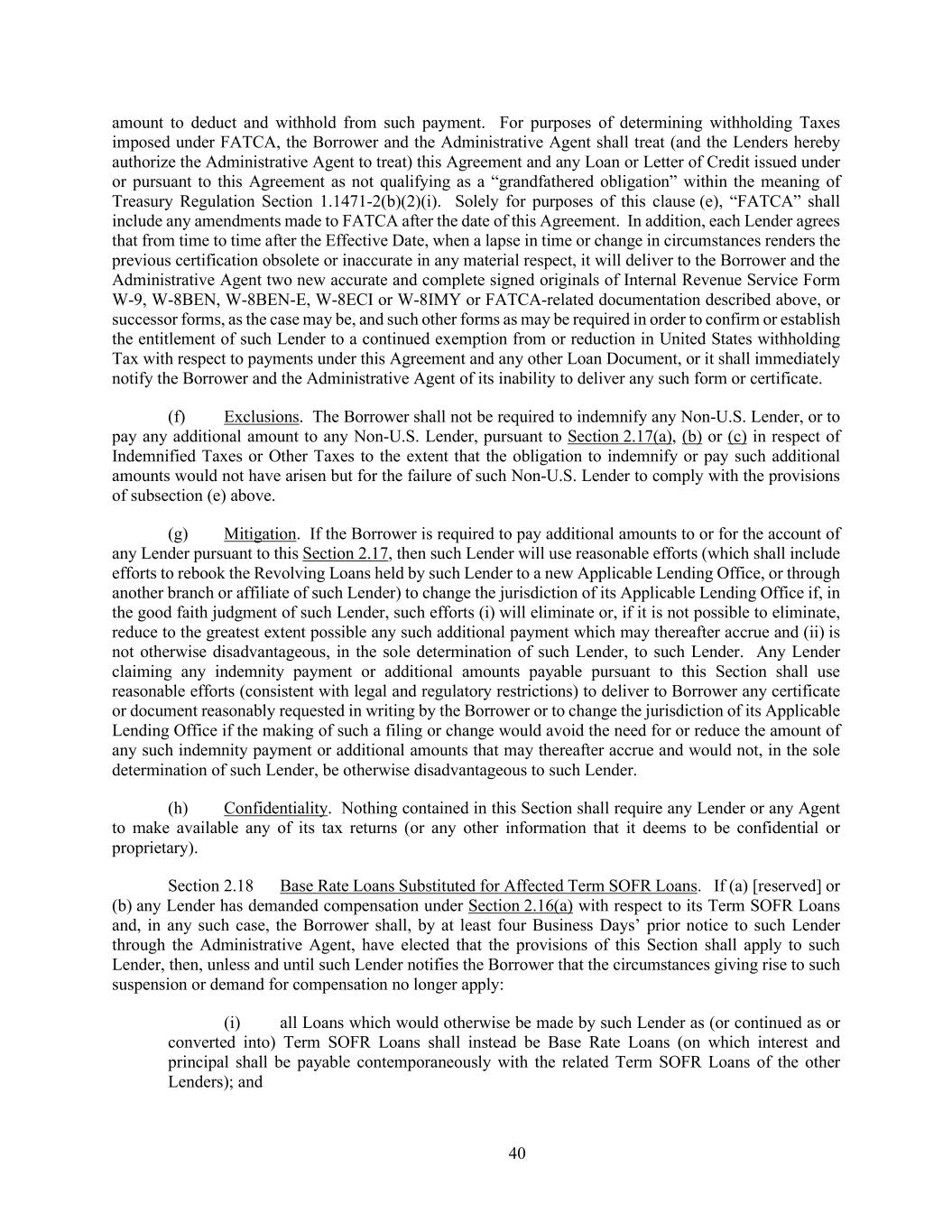 40 amount to deduct and withhold from such payment. For purposes of determining withholding Taxes imposed under FATCA, the Borrower and the Administrative Agent shall treat (and the Lenders hereby authorize the Administrative Agent to treat) this Agreement and any Loan or Letter of Credit issued under or pursuant to this Agreement as not qualifying as a “grandfathered obligation” within the meaning of Treasury Regulation Section 1.1471-2(b)(2)(i). Solely for purposes of this clause (e), “FATCA” shall include any amendments made to FATCA after the date of this Agreement. In addition, each Lender agrees that from time to time after the Effective Date, when a lapse in time or change in circumstances renders the previous certification obsolete or inaccurate in any material respect, it will deliver to the Borrower and the Administrative Agent two new accurate and complete signed originals of Internal Revenue Service Form W-9, W-8BEN, W-8BEN-E, W-8ECI or W-8IMY or FATCA-related documentation described above, or successor forms, as the case may be, and such other forms as may be required in order to confirm or establish the entitlement of such Lender to a continued exemption from or reduction in United States withholding Tax with respect to payments under this Agreement and any other Loan Document, or it shall immediately notify the Borrower and the Administrative Agent of its inability to deliver any such form or certificate. (f) Exclusions. The Borrower shall not be required to indemnify any Non-U.S. Lender, or to pay any additional amount to any Non-U.S. Lender, pursuant to Section 2.17(a), (b) or (c) in respect of Indemnified Taxes or Other Taxes to the extent that the obligation to indemnify or pay such additional amounts would not have arisen but for the failure of such Non-U.S. Lender to comply with the provisions of subsection (e) above. (g) Mitigation. If the Borrower is required to pay additional amounts to or for the account of any Lender pursuant to this Section 2.17, then such Lender will use reasonable efforts (which shall include efforts to rebook the Revolving Loans held by such Lender to a new Applicable Lending Office, or through another branch or affiliate of such Lender) to change the jurisdiction of its Applicable Lending Office if, in the good faith judgment of such Lender, such efforts (i) will eliminate or, if it is not possible to eliminate, reduce to the greatest extent possible any such additional payment which may thereafter accrue and (ii) is not otherwise disadvantageous, in the sole determination of such Lender, to such Lender. Any Lender claiming any indemnity payment or additional amounts payable pursuant to this Section shall use reasonable efforts (consistent with legal and regulatory restrictions) to deliver to Borrower any certificate or document reasonably requested in writing by the Borrower or to change the jurisdiction of its Applicable Lending Office if the making of such a filing or change would avoid the need for or reduce the amount of any such indemnity payment or additional amounts that may thereafter accrue and would not, in the sole determination of such Lender, be otherwise disadvantageous to such Lender. (h) Confidentiality. Nothing contained in this Section shall require any Lender or any Agent to make available any of its tax returns (or any other information that it deems to be confidential or proprietary). Section 2.18 Base Rate Loans Substituted for Affected Term SOFR Loans. If (a) [reserved] or (b) any Lender has demanded compensation under Section 2.16(a) with respect to its Term SOFR Loans and, in any such case, the Borrower shall, by at least four Business Days’ prior notice to such Lender through the Administrative Agent, have elected that the provisions of this Section shall apply to such Lender, then, unless and until such Lender notifies the Borrower that the circumstances giving rise to such suspension or demand for compensation no longer apply: (i) all Loans which would otherwise be made by such Lender as (or continued as or converted into) Term SOFR Loans shall instead be Base Rate Loans (on which interest and principal shall be payable contemporaneously with the related Term SOFR Loans of the other Lenders); and