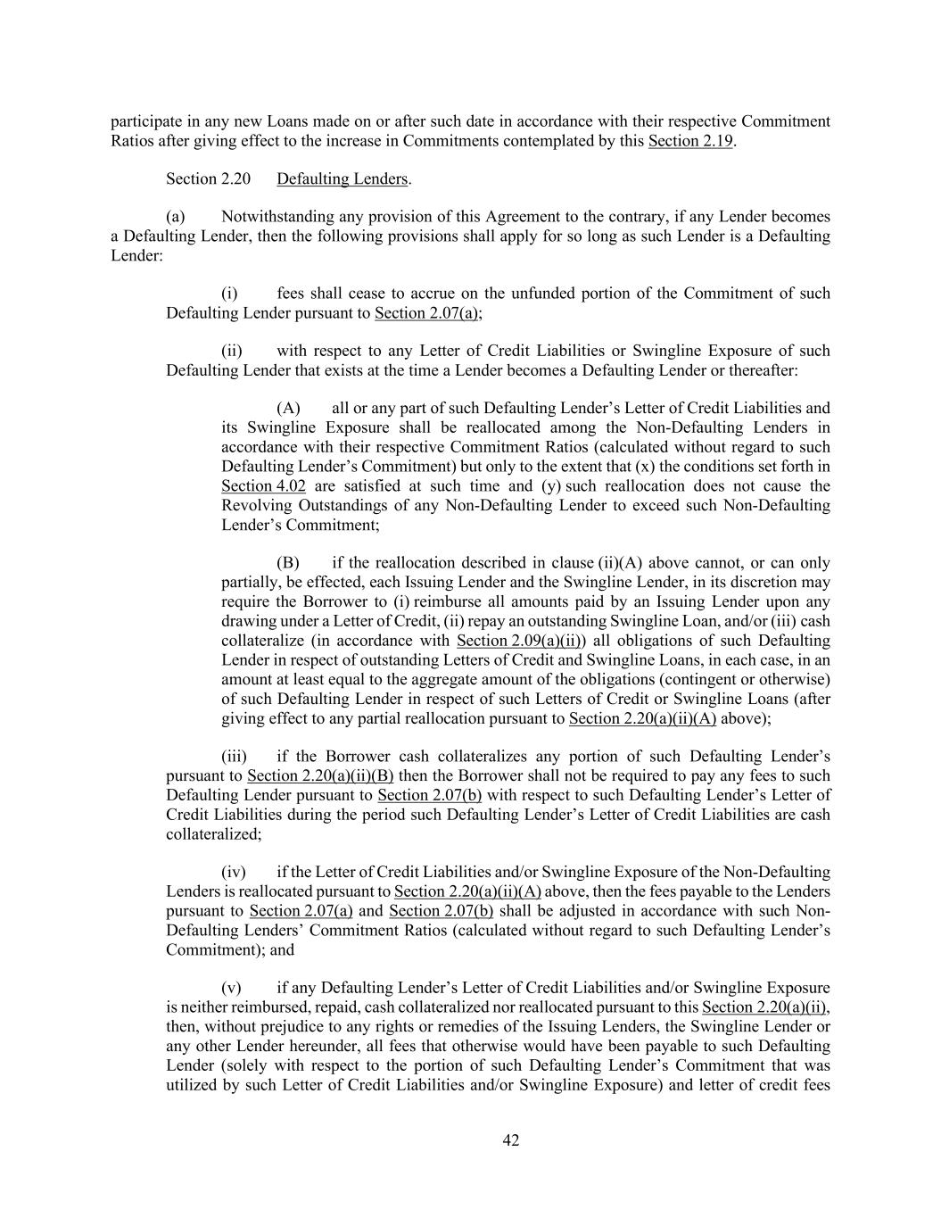 42 participate in any new Loans made on or after such date in accordance with their respective Commitment Ratios after giving effect to the increase in Commitments contemplated by this Section 2.19. Section 2.20 Defaulting Lenders. (a) Notwithstanding any provision of this Agreement to the contrary, if any Lender becomes a Defaulting Lender, then the following provisions shall apply for so long as such Lender is a Defaulting Lender: (i) fees shall cease to accrue on the unfunded portion of the Commitment of such Defaulting Lender pursuant to Section 2.07(a); (ii) with respect to any Letter of Credit Liabilities or Swingline Exposure of such Defaulting Lender that exists at the time a Lender becomes a Defaulting Lender or thereafter: (A) all or any part of such Defaulting Lender’s Letter of Credit Liabilities and its Swingline Exposure shall be reallocated among the Non-Defaulting Lenders in accordance with their respective Commitment Ratios (calculated without regard to such Defaulting Lender’s Commitment) but only to the extent that (x) the conditions set forth in Section 4.02 are satisfied at such time and (y) such reallocation does not cause the Revolving Outstandings of any Non-Defaulting Lender to exceed such Non-Defaulting Lender’s Commitment; (B) if the reallocation described in clause (ii)(A) above cannot, or can only partially, be effected, each Issuing Lender and the Swingline Lender, in its discretion may require the Borrower to (i) reimburse all amounts paid by an Issuing Lender upon any drawing under a Letter of Credit, (ii) repay an outstanding Swingline Loan, and/or (iii) cash collateralize (in accordance with Section 2.09(a)(ii)) all obligations of such Defaulting Lender in respect of outstanding Letters of Credit and Swingline Loans, in each case, in an amount at least equal to the aggregate amount of the obligations (contingent or otherwise) of such Defaulting Lender in respect of such Letters of Credit or Swingline Loans (after giving effect to any partial reallocation pursuant to Section 2.20(a)(ii)(A) above); (iii) if the Borrower cash collateralizes any portion of such Defaulting Lender’s pursuant to Section 2.20(a)(ii)(B) then the Borrower shall not be required to pay any fees to such Defaulting Lender pursuant to Section 2.07(b) with respect to such Defaulting Lender’s Letter of Credit Liabilities during the period such Defaulting Lender’s Letter of Credit Liabilities are cash collateralized; (iv) if the Letter of Credit Liabilities and/or Swingline Exposure of the Non-Defaulting Lenders is reallocated pursuant to Section 2.20(a)(ii)(A) above, then the fees payable to the Lenders pursuant to Section 2.07(a) and Section 2.07(b) shall be adjusted in accordance with such Non- Defaulting Lenders’ Commitment Ratios (calculated without regard to such Defaulting Lender’s Commitment); and (v) if any Defaulting Lender’s Letter of Credit Liabilities and/or Swingline Exposure is neither reimbursed, repaid, cash collateralized nor reallocated pursuant to this Section 2.20(a)(ii), then, without prejudice to any rights or remedies of the Issuing Lenders, the Swingline Lender or any other Lender hereunder, all fees that otherwise would have been payable to such Defaulting Lender (solely with respect to the portion of such Defaulting Lender’s Commitment that was utilized by such Letter of Credit Liabilities and/or Swingline Exposure) and letter of credit fees