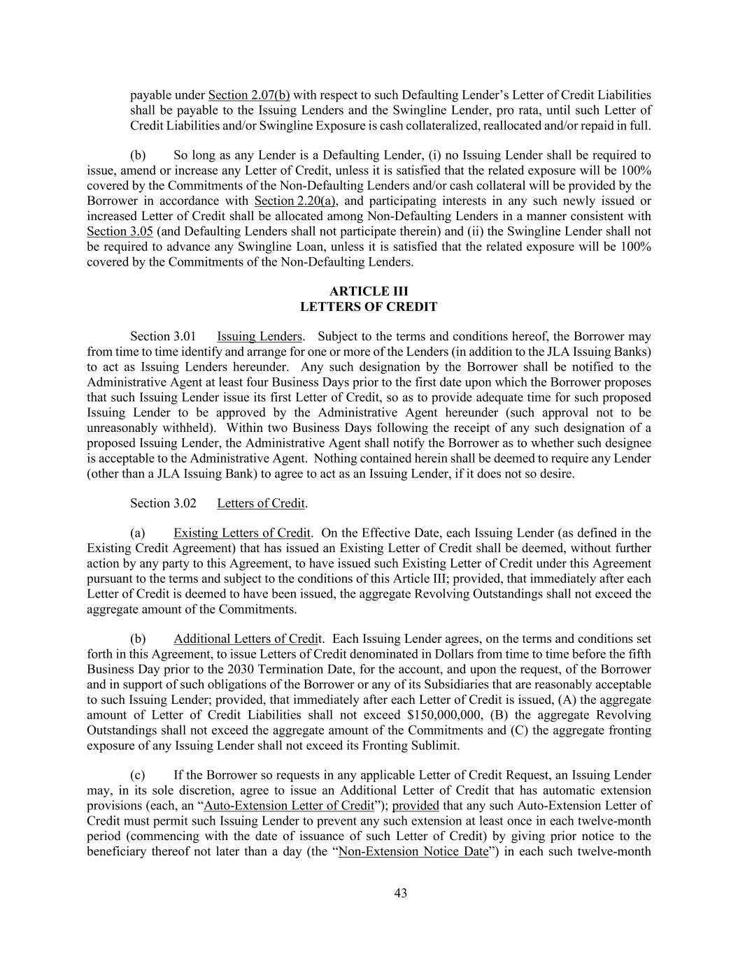 43 payable under Section 2.07(b) with respect to such Defaulting Lender’s Letter of Credit Liabilities shall be payable to the Issuing Lenders and the Swingline Lender, pro rata, until such Letter of Credit Liabilities and/or Swingline Exposure is cash collateralized, reallocated and/or repaid in full. (b) So long as any Lender is a Defaulting Lender, (i) no Issuing Lender shall be required to issue, amend or increase any Letter of Credit, unless it is satisfied that the related exposure will be 100% covered by the Commitments of the Non-Defaulting Lenders and/or cash collateral will be provided by the Borrower in accordance with Section 2.20(a), and participating interests in any such newly issued or increased Letter of Credit shall be allocated among Non-Defaulting Lenders in a manner consistent with Section 3.05 (and Defaulting Lenders shall not participate therein) and (ii) the Swingline Lender shall not be required to advance any Swingline Loan, unless it is satisfied that the related exposure will be 100% covered by the Commitments of the Non-Defaulting Lenders. ARTICLE III LETTERS OF CREDIT Section 3.01 Issuing Lenders. Subject to the terms and conditions hereof, the Borrower may from time to time identify and arrange for one or more of the Lenders (in addition to the JLA Issuing Banks) to act as Issuing Lenders hereunder. Any such designation by the Borrower shall be notified to the Administrative Agent at least four Business Days prior to the first date upon which the Borrower proposes that such Issuing Lender issue its first Letter of Credit, so as to provide adequate time for such proposed Issuing Lender to be approved by the Administrative Agent hereunder (such approval not to be unreasonably withheld). Within two Business Days following the receipt of any such designation of a proposed Issuing Lender, the Administrative Agent shall notify the Borrower as to whether such designee is acceptable to the Administrative Agent. Nothing contained herein shall be deemed to require any Lender (other than a JLA Issuing Bank) to agree to act as an Issuing Lender, if it does not so desire. Section 3.02 Letters of Credit. (a) Existing Letters of Credit. On the Effective Date, each Issuing Lender (as defined in the Existing Credit Agreement) that has issued an Existing Letter of Credit shall be deemed, without further action by any party to this Agreement, to have issued such Existing Letter of Credit under this Agreement pursuant to the terms and subject to the conditions of this Article III; provided, that immediately after each Letter of Credit is deemed to have been issued, the aggregate Revolving Outstandings shall not exceed the aggregate amount of the Commitments. (b) Additional Letters of Credit. Each Issuing Lender agrees, on the terms and conditions set forth in this Agreement, to issue Letters of Credit denominated in Dollars from time to time before the fifth Business Day prior to the 2030 Termination Date, for the account, and upon the request, of the Borrower and in support of such obligations of the Borrower or any of its Subsidiaries that are reasonably acceptable to such Issuing Lender; provided, that immediately after each Letter of Credit is issued, (A) the aggregate amount of Letter of Credit Liabilities shall not exceed $150,000,000, (B) the aggregate Revolving Outstandings shall not exceed the aggregate amount of the Commitments and (C) the aggregate fronting exposure of any Issuing Lender shall not exceed its Fronting Sublimit. (c) If the Borrower so requests in any applicable Letter of Credit Request, an Issuing Lender may, in its sole discretion, agree to issue an Additional Letter of Credit that has automatic extension provisions (each, an “Auto-Extension Letter of Credit”); provided that any such Auto-Extension Letter of Credit must permit such Issuing Lender to prevent any such extension at least once in each twelve-month period (commencing with the date of issuance of such Letter of Credit) by giving prior notice to the beneficiary thereof not later than a day (the “Non-Extension Notice Date”) in each such twelve-month