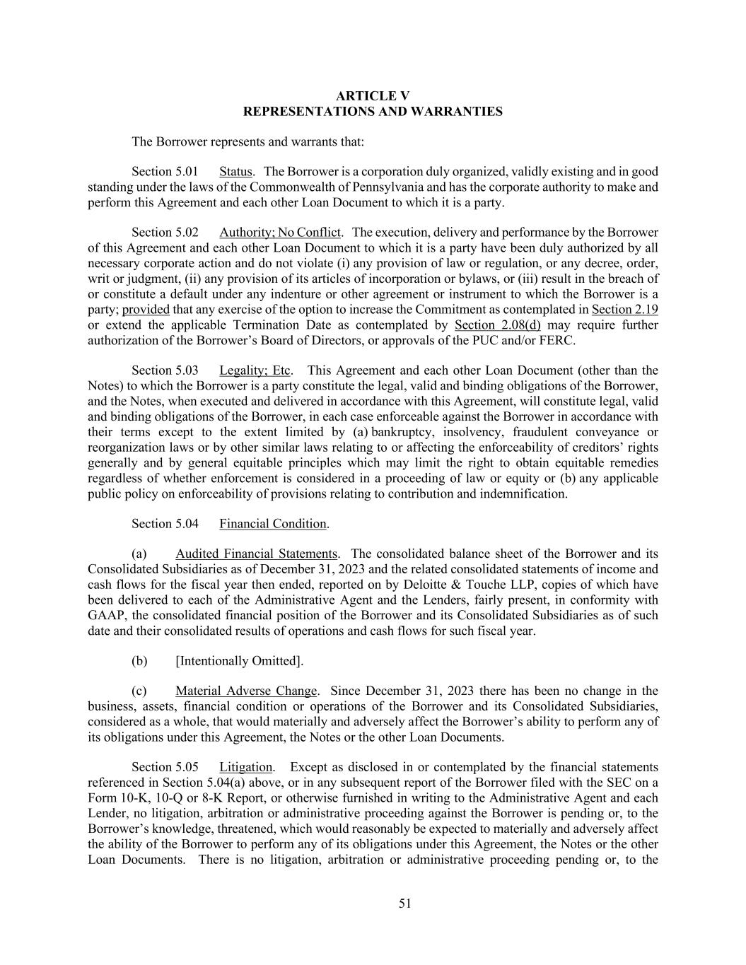 51 ARTICLE V REPRESENTATIONS AND WARRANTIES The Borrower represents and warrants that: Section 5.01 Status. The Borrower is a corporation duly organized, validly existing and in good standing under the laws of the Commonwealth of Pennsylvania and has the corporate authority to make and perform this Agreement and each other Loan Document to which it is a party. Section 5.02 Authority; No Conflict. The execution, delivery and performance by the Borrower of this Agreement and each other Loan Document to which it is a party have been duly authorized by all necessary corporate action and do not violate (i) any provision of law or regulation, or any decree, order, writ or judgment, (ii) any provision of its articles of incorporation or bylaws, or (iii) result in the breach of or constitute a default under any indenture or other agreement or instrument to which the Borrower is a party; provided that any exercise of the option to increase the Commitment as contemplated in Section 2.19 or extend the applicable Termination Date as contemplated by Section 2.08(d) may require further authorization of the Borrower’s Board of Directors, or approvals of the PUC and/or FERC. Section 5.03 Legality; Etc. This Agreement and each other Loan Document (other than the Notes) to which the Borrower is a party constitute the legal, valid and binding obligations of the Borrower, and the Notes, when executed and delivered in accordance with this Agreement, will constitute legal, valid and binding obligations of the Borrower, in each case enforceable against the Borrower in accordance with their terms except to the extent limited by (a) bankruptcy, insolvency, fraudulent conveyance or reorganization laws or by other similar laws relating to or affecting the enforceability of creditors’ rights generally and by general equitable principles which may limit the right to obtain equitable remedies regardless of whether enforcement is considered in a proceeding of law or equity or (b) any applicable public policy on enforceability of provisions relating to contribution and indemnification. Section 5.04 Financial Condition. (a) Audited Financial Statements. The consolidated balance sheet of the Borrower and its Consolidated Subsidiaries as of December 31, 2023 and the related consolidated statements of income and cash flows for the fiscal year then ended, reported on by Deloitte & Touche LLP, copies of which have been delivered to each of the Administrative Agent and the Lenders, fairly present, in conformity with GAAP, the consolidated financial position of the Borrower and its Consolidated Subsidiaries as of such date and their consolidated results of operations and cash flows for such fiscal year. (b) [Intentionally Omitted]. (c) Material Adverse Change. Since December 31, 2023 there has been no change in the business, assets, financial condition or operations of the Borrower and its Consolidated Subsidiaries, considered as a whole, that would materially and adversely affect the Borrower’s ability to perform any of its obligations under this Agreement, the Notes or the other Loan Documents. Section 5.05 Litigation. Except as disclosed in or contemplated by the financial statements referenced in Section 5.04(a) above, or in any subsequent report of the Borrower filed with the SEC on a Form 10-K, 10-Q or 8-K Report, or otherwise furnished in writing to the Administrative Agent and each Lender, no litigation, arbitration or administrative proceeding against the Borrower is pending or, to the Borrower’s knowledge, threatened, which would reasonably be expected to materially and adversely affect the ability of the Borrower to perform any of its obligations under this Agreement, the Notes or the other Loan Documents. There is no litigation, arbitration or administrative proceeding pending or, to the