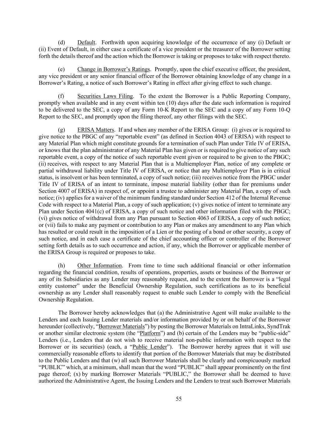 55 (d) Default. Forthwith upon acquiring knowledge of the occurrence of any (i) Default or (ii) Event of Default, in either case a certificate of a vice president or the treasurer of the Borrower setting forth the details thereof and the action which the Borrower is taking or proposes to take with respect thereto. (e) Change in Borrower’s Ratings. Promptly, upon the chief executive officer, the president, any vice president or any senior financial officer of the Borrower obtaining knowledge of any change in a Borrower’s Rating, a notice of such Borrower’s Rating in effect after giving effect to such change. (f) Securities Laws Filing. To the extent the Borrower is a Public Reporting Company, promptly when available and in any event within ten (10) days after the date such information is required to be delivered to the SEC, a copy of any Form 10-K Report to the SEC and a copy of any Form 10-Q Report to the SEC, and promptly upon the filing thereof, any other filings with the SEC. (g) ERISA Matters. If and when any member of the ERISA Group: (i) gives or is required to give notice to the PBGC of any “reportable event” (as defined in Section 4043 of ERISA) with respect to any Material Plan which might constitute grounds for a termination of such Plan under Title IV of ERISA, or knows that the plan administrator of any Material Plan has given or is required to give notice of any such reportable event, a copy of the notice of such reportable event given or required to be given to the PBGC; (ii) receives, with respect to any Material Plan that is a Multiemployer Plan, notice of any complete or partial withdrawal liability under Title IV of ERISA, or notice that any Multiemployer Plan is in critical status, is insolvent or has been terminated, a copy of such notice; (iii) receives notice from the PBGC under Title IV of ERISA of an intent to terminate, impose material liability (other than for premiums under Section 4007 of ERISA) in respect of, or appoint a trustee to administer any Material Plan, a copy of such notice; (iv) applies for a waiver of the minimum funding standard under Section 412 of the Internal Revenue Code with respect to a Material Plan, a copy of such application; (v) gives notice of intent to terminate any Plan under Section 4041(c) of ERISA, a copy of such notice and other information filed with the PBGC; (vi) gives notice of withdrawal from any Plan pursuant to Section 4063 of ERISA, a copy of such notice; or (vii) fails to make any payment or contribution to any Plan or makes any amendment to any Plan which has resulted or could result in the imposition of a Lien or the posting of a bond or other security, a copy of such notice, and in each case a certificate of the chief accounting officer or controller of the Borrower setting forth details as to such occurrence and action, if any, which the Borrower or applicable member of the ERISA Group is required or proposes to take. (h) Other Information. From time to time such additional financial or other information regarding the financial condition, results of operations, properties, assets or business of the Borrower or any of its Subsidiaries as any Lender may reasonably request, and to the extent the Borrower is a “legal entity customer” under the Beneficial Ownership Regulation, such certifications as to its beneficial ownership as any Lender shall reasonably request to enable such Lender to comply with the Beneficial Ownership Regulation. The Borrower hereby acknowledges that (a) the Administrative Agent will make available to the Lenders and each Issuing Lender materials and/or information provided by or on behalf of the Borrower hereunder (collectively, “Borrower Materials”) by posting the Borrower Materials on IntraLinks, SyndTrak or another similar electronic system (the “Platform”) and (b) certain of the Lenders may be “public-side” Lenders (i.e., Lenders that do not wish to receive material non-public information with respect to the Borrower or its securities) (each, a “Public Lender”). The Borrower hereby agrees that it will use commercially reasonable efforts to identify that portion of the Borrower Materials that may be distributed to the Public Lenders and that (w) all such Borrower Materials shall be clearly and conspicuously marked “PUBLIC” which, at a minimum, shall mean that the word “PUBLIC” shall appear prominently on the first page thereof; (x) by marking Borrower Materials “PUBLIC,” the Borrower shall be deemed to have authorized the Administrative Agent, the Issuing Lenders and the Lenders to treat such Borrower Materials