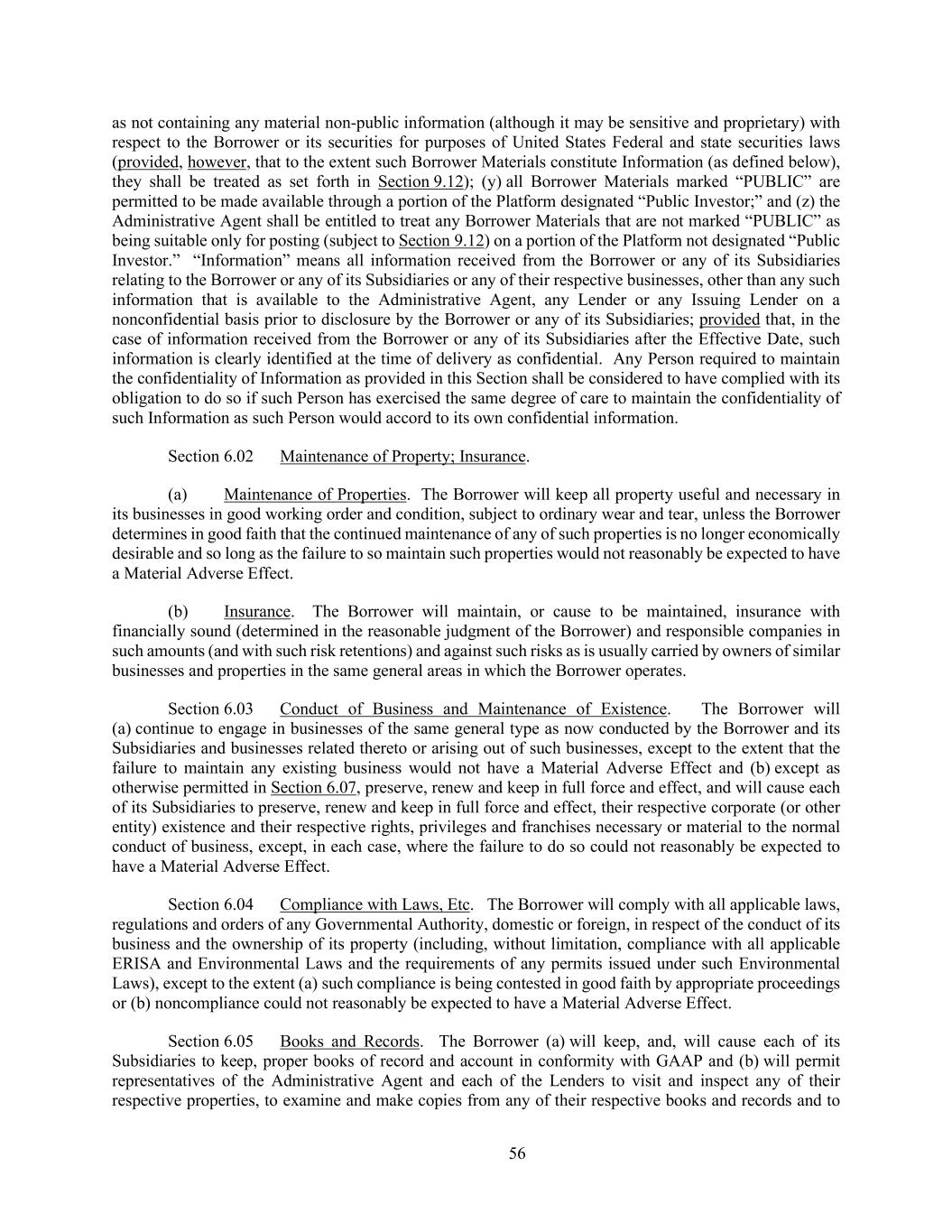 56 as not containing any material non-public information (although it may be sensitive and proprietary) with respect to the Borrower or its securities for purposes of United States Federal and state securities laws (provided, however, that to the extent such Borrower Materials constitute Information (as defined below), they shall be treated as set forth in Section 9.12); (y) all Borrower Materials marked “PUBLIC” are permitted to be made available through a portion of the Platform designated “Public Investor;” and (z) the Administrative Agent shall be entitled to treat any Borrower Materials that are not marked “PUBLIC” as being suitable only for posting (subject to Section 9.12) on a portion of the Platform not designated “Public Investor.” “Information” means all information received from the Borrower or any of its Subsidiaries relating to the Borrower or any of its Subsidiaries or any of their respective businesses, other than any such information that is available to the Administrative Agent, any Lender or any Issuing Lender on a nonconfidential basis prior to disclosure by the Borrower or any of its Subsidiaries; provided that, in the case of information received from the Borrower or any of its Subsidiaries after the Effective Date, such information is clearly identified at the time of delivery as confidential. Any Person required to maintain the confidentiality of Information as provided in this Section shall be considered to have complied with its obligation to do so if such Person has exercised the same degree of care to maintain the confidentiality of such Information as such Person would accord to its own confidential information. Section 6.02 Maintenance of Property; Insurance. (a) Maintenance of Properties. The Borrower will keep all property useful and necessary in its businesses in good working order and condition, subject to ordinary wear and tear, unless the Borrower determines in good faith that the continued maintenance of any of such properties is no longer economically desirable and so long as the failure to so maintain such properties would not reasonably be expected to have a Material Adverse Effect. (b) Insurance. The Borrower will maintain, or cause to be maintained, insurance with financially sound (determined in the reasonable judgment of the Borrower) and responsible companies in such amounts (and with such risk retentions) and against such risks as is usually carried by owners of similar businesses and properties in the same general areas in which the Borrower operates. Section 6.03 Conduct of Business and Maintenance of Existence. The Borrower will (a) continue to engage in businesses of the same general type as now conducted by the Borrower and its Subsidiaries and businesses related thereto or arising out of such businesses, except to the extent that the failure to maintain any existing business would not have a Material Adverse Effect and (b) except as otherwise permitted in Section 6.07, preserve, renew and keep in full force and effect, and will cause each of its Subsidiaries to preserve, renew and keep in full force and effect, their respective corporate (or other entity) existence and their respective rights, privileges and franchises necessary or material to the normal conduct of business, except, in each case, where the failure to do so could not reasonably be expected to have a Material Adverse Effect. Section 6.04 Compliance with Laws, Etc. The Borrower will comply with all applicable laws, regulations and orders of any Governmental Authority, domestic or foreign, in respect of the conduct of its business and the ownership of its property (including, without limitation, compliance with all applicable ERISA and Environmental Laws and the requirements of any permits issued under such Environmental Laws), except to the extent (a) such compliance is being contested in good faith by appropriate proceedings or (b) noncompliance could not reasonably be expected to have a Material Adverse Effect. Section 6.05 Books and Records. The Borrower (a) will keep, and, will cause each of its Subsidiaries to keep, proper books of record and account in conformity with GAAP and (b) will permit representatives of the Administrative Agent and each of the Lenders to visit and inspect any of their respective properties, to examine and make copies from any of their respective books and records and to