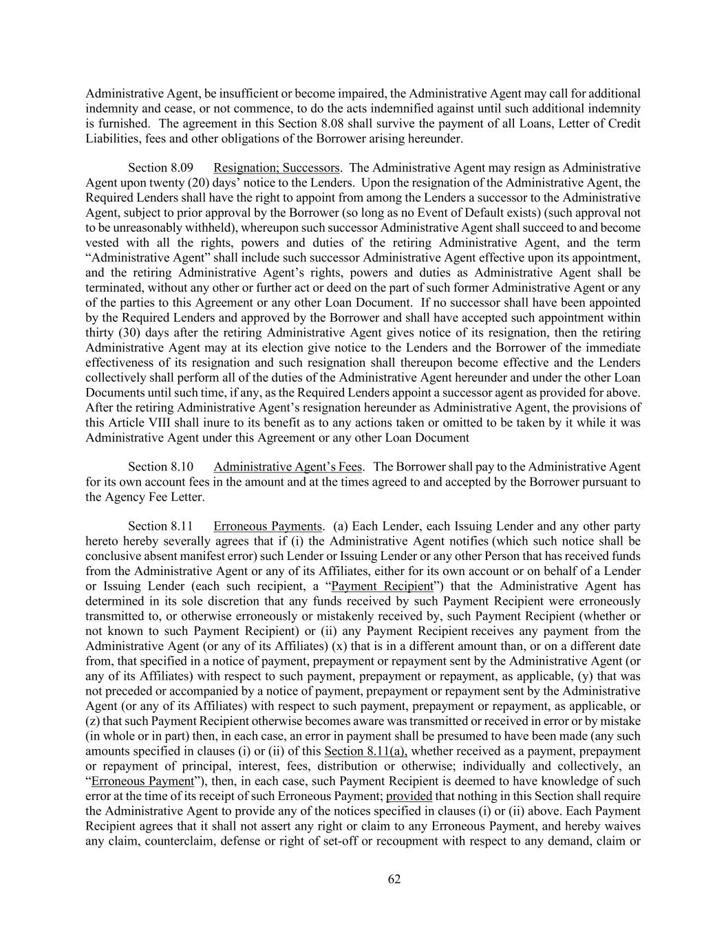 62 Administrative Agent, be insufficient or become impaired, the Administrative Agent may call for additional indemnity and cease, or not commence, to do the acts indemnified against until such additional indemnity is furnished. The agreement in this Section 8.08 shall survive the payment of all Loans, Letter of Credit Liabilities, fees and other obligations of the Borrower arising hereunder. Section 8.09 Resignation; Successors. The Administrative Agent may resign as Administrative Agent upon twenty (20) days’ notice to the Lenders. Upon the resignation of the Administrative Agent, the Required Lenders shall have the right to appoint from among the Lenders a successor to the Administrative Agent, subject to prior approval by the Borrower (so long as no Event of Default exists) (such approval not to be unreasonably withheld), whereupon such successor Administrative Agent shall succeed to and become vested with all the rights, powers and duties of the retiring Administrative Agent, and the term “Administrative Agent” shall include such successor Administrative Agent effective upon its appointment, and the retiring Administrative Agent’s rights, powers and duties as Administrative Agent shall be terminated, without any other or further act or deed on the part of such former Administrative Agent or any of the parties to this Agreement or any other Loan Document. If no successor shall have been appointed by the Required Lenders and approved by the Borrower and shall have accepted such appointment within thirty (30) days after the retiring Administrative Agent gives notice of its resignation, then the retiring Administrative Agent may at its election give notice to the Lenders and the Borrower of the immediate effectiveness of its resignation and such resignation shall thereupon become effective and the Lenders collectively shall perform all of the duties of the Administrative Agent hereunder and under the other Loan Documents until such time, if any, as the Required Lenders appoint a successor agent as provided for above. After the retiring Administrative Agent’s resignation hereunder as Administrative Agent, the provisions of this Article VIII shall inure to its benefit as to any actions taken or omitted to be taken by it while it was Administrative Agent under this Agreement or any other Loan Document Section 8.10 Administrative Agent’s Fees. The Borrower shall pay to the Administrative Agent for its own account fees in the amount and at the times agreed to and accepted by the Borrower pursuant to the Agency Fee Letter. Section 8.11 Erroneous Payments. (a) Each Lender, each Issuing Lender and any other party hereto hereby severally agrees that if (i) the Administrative Agent notifies (which such notice shall be conclusive absent manifest error) such Lender or Issuing Lender or any other Person that has received funds from the Administrative Agent or any of its Affiliates, either for its own account or on behalf of a Lender or Issuing Lender (each such recipient, a “Payment Recipient”) that the Administrative Agent has determined in its sole discretion that any funds received by such Payment Recipient were erroneously transmitted to, or otherwise erroneously or mistakenly received by, such Payment Recipient (whether or not known to such Payment Recipient) or (ii) any Payment Recipient receives any payment from the Administrative Agent (or any of its Affiliates) (x) that is in a different amount than, or on a different date from, that specified in a notice of payment, prepayment or repayment sent by the Administrative Agent (or any of its Affiliates) with respect to such payment, prepayment or repayment, as applicable, (y) that was not preceded or accompanied by a notice of payment, prepayment or repayment sent by the Administrative Agent (or any of its Affiliates) with respect to such payment, prepayment or repayment, as applicable, or (z) that such Payment Recipient otherwise becomes aware was transmitted or received in error or by mistake (in whole or in part) then, in each case, an error in payment shall be presumed to have been made (any such amounts specified in clauses (i) or (ii) of this Section 8.11(a), whether received as a payment, prepayment or repayment of principal, interest, fees, distribution or otherwise; individually and collectively, an “Erroneous Payment”), then, in each case, such Payment Recipient is deemed to have knowledge of such error at the time of its receipt of such Erroneous Payment; provided that nothing in this Section shall require the Administrative Agent to provide any of the notices specified in clauses (i) or (ii) above. Each Payment Recipient agrees that it shall not assert any right or claim to any Erroneous Payment, and hereby waives any claim, counterclaim, defense or right of set-off or recoupment with respect to any demand, claim or