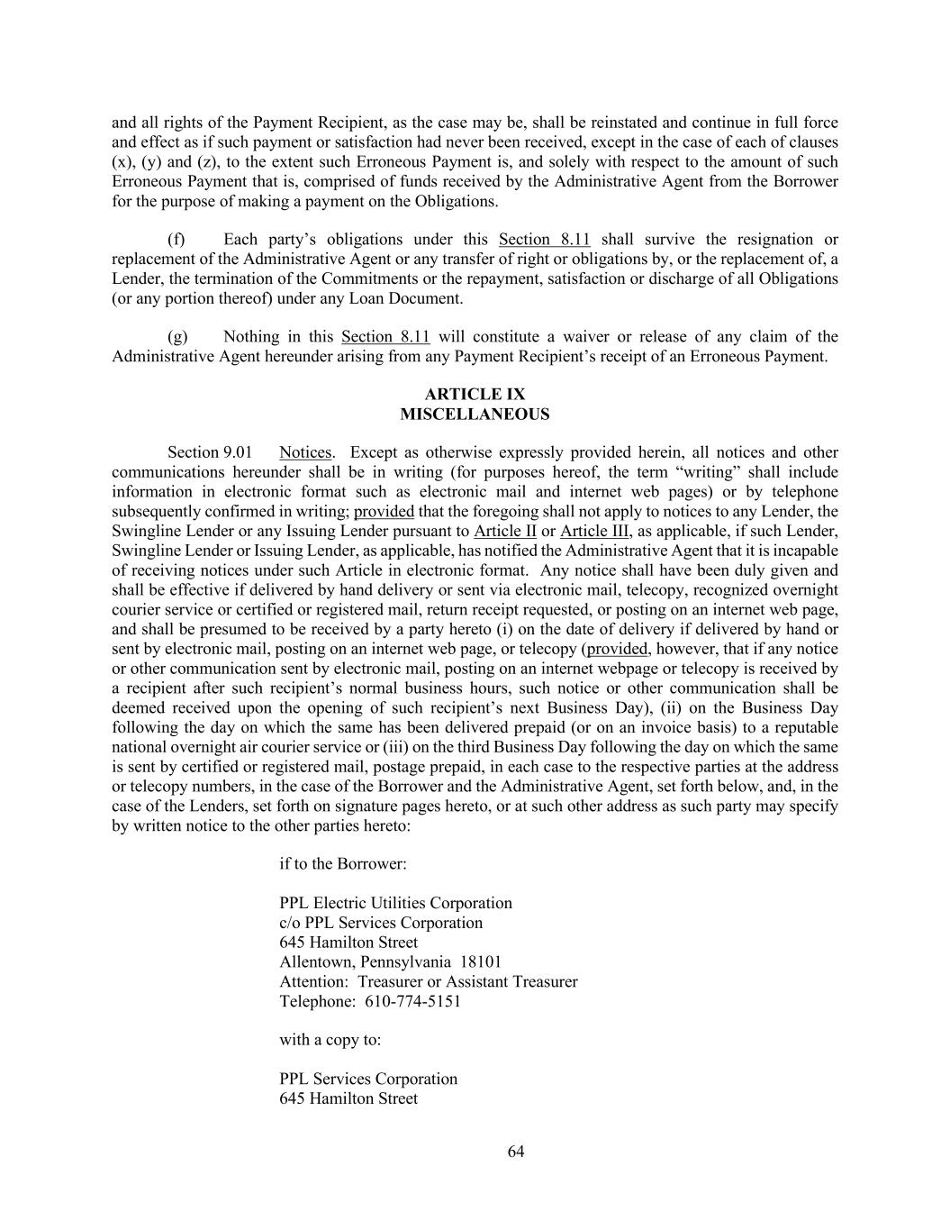 64 and all rights of the Payment Recipient, as the case may be, shall be reinstated and continue in full force and effect as if such payment or satisfaction had never been received, except in the case of each of clauses (x), (y) and (z), to the extent such Erroneous Payment is, and solely with respect to the amount of such Erroneous Payment that is, comprised of funds received by the Administrative Agent from the Borrower for the purpose of making a payment on the Obligations. (f) Each party’s obligations under this Section 8.11 shall survive the resignation or replacement of the Administrative Agent or any transfer of right or obligations by, or the replacement of, a Lender, the termination of the Commitments or the repayment, satisfaction or discharge of all Obligations (or any portion thereof) under any Loan Document. (g) Nothing in this Section 8.11 will constitute a waiver or release of any claim of the Administrative Agent hereunder arising from any Payment Recipient’s receipt of an Erroneous Payment. ARTICLE IX MISCELLANEOUS Section 9.01 Notices. Except as otherwise expressly provided herein, all notices and other communications hereunder shall be in writing (for purposes hereof, the term “writing” shall include information in electronic format such as electronic mail and internet web pages) or by telephone subsequently confirmed in writing; provided that the foregoing shall not apply to notices to any Lender, the Swingline Lender or any Issuing Lender pursuant to Article II or Article III, as applicable, if such Lender, Swingline Lender or Issuing Lender, as applicable, has notified the Administrative Agent that it is incapable of receiving notices under such Article in electronic format. Any notice shall have been duly given and shall be effective if delivered by hand delivery or sent via electronic mail, telecopy, recognized overnight courier service or certified or registered mail, return receipt requested, or posting on an internet web page, and shall be presumed to be received by a party hereto (i) on the date of delivery if delivered by hand or sent by electronic mail, posting on an internet web page, or telecopy (provided, however, that if any notice or other communication sent by electronic mail, posting on an internet webpage or telecopy is received by a recipient after such recipient’s normal business hours, such notice or other communication shall be deemed received upon the opening of such recipient’s next Business Day), (ii) on the Business Day following the day on which the same has been delivered prepaid (or on an invoice basis) to a reputable national overnight air courier service or (iii) on the third Business Day following the day on which the same is sent by certified or registered mail, postage prepaid, in each case to the respective parties at the address or telecopy numbers, in the case of the Borrower and the Administrative Agent, set forth below, and, in the case of the Lenders, set forth on signature pages hereto, or at such other address as such party may specify by written notice to the other parties hereto: if to the Borrower: PPL Electric Utilities Corporation c/o PPL Services Corporation 645 Hamilton Street Allentown, Pennsylvania 18101 Attention: Treasurer or Assistant Treasurer Telephone: 610-774-5151 with a copy to: PPL Services Corporation 645 Hamilton Street