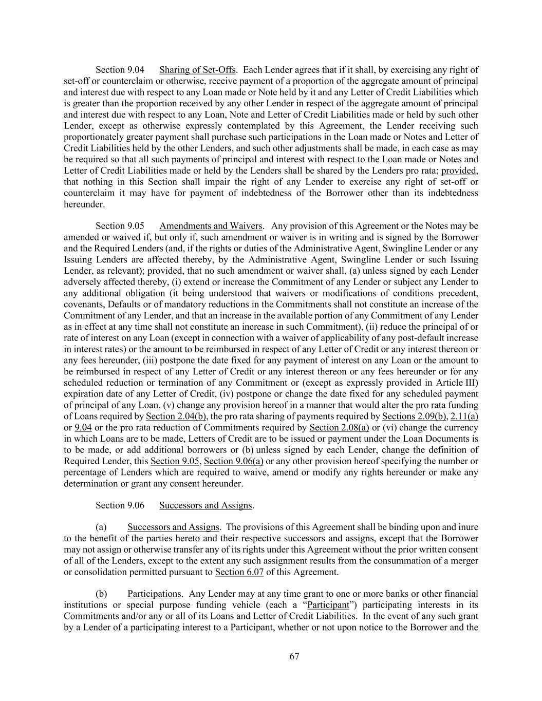 67 Section 9.04 Sharing of Set-Offs. Each Lender agrees that if it shall, by exercising any right of set-off or counterclaim or otherwise, receive payment of a proportion of the aggregate amount of principal and interest due with respect to any Loan made or Note held by it and any Letter of Credit Liabilities which is greater than the proportion received by any other Lender in respect of the aggregate amount of principal and interest due with respect to any Loan, Note and Letter of Credit Liabilities made or held by such other Lender, except as otherwise expressly contemplated by this Agreement, the Lender receiving such proportionately greater payment shall purchase such participations in the Loan made or Notes and Letter of Credit Liabilities held by the other Lenders, and such other adjustments shall be made, in each case as may be required so that all such payments of principal and interest with respect to the Loan made or Notes and Letter of Credit Liabilities made or held by the Lenders shall be shared by the Lenders pro rata; provided, that nothing in this Section shall impair the right of any Lender to exercise any right of set-off or counterclaim it may have for payment of indebtedness of the Borrower other than its indebtedness hereunder. Section 9.05 Amendments and Waivers. Any provision of this Agreement or the Notes may be amended or waived if, but only if, such amendment or waiver is in writing and is signed by the Borrower and the Required Lenders (and, if the rights or duties of the Administrative Agent, Swingline Lender or any Issuing Lenders are affected thereby, by the Administrative Agent, Swingline Lender or such Issuing Lender, as relevant); provided, that no such amendment or waiver shall, (a) unless signed by each Lender adversely affected thereby, (i) extend or increase the Commitment of any Lender or subject any Lender to any additional obligation (it being understood that waivers or modifications of conditions precedent, covenants, Defaults or of mandatory reductions in the Commitments shall not constitute an increase of the Commitment of any Lender, and that an increase in the available portion of any Commitment of any Lender as in effect at any time shall not constitute an increase in such Commitment), (ii) reduce the principal of or rate of interest on any Loan (except in connection with a waiver of applicability of any post-default increase in interest rates) or the amount to be reimbursed in respect of any Letter of Credit or any interest thereon or any fees hereunder, (iii) postpone the date fixed for any payment of interest on any Loan or the amount to be reimbursed in respect of any Letter of Credit or any interest thereon or any fees hereunder or for any scheduled reduction or termination of any Commitment or (except as expressly provided in Article III) expiration date of any Letter of Credit, (iv) postpone or change the date fixed for any scheduled payment of principal of any Loan, (v) change any provision hereof in a manner that would alter the pro rata funding of Loans required by Section 2.04(b), the pro rata sharing of payments required by Sections 2.09(b), 2.11(a) or 9.04 or the pro rata reduction of Commitments required by Section 2.08(a) or (vi) change the currency in which Loans are to be made, Letters of Credit are to be issued or payment under the Loan Documents is to be made, or add additional borrowers or (b) unless signed by each Lender, change the definition of Required Lender, this Section 9.05, Section 9.06(a) or any other provision hereof specifying the number or percentage of Lenders which are required to waive, amend or modify any rights hereunder or make any determination or grant any consent hereunder. Section 9.06 Successors and Assigns. (a) Successors and Assigns. The provisions of this Agreement shall be binding upon and inure to the benefit of the parties hereto and their respective successors and assigns, except that the Borrower may not assign or otherwise transfer any of its rights under this Agreement without the prior written consent of all of the Lenders, except to the extent any such assignment results from the consummation of a merger or consolidation permitted pursuant to Section 6.07 of this Agreement. (b) Participations. Any Lender may at any time grant to one or more banks or other financial institutions or special purpose funding vehicle (each a “Participant”) participating interests in its Commitments and/or any or all of its Loans and Letter of Credit Liabilities. In the event of any such grant by a Lender of a participating interest to a Participant, whether or not upon notice to the Borrower and the