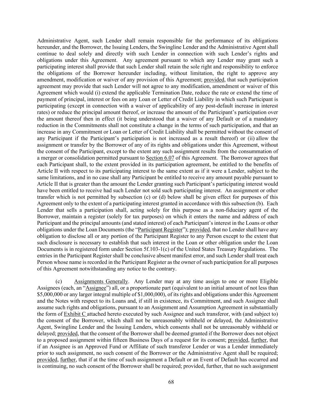 68 Administrative Agent, such Lender shall remain responsible for the performance of its obligations hereunder, and the Borrower, the Issuing Lenders, the Swingline Lender and the Administrative Agent shall continue to deal solely and directly with such Lender in connection with such Lender’s rights and obligations under this Agreement. Any agreement pursuant to which any Lender may grant such a participating interest shall provide that such Lender shall retain the sole right and responsibility to enforce the obligations of the Borrower hereunder including, without limitation, the right to approve any amendment, modification or waiver of any provision of this Agreement; provided, that such participation agreement may provide that such Lender will not agree to any modification, amendment or waiver of this Agreement which would (i) extend the applicable Termination Date, reduce the rate or extend the time of payment of principal, interest or fees on any Loan or Letter of Credit Liability in which such Participant is participating (except in connection with a waiver of applicability of any post-default increase in interest rates) or reduce the principal amount thereof, or increase the amount of the Participant’s participation over the amount thereof then in effect (it being understood that a waiver of any Default or of a mandatory reduction in the Commitments shall not constitute a change in the terms of such participation, and that an increase in any Commitment or Loan or Letter of Credit Liability shall be permitted without the consent of any Participant if the Participant’s participation is not increased as a result thereof) or (ii) allow the assignment or transfer by the Borrower of any of its rights and obligations under this Agreement, without the consent of the Participant, except to the extent any such assignment results from the consummation of a merger or consolidation permitted pursuant to Section 6.07 of this Agreement. The Borrower agrees that each Participant shall, to the extent provided in its participation agreement, be entitled to the benefits of Article II with respect to its participating interest to the same extent as if it were a Lender, subject to the same limitations, and in no case shall any Participant be entitled to receive any amount payable pursuant to Article II that is greater than the amount the Lender granting such Participant’s participating interest would have been entitled to receive had such Lender not sold such participating interest. An assignment or other transfer which is not permitted by subsection (c) or (d) below shall be given effect for purposes of this Agreement only to the extent of a participating interest granted in accordance with this subsection (b). Each Lender that sells a participation shall, acting solely for this purpose as a non-fiduciary agent of the Borrower, maintain a register (solely for tax purposes) on which it enters the name and address of each Participant and the principal amounts (and stated interest) of each Participant’s interest in the Loans or other obligations under the Loan Documents (the “Participant Register”); provided, that no Lender shall have any obligation to disclose all or any portion of the Participant Register to any Person except to the extent that such disclosure is necessary to establish that such interest in the Loan or other obligation under the Loan Documents is in registered form under Section 5f.103-1(c) of the United States Treasury Regulations. The entries in the Participant Register shall be conclusive absent manifest error, and such Lender shall treat each Person whose name is recorded in the Participant Register as the owner of such participation for all purposes of this Agreement notwithstanding any notice to the contrary. (c) Assignments Generally. Any Lender may at any time assign to one or more Eligible Assignees (each, an “Assignee”) all, or a proportionate part (equivalent to an initial amount of not less than $5,000,000 or any larger integral multiple of $1,000,000), of its rights and obligations under this Agreement and the Notes with respect to its Loans and, if still in existence, its Commitment, and such Assignee shall assume such rights and obligations, pursuant to an Assignment and Assumption Agreement in substantially the form of Exhibit C attached hereto executed by such Assignee and such transferor, with (and subject to) the consent of the Borrower, which shall not be unreasonably withheld or delayed, the Administrative Agent, Swingline Lender and the Issuing Lenders, which consents shall not be unreasonably withheld or delayed; provided, that the consent of the Borrower shall be deemed granted if the Borrower does not object to a proposed assignment within fifteen Business Days of a request for its consent; provided, further, that if an Assignee is an Approved Fund or Affiliate of such transferor Lender or was a Lender immediately prior to such assignment, no such consent of the Borrower or the Administrative Agent shall be required; provided, further, that if at the time of such assignment a Default or an Event of Default has occurred and is continuing, no such consent of the Borrower shall be required; provided, further, that no such assignment
