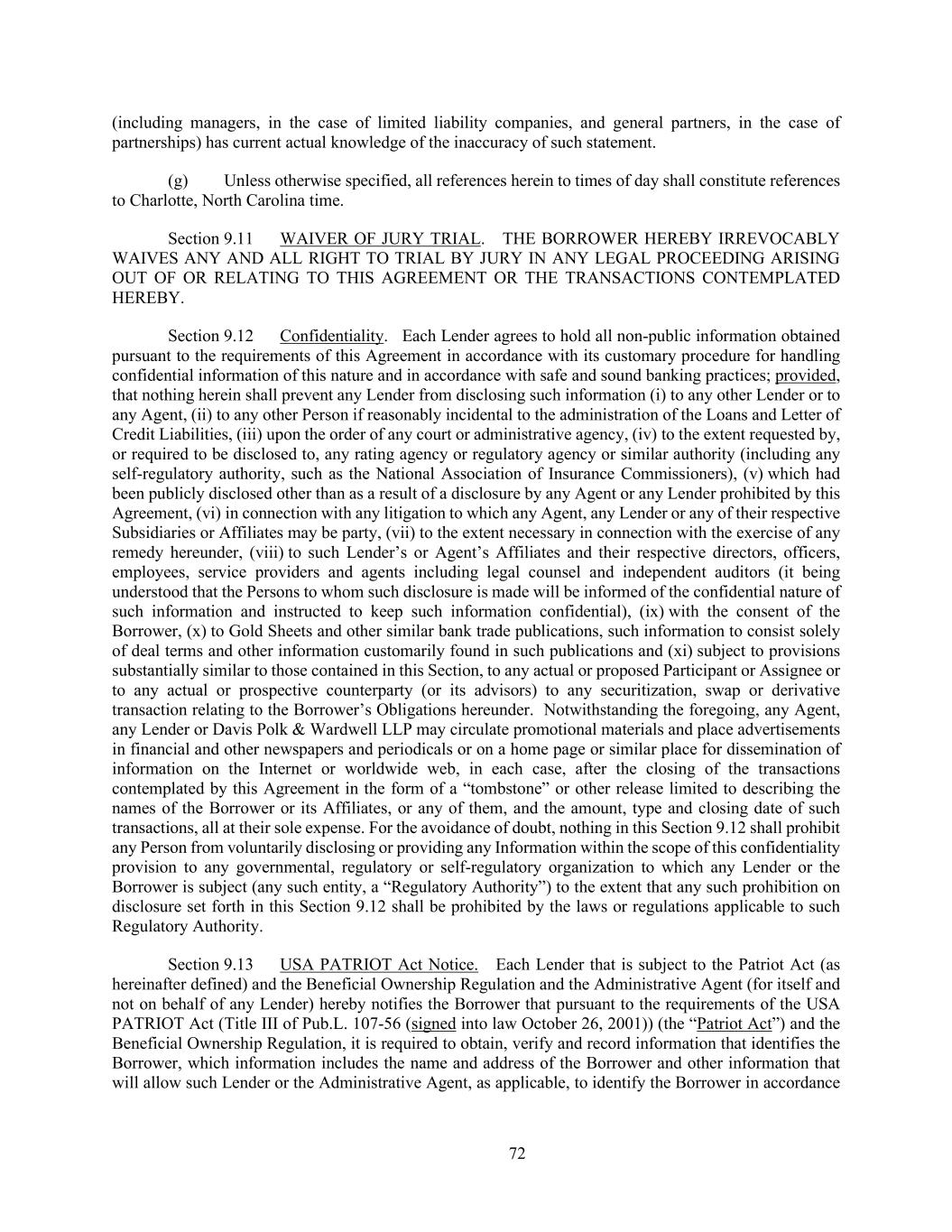 72 (including managers, in the case of limited liability companies, and general partners, in the case of partnerships) has current actual knowledge of the inaccuracy of such statement. (g) Unless otherwise specified, all references herein to times of day shall constitute references to Charlotte, North Carolina time. Section 9.11 WAIVER OF JURY TRIAL. THE BORROWER HEREBY IRREVOCABLY WAIVES ANY AND ALL RIGHT TO TRIAL BY JURY IN ANY LEGAL PROCEEDING ARISING OUT OF OR RELATING TO THIS AGREEMENT OR THE TRANSACTIONS CONTEMPLATED HEREBY. Section 9.12 Confidentiality. Each Lender agrees to hold all non-public information obtained pursuant to the requirements of this Agreement in accordance with its customary procedure for handling confidential information of this nature and in accordance with safe and sound banking practices; provided, that nothing herein shall prevent any Lender from disclosing such information (i) to any other Lender or to any Agent, (ii) to any other Person if reasonably incidental to the administration of the Loans and Letter of Credit Liabilities, (iii) upon the order of any court or administrative agency, (iv) to the extent requested by, or required to be disclosed to, any rating agency or regulatory agency or similar authority (including any self-regulatory authority, such as the National Association of Insurance Commissioners), (v) which had been publicly disclosed other than as a result of a disclosure by any Agent or any Lender prohibited by this Agreement, (vi) in connection with any litigation to which any Agent, any Lender or any of their respective Subsidiaries or Affiliates may be party, (vii) to the extent necessary in connection with the exercise of any remedy hereunder, (viii) to such Lender’s or Agent’s Affiliates and their respective directors, officers, employees, service providers and agents including legal counsel and independent auditors (it being understood that the Persons to whom such disclosure is made will be informed of the confidential nature of such information and instructed to keep such information confidential), (ix) with the consent of the Borrower, (x) to Gold Sheets and other similar bank trade publications, such information to consist solely of deal terms and other information customarily found in such publications and (xi) subject to provisions substantially similar to those contained in this Section, to any actual or proposed Participant or Assignee or to any actual or prospective counterparty (or its advisors) to any securitization, swap or derivative transaction relating to the Borrower’s Obligations hereunder. Notwithstanding the foregoing, any Agent, any Lender or Davis Polk & Wardwell LLP may circulate promotional materials and place advertisements in financial and other newspapers and periodicals or on a home page or similar place for dissemination of information on the Internet or worldwide web, in each case, after the closing of the transactions contemplated by this Agreement in the form of a “tombstone” or other release limited to describing the names of the Borrower or its Affiliates, or any of them, and the amount, type and closing date of such transactions, all at their sole expense. For the avoidance of doubt, nothing in this Section 9.12 shall prohibit any Person from voluntarily disclosing or providing any Information within the scope of this confidentiality provision to any governmental, regulatory or self-regulatory organization to which any Lender or the Borrower is subject (any such entity, a “Regulatory Authority”) to the extent that any such prohibition on disclosure set forth in this Section 9.12 shall be prohibited by the laws or regulations applicable to such Regulatory Authority. Section 9.13 USA PATRIOT Act Notice. Each Lender that is subject to the Patriot Act (as hereinafter defined) and the Beneficial Ownership Regulation and the Administrative Agent (for itself and not on behalf of any Lender) hereby notifies the Borrower that pursuant to the requirements of the USA PATRIOT Act (Title III of Pub.L. 107-56 (signed into law October 26, 2001)) (the “Patriot Act”) and the Beneficial Ownership Regulation, it is required to obtain, verify and record information that identifies the Borrower, which information includes the name and address of the Borrower and other information that will allow such Lender or the Administrative Agent, as applicable, to identify the Borrower in accordance