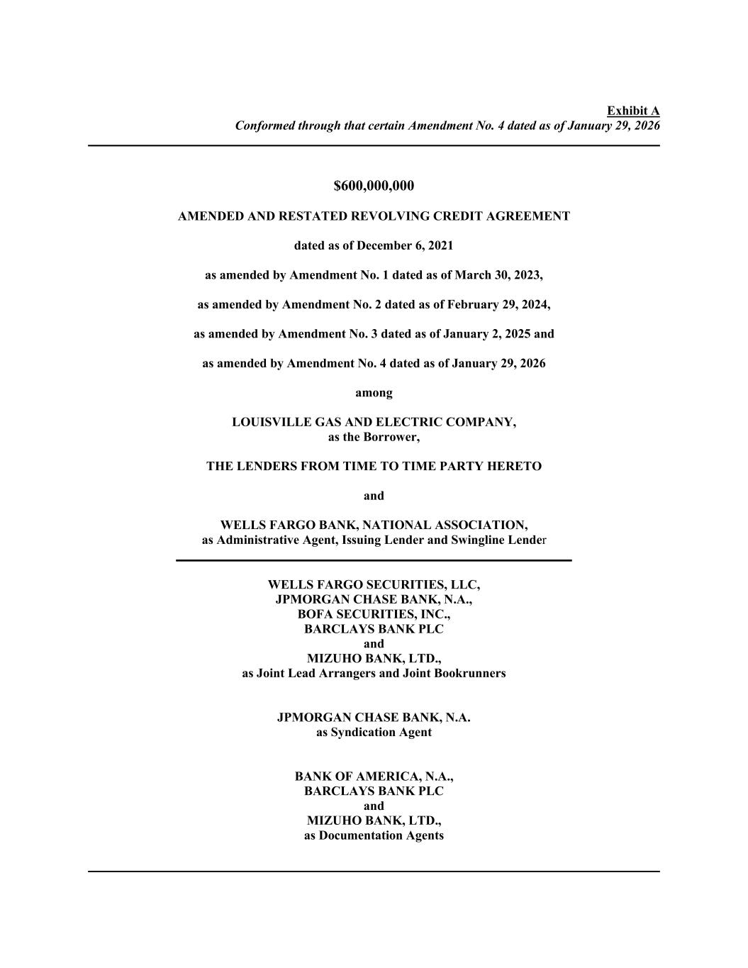 Exhibit A Conformed through that certain Amendment No. 4 dated as of January 29, 2026 $600,000,000 AMENDED AND RESTATED REVOLVING CREDIT AGREEMENT dated as of December 6, 2021 as amended by Amendment No. 1 dated as of March 30, 2023, as amended by Amendment No. 2 dated as of February 29, 2024, as amended by Amendment No. 3 dated as of January 2, 2025 and as amended by Amendment No. 4 dated as of January 29, 2026 among LOUISVILLE GAS AND ELECTRIC COMPANY, as the Borrower, THE LENDERS FROM TIME TO TIME PARTY HERETO and WELLS FARGO BANK, NATIONAL ASSOCIATION, as Administrative Agent, Issuing Lender and Swingline Lender WELLS FARGO SECURITIES, LLC, JPMORGAN CHASE BANK, N.A., BOFA SECURITIES, INC., BARCLAYS BANK PLC and MIZUHO BANK, LTD., as Joint Lead Arrangers and Joint Bookrunners JPMORGAN CHASE BANK, N.A. as Syndication Agent BANK OF AMERICA, N.A., BARCLAYS BANK PLC and MIZUHO BANK, LTD., as Documentation Agents
