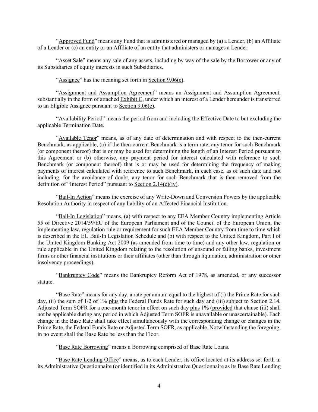4 “Approved Fund” means any Fund that is administered or managed by (a) a Lender, (b) an Affiliate of a Lender or (c) an entity or an Affiliate of an entity that administers or manages a Lender. “Asset Sale” means any sale of any assets, including by way of the sale by the Borrower or any of its Subsidiaries of equity interests in such Subsidiaries. “Assignee” has the meaning set forth in Section 9.06(c). “Assignment and Assumption Agreement” means an Assignment and Assumption Agreement, substantially in the form of attached Exhibit C, under which an interest of a Lender hereunder is transferred to an Eligible Assignee pursuant to Section 9.06(c). “Availability Period” means the period from and including the Effective Date to but excluding the applicable Termination Date. “Available Tenor” means, as of any date of determination and with respect to the then-current Benchmark, as applicable, (a) if the then-current Benchmark is a term rate, any tenor for such Benchmark (or component thereof) that is or may be used for determining the length of an Interest Period pursuant to this Agreement or (b) otherwise, any payment period for interest calculated with reference to such Benchmark (or component thereof) that is or may be used for determining the frequency of making payments of interest calculated with reference to such Benchmark, in each case, as of such date and not including, for the avoidance of doubt, any tenor for such Benchmark that is then-removed from the definition of “Interest Period” pursuant to Section 2.14(c)(iv). “Bail-In Action” means the exercise of any Write-Down and Conversion Powers by the applicable Resolution Authority in respect of any liability of an Affected Financial Institution. “Bail-In Legislation” means, (a) with respect to any EEA Member Country implementing Article 55 of Directive 2014/59/EU of the European Parliament and of the Council of the European Union, the implementing law, regulation rule or requirement for such EEA Member Country from time to time which is described in the EU Bail-In Legislation Schedule and (b) with respect to the United Kingdom, Part I of the United Kingdom Banking Act 2009 (as amended from time to time) and any other law, regulation or rule applicable in the United Kingdom relating to the resolution of unsound or failing banks, investment firms or other financial institutions or their affiliates (other than through liquidation, administration or other insolvency proceedings). “Bankruptcy Code” means the Bankruptcy Reform Act of 1978, as amended, or any successor statute. “Base Rate” means for any day, a rate per annum equal to the highest of (i) the Prime Rate for such day, (ii) the sum of 1/2 of 1% plus the Federal Funds Rate for such day and (iii) subject to Section 2.14, Adjusted Term SOFR for a one-month tenor in effect on such day plus 1% (provided that clause (iii) shall not be applicable during any period in which Adjusted Term SOFR is unavailable or unascertainable). Each change in the Base Rate shall take effect simultaneously with the corresponding change or changes in the Prime Rate, the Federal Funds Rate or Adjusted Term SOFR, as applicable. Notwithstanding the foregoing, in no event shall the Base Rate be less than the Floor. “Base Rate Borrowing” means a Borrowing comprised of Base Rate Loans. “Base Rate Lending Office” means, as to each Lender, its office located at its address set forth in its Administrative Questionnaire (or identified in its Administrative Questionnaire as its Base Rate Lending