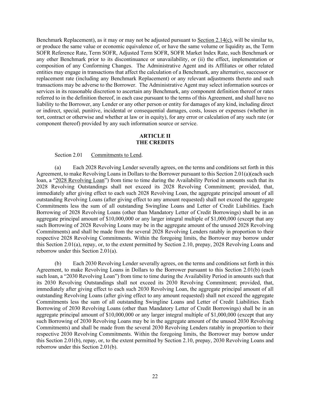 22 Benchmark Replacement), as it may or may not be adjusted pursuant to Section 2.14(c), will be similar to, or produce the same value or economic equivalence of, or have the same volume or liquidity as, the Term SOFR Reference Rate, Term SOFR, Adjusted Term SOFR, SOFR Market Index Rate, such Benchmark or any other Benchmark prior to its discontinuance or unavailability, or (ii) the effect, implementation or composition of any Conforming Changes. The Administrative Agent and its Affiliates or other related entities may engage in transactions that affect the calculation of a Benchmark, any alternative, successor or replacement rate (including any Benchmark Replacement) or any relevant adjustments thereto and such transactions may be adverse to the Borrower. The Administrative Agent may select information sources or services in its reasonable discretion to ascertain any Benchmark, any component definition thereof or rates referred to in the definition thereof, in each case pursuant to the terms of this Agreement, and shall have no liability to the Borrower, any Lender or any other person or entity for damages of any kind, including direct or indirect, special, punitive, incidental or consequential damages, costs, losses or expenses (whether in tort, contract or otherwise and whether at law or in equity), for any error or calculation of any such rate (or component thereof) provided by any such information source or service. ARTICLE II THE CREDITS Section 2.01 Commitments to Lend. (a) Each 2028 Revolving Lender severally agrees, on the terms and conditions set forth in this Agreement, to make Revolving Loans in Dollars to the Borrower pursuant to this Section 2.01(a)(each such loan, a “2028 Revolving Loan”) from time to time during the Availability Period in amounts such that its 2028 Revolving Outstandings shall not exceed its 2028 Revolving Commitment; provided, that, immediately after giving effect to each such 2028 Revolving Loan, the aggregate principal amount of all outstanding Revolving Loans (after giving effect to any amount requested) shall not exceed the aggregate Commitments less the sum of all outstanding Swingline Loans and Letter of Credit Liabilities. Each Borrowing of 2028 Revolving Loans (other than Mandatory Letter of Credit Borrowings) shall be in an aggregate principal amount of $10,000,000 or any larger integral multiple of $1,000,000 (except that any such Borrowing of 2028 Revolving Loans may be in the aggregate amount of the unused 2028 Revolving Commitments) and shall be made from the several 2028 Revolving Lenders ratably in proportion to their respective 2028 Revolving Commitments. Within the foregoing limits, the Borrower may borrow under this Section 2.01(a), repay, or, to the extent permitted by Section 2.10, prepay, 2028 Revolving Loans and reborrow under this Section 2.01(a). (b) Each 2030 Revolving Lender severally agrees, on the terms and conditions set forth in this Agreement, to make Revolving Loans in Dollars to the Borrower pursuant to this Section 2.01(b) (each such loan, a “2030 Revolving Loan”) from time to time during the Availability Period in amounts such that its 2030 Revolving Outstandings shall not exceed its 2030 Revolving Commitment; provided, that, immediately after giving effect to each such 2030 Revolving Loan, the aggregate principal amount of all outstanding Revolving Loans (after giving effect to any amount requested) shall not exceed the aggregate Commitments less the sum of all outstanding Swingline Loans and Letter of Credit Liabilities. Each Borrowing of 2030 Revolving Loans (other than Mandatory Letter of Credit Borrowings) shall be in an aggregate principal amount of $10,000,000 or any larger integral multiple of $1,000,000 (except that any such Borrowing of 2030 Revolving Loans may be in the aggregate amount of the unused 2030 Revolving Commitments) and shall be made from the several 2030 Revolving Lenders ratably in proportion to their respective 2030 Revolving Commitments. Within the foregoing limits, the Borrower may borrow under this Section 2.01(b), repay, or, to the extent permitted by Section 2.10, prepay, 2030 Revolving Loans and reborrow under this Section 2.01(b).