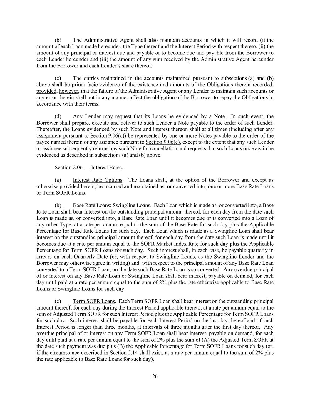 26 (b) The Administrative Agent shall also maintain accounts in which it will record (i) the amount of each Loan made hereunder, the Type thereof and the Interest Period with respect thereto, (ii) the amount of any principal or interest due and payable or to become due and payable from the Borrower to each Lender hereunder and (iii) the amount of any sum received by the Administrative Agent hereunder from the Borrower and each Lender’s share thereof. (c) The entries maintained in the accounts maintained pursuant to subsections (a) and (b) above shall be prima facie evidence of the existence and amounts of the Obligations therein recorded; provided, however, that the failure of the Administrative Agent or any Lender to maintain such accounts or any error therein shall not in any manner affect the obligation of the Borrower to repay the Obligations in accordance with their terms. (d) Any Lender may request that its Loans be evidenced by a Note. In such event, the Borrower shall prepare, execute and deliver to such Lender a Note payable to the order of such Lender. Thereafter, the Loans evidenced by such Note and interest thereon shall at all times (including after any assignment pursuant to Section 9.06(c)) be represented by one or more Notes payable to the order of the payee named therein or any assignee pursuant to Section 9.06(c), except to the extent that any such Lender or assignee subsequently returns any such Note for cancellation and requests that such Loans once again be evidenced as described in subsections (a) and (b) above. Section 2.06 Interest Rates. (a) Interest Rate Options. The Loans shall, at the option of the Borrower and except as otherwise provided herein, be incurred and maintained as, or converted into, one or more Base Rate Loans or Term SOFR Loans. (b) Base Rate Loans; Swingline Loans. Each Loan which is made as, or converted into, a Base Rate Loan shall bear interest on the outstanding principal amount thereof, for each day from the date such Loan is made as, or converted into, a Base Rate Loan until it becomes due or is converted into a Loan of any other Type, at a rate per annum equal to the sum of the Base Rate for such day plus the Applicable Percentage for Base Rate Loans for such day. Each Loan which is made as a Swingline Loan shall bear interest on the outstanding principal amount thereof, for each day from the date such Loan is made until it becomes due at a rate per annum equal to the SOFR Market Index Rate for such day plus the Applicable Percentage for Term SOFR Loans for such day. Such interest shall, in each case, be payable quarterly in arrears on each Quarterly Date (or, with respect to Swingline Loans, as the Swingline Lender and the Borrower may otherwise agree in writing) and, with respect to the principal amount of any Base Rate Loan converted to a Term SOFR Loan, on the date such Base Rate Loan is so converted. Any overdue principal of or interest on any Base Rate Loan or Swingline Loan shall bear interest, payable on demand, for each day until paid at a rate per annum equal to the sum of 2% plus the rate otherwise applicable to Base Rate Loans or Swingline Loans for such day. (c) Term SOFR Loans. Each Term SOFR Loan shall bear interest on the outstanding principal amount thereof, for each day during the Interest Period applicable thereto, at a rate per annum equal to the sum of Adjusted Term SOFR for such Interest Period plus the Applicable Percentage for Term SOFR Loans for such day. Such interest shall be payable for each Interest Period on the last day thereof and, if such Interest Period is longer than three months, at intervals of three months after the first day thereof. Any overdue principal of or interest on any Term SOFR Loan shall bear interest, payable on demand, for each day until paid at a rate per annum equal to the sum of 2% plus the sum of (A) the Adjusted Term SOFR at the date such payment was due plus (B) the Applicable Percentage for Term SOFR Loans for such day (or, if the circumstance described in Section 2.14 shall exist, at a rate per annum equal to the sum of 2% plus the rate applicable to Base Rate Loans for such day).