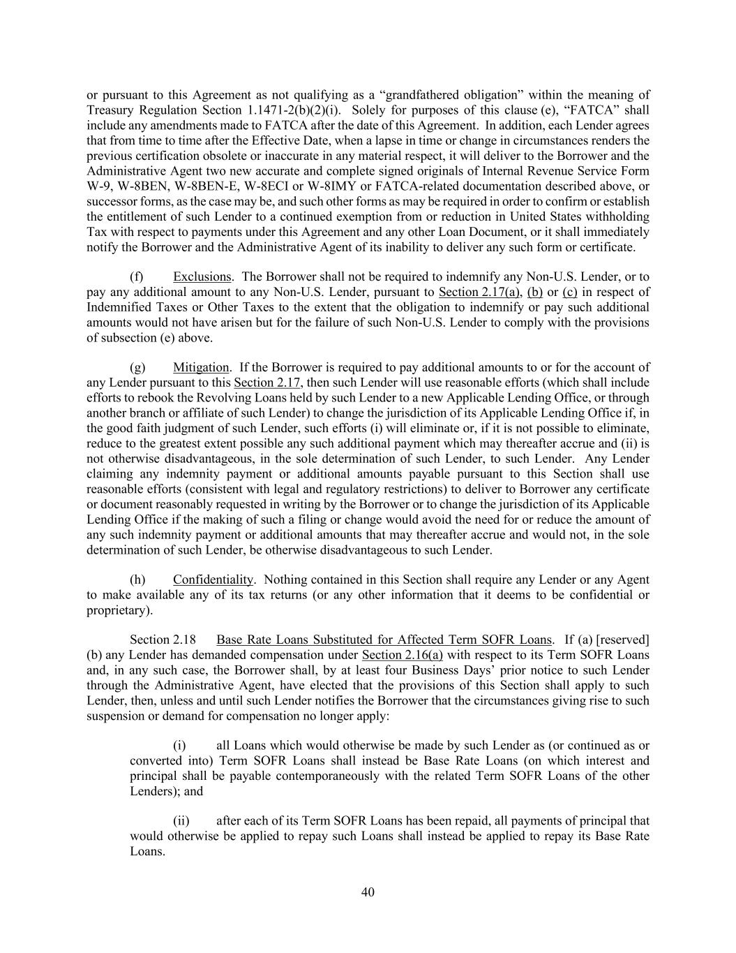40 or pursuant to this Agreement as not qualifying as a “grandfathered obligation” within the meaning of Treasury Regulation Section 1.1471-2(b)(2)(i). Solely for purposes of this clause (e), “FATCA” shall include any amendments made to FATCA after the date of this Agreement. In addition, each Lender agrees that from time to time after the Effective Date, when a lapse in time or change in circumstances renders the previous certification obsolete or inaccurate in any material respect, it will deliver to the Borrower and the Administrative Agent two new accurate and complete signed originals of Internal Revenue Service Form W-9, W-8BEN, W-8BEN-E, W-8ECI or W-8IMY or FATCA-related documentation described above, or successor forms, as the case may be, and such other forms as may be required in order to confirm or establish the entitlement of such Lender to a continued exemption from or reduction in United States withholding Tax with respect to payments under this Agreement and any other Loan Document, or it shall immediately notify the Borrower and the Administrative Agent of its inability to deliver any such form or certificate. (f) Exclusions. The Borrower shall not be required to indemnify any Non-U.S. Lender, or to pay any additional amount to any Non-U.S. Lender, pursuant to Section 2.17(a), (b) or (c) in respect of Indemnified Taxes or Other Taxes to the extent that the obligation to indemnify or pay such additional amounts would not have arisen but for the failure of such Non-U.S. Lender to comply with the provisions of subsection (e) above. (g) Mitigation. If the Borrower is required to pay additional amounts to or for the account of any Lender pursuant to this Section 2.17, then such Lender will use reasonable efforts (which shall include efforts to rebook the Revolving Loans held by such Lender to a new Applicable Lending Office, or through another branch or affiliate of such Lender) to change the jurisdiction of its Applicable Lending Office if, in the good faith judgment of such Lender, such efforts (i) will eliminate or, if it is not possible to eliminate, reduce to the greatest extent possible any such additional payment which may thereafter accrue and (ii) is not otherwise disadvantageous, in the sole determination of such Lender, to such Lender. Any Lender claiming any indemnity payment or additional amounts payable pursuant to this Section shall use reasonable efforts (consistent with legal and regulatory restrictions) to deliver to Borrower any certificate or document reasonably requested in writing by the Borrower or to change the jurisdiction of its Applicable Lending Office if the making of such a filing or change would avoid the need for or reduce the amount of any such indemnity payment or additional amounts that may thereafter accrue and would not, in the sole determination of such Lender, be otherwise disadvantageous to such Lender. (h) Confidentiality. Nothing contained in this Section shall require any Lender or any Agent to make available any of its tax returns (or any other information that it deems to be confidential or proprietary). Section 2.18 Base Rate Loans Substituted for Affected Term SOFR Loans. If (a) [reserved] (b) any Lender has demanded compensation under Section 2.16(a) with respect to its Term SOFR Loans and, in any such case, the Borrower shall, by at least four Business Days’ prior notice to such Lender through the Administrative Agent, have elected that the provisions of this Section shall apply to such Lender, then, unless and until such Lender notifies the Borrower that the circumstances giving rise to such suspension or demand for compensation no longer apply: (i) all Loans which would otherwise be made by such Lender as (or continued as or converted into) Term SOFR Loans shall instead be Base Rate Loans (on which interest and principal shall be payable contemporaneously with the related Term SOFR Loans of the other Lenders); and (ii) after each of its Term SOFR Loans has been repaid, all payments of principal that would otherwise be applied to repay such Loans shall instead be applied to repay its Base Rate Loans.