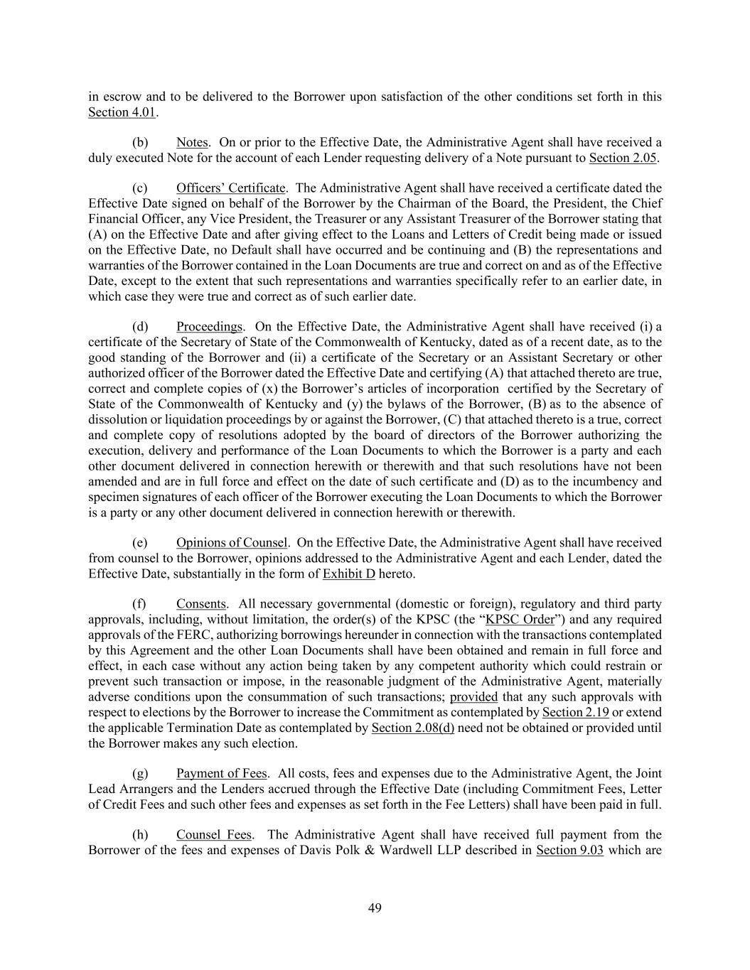 49 in escrow and to be delivered to the Borrower upon satisfaction of the other conditions set forth in this Section 4.01. (b) Notes. On or prior to the Effective Date, the Administrative Agent shall have received a duly executed Note for the account of each Lender requesting delivery of a Note pursuant to Section 2.05. (c) Officers’ Certificate. The Administrative Agent shall have received a certificate dated the Effective Date signed on behalf of the Borrower by the Chairman of the Board, the President, the Chief Financial Officer, any Vice President, the Treasurer or any Assistant Treasurer of the Borrower stating that (A) on the Effective Date and after giving effect to the Loans and Letters of Credit being made or issued on the Effective Date, no Default shall have occurred and be continuing and (B) the representations and warranties of the Borrower contained in the Loan Documents are true and correct on and as of the Effective Date, except to the extent that such representations and warranties specifically refer to an earlier date, in which case they were true and correct as of such earlier date. (d) Proceedings. On the Effective Date, the Administrative Agent shall have received (i) a certificate of the Secretary of State of the Commonwealth of Kentucky, dated as of a recent date, as to the good standing of the Borrower and (ii) a certificate of the Secretary or an Assistant Secretary or other authorized officer of the Borrower dated the Effective Date and certifying (A) that attached thereto are true, correct and complete copies of (x) the Borrower’s articles of incorporation certified by the Secretary of State of the Commonwealth of Kentucky and (y) the bylaws of the Borrower, (B) as to the absence of dissolution or liquidation proceedings by or against the Borrower, (C) that attached thereto is a true, correct and complete copy of resolutions adopted by the board of directors of the Borrower authorizing the execution, delivery and performance of the Loan Documents to which the Borrower is a party and each other document delivered in connection herewith or therewith and that such resolutions have not been amended and are in full force and effect on the date of such certificate and (D) as to the incumbency and specimen signatures of each officer of the Borrower executing the Loan Documents to which the Borrower is a party or any other document delivered in connection herewith or therewith. (e) Opinions of Counsel. On the Effective Date, the Administrative Agent shall have received from counsel to the Borrower, opinions addressed to the Administrative Agent and each Lender, dated the Effective Date, substantially in the form of Exhibit D hereto. (f) Consents. All necessary governmental (domestic or foreign), regulatory and third party approvals, including, without limitation, the order(s) of the KPSC (the “KPSC Order”) and any required approvals of the FERC, authorizing borrowings hereunder in connection with the transactions contemplated by this Agreement and the other Loan Documents shall have been obtained and remain in full force and effect, in each case without any action being taken by any competent authority which could restrain or prevent such transaction or impose, in the reasonable judgment of the Administrative Agent, materially adverse conditions upon the consummation of such transactions; provided that any such approvals with respect to elections by the Borrower to increase the Commitment as contemplated by Section 2.19 or extend the applicable Termination Date as contemplated by Section 2.08(d) need not be obtained or provided until the Borrower makes any such election. (g) Payment of Fees. All costs, fees and expenses due to the Administrative Agent, the Joint Lead Arrangers and the Lenders accrued through the Effective Date (including Commitment Fees, Letter of Credit Fees and such other fees and expenses as set forth in the Fee Letters) shall have been paid in full. (h) Counsel Fees. The Administrative Agent shall have received full payment from the Borrower of the fees and expenses of Davis Polk & Wardwell LLP described in Section 9.03 which are