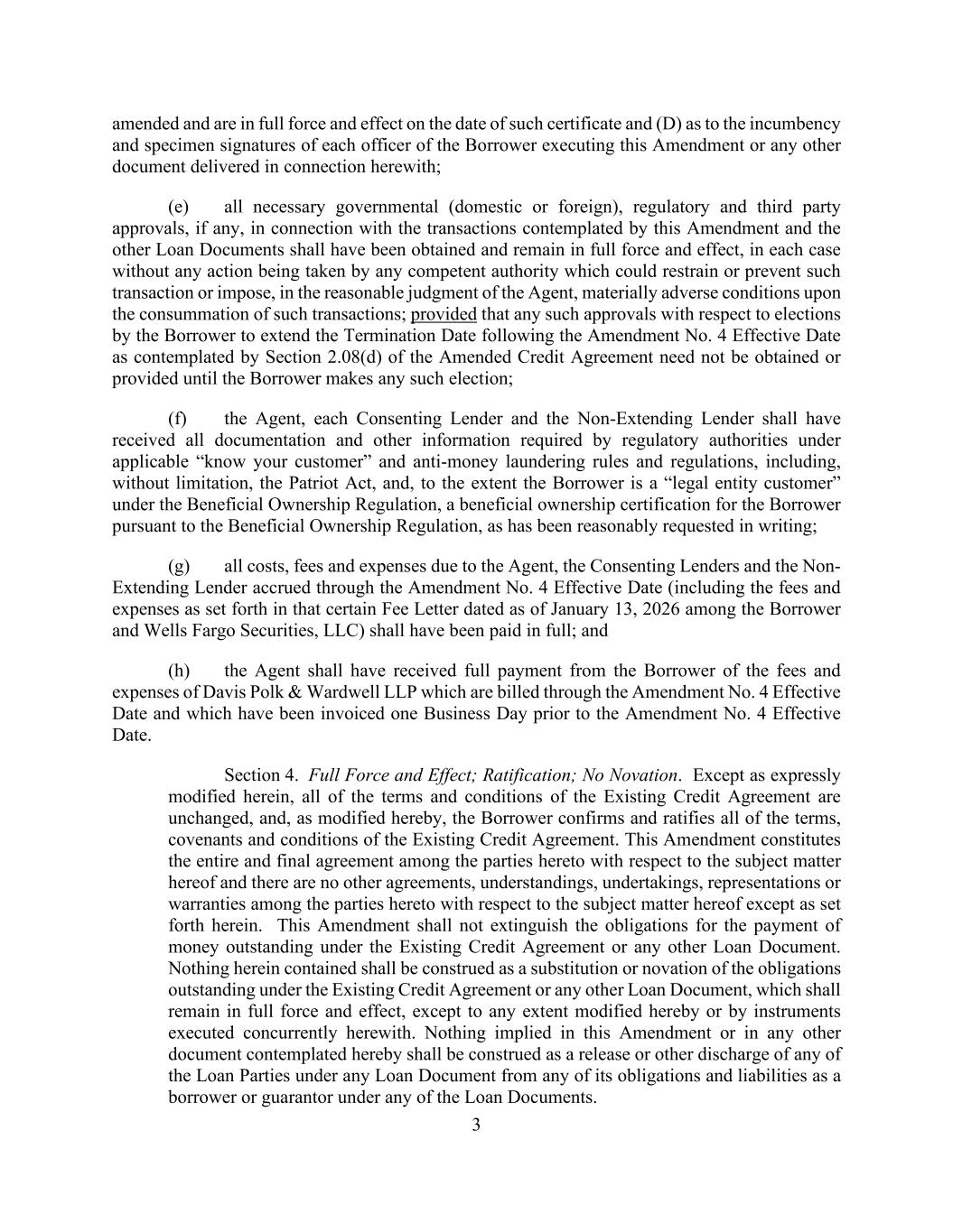 3 amended and are in full force and effect on the date of such certificate and (D) as to the incumbency and specimen signatures of each officer of the Borrower executing this Amendment or any other document delivered in connection herewith; (e) all necessary governmental (domestic or foreign), regulatory and third party approvals, if any, in connection with the transactions contemplated by this Amendment and the other Loan Documents shall have been obtained and remain in full force and effect, in each case without any action being taken by any competent authority which could restrain or prevent such transaction or impose, in the reasonable judgment of the Agent, materially adverse conditions upon the consummation of such transactions; provided that any such approvals with respect to elections by the Borrower to extend the Termination Date following the Amendment No. 4 Effective Date as contemplated by Section 2.08(d) of the Amended Credit Agreement need not be obtained or provided until the Borrower makes any such election; (f) the Agent, each Consenting Lender and the Non-Extending Lender shall have received all documentation and other information required by regulatory authorities under applicable “know your customer” and anti-money laundering rules and regulations, including, without limitation, the Patriot Act, and, to the extent the Borrower is a “legal entity customer” under the Beneficial Ownership Regulation, a beneficial ownership certification for the Borrower pursuant to the Beneficial Ownership Regulation, as has been reasonably requested in writing; (g) all costs, fees and expenses due to the Agent, the Consenting Lenders and the Non- Extending Lender accrued through the Amendment No. 4 Effective Date (including the fees and expenses as set forth in that certain Fee Letter dated as of January 13, 2026 among the Borrower and Wells Fargo Securities, LLC) shall have been paid in full; and (h) the Agent shall have received full payment from the Borrower of the fees and expenses of Davis Polk & Wardwell LLP which are billed through the Amendment No. 4 Effective Date and which have been invoiced one Business Day prior to the Amendment No. 4 Effective Date. Section 4. Full Force and Effect; Ratification; No Novation. Except as expressly modified herein, all of the terms and conditions of the Existing Credit Agreement are unchanged, and, as modified hereby, the Borrower confirms and ratifies all of the terms, covenants and conditions of the Existing Credit Agreement. This Amendment constitutes the entire and final agreement among the parties hereto with respect to the subject matter hereof and there are no other agreements, understandings, undertakings, representations or warranties among the parties hereto with respect to the subject matter hereof except as set forth herein. This Amendment shall not extinguish the obligations for the payment of money outstanding under the Existing Credit Agreement or any other Loan Document. Nothing herein contained shall be construed as a substitution or novation of the obligations outstanding under the Existing Credit Agreement or any other Loan Document, which shall remain in full force and effect, except to any extent modified hereby or by instruments executed concurrently herewith. Nothing implied in this Amendment or in any other document contemplated hereby shall be construed as a release or other discharge of any of the Loan Parties under any Loan Document from any of its obligations and liabilities as a borrower or guarantor under any of the Loan Documents.