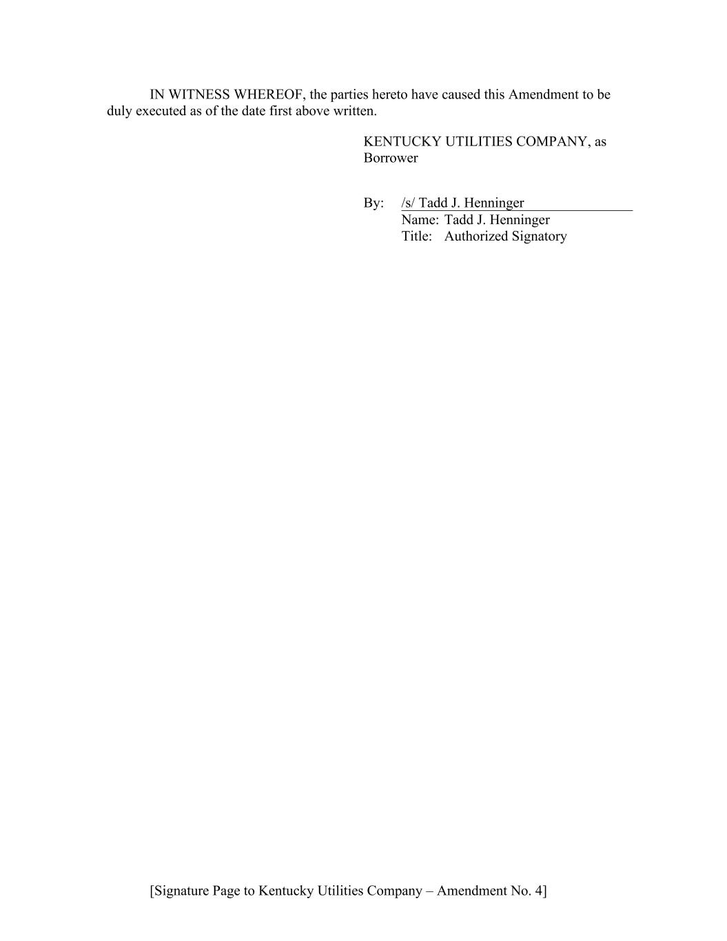 [Signature Page to Kentucky Utilities Company – Amendment No. 4] IN WITNESS WHEREOF, the parties hereto have caused this Amendment to be duly executed as of the date first above written. KENTUCKY UTILITIES COMPANY, as Borrower By: /s/ Tadd J. Henninger Name: Tadd J. Henninger Title: Authorized Signatory