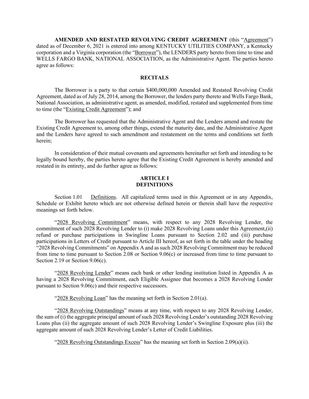 AMENDED AND RESTATED REVOLVING CREDIT AGREEMENT (this “Agreement”) dated as of December 6, 2021 is entered into among KENTUCKY UTILITIES COMPANY, a Kentucky corporation and a Virginia corporation (the “Borrower”), the LENDERS party hereto from time to time and WELLS FARGO BANK, NATIONAL ASSOCIATION, as the Administrative Agent. The parties hereto agree as follows: RECITALS The Borrower is a party to that certain $400,000,000 Amended and Restated Revolving Credit Agreement, dated as of July 28, 2014, among the Borrower, the lenders party thereto and Wells Fargo Bank, National Association, as administrative agent, as amended, modified, restated and supplemented from time to time (the “Existing Credit Agreement”); and The Borrower has requested that the Administrative Agent and the Lenders amend and restate the Existing Credit Agreement to, among other things, extend the maturity date, and the Administrative Agent and the Lenders have agreed to such amendment and restatement on the terms and conditions set forth herein; In consideration of their mutual covenants and agreements hereinafter set forth and intending to be legally bound hereby, the parties hereto agree that the Existing Credit Agreement is hereby amended and restated in its entirety, and do further agree as follows: ARTICLE I DEFINITIONS Section 1.01 Definitions. All capitalized terms used in this Agreement or in any Appendix, Schedule or Exhibit hereto which are not otherwise defined herein or therein shall have the respective meanings set forth below. “2028 Revolving Commitment” means, with respect to any 2028 Revolving Lender, the commitment of such 2028 Revolving Lender to (i) make 2028 Revolving Loans under this Agreement,(ii) refund or purchase participations in Swingline Loans pursuant to Section 2.02 and (iii) purchase participations in Letters of Credit pursuant to Article III hereof, as set forth in the table under the heading “2028 Revolving Commitments” on Appendix A and as such 2028 Revolving Commitment may be reduced from time to time pursuant to Section 2.08 or Section 9.06(c) or increased from time to time pursuant to Section 2.19 or Section 9.06(c). “2028 Revolving Lender” means each bank or other lending institution listed in Appendix A as having a 2028 Revolving Commitment, each Eligible Assignee that becomes a 2028 Revolving Lender pursuant to Section 9.06(c) and their respective successors. “2028 Revolving Loan” has the meaning set forth in Section 2.01(a). “2028 Revolving Outstandings” means at any time, with respect to any 2028 Revolving Lender, the sum of (i) the aggregate principal amount of such 2028 Revolving Lender’s outstanding 2028 Revolving Loans plus (ii) the aggregate amount of such 2028 Revolving Lender’s Swingline Exposure plus (iii) the aggregate amount of such 2028 Revolving Lender’s Letter of Credit Liabilities. “2028 Revolving Outstandings Excess” has the meaning set forth in Section 2.09(a)(ii).