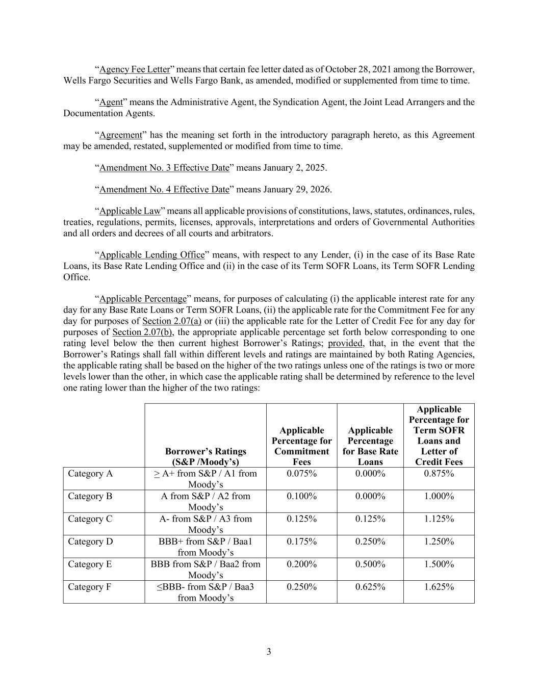 3 “Agency Fee Letter” means that certain fee letter dated as of October 28, 2021 among the Borrower, Wells Fargo Securities and Wells Fargo Bank, as amended, modified or supplemented from time to time. “Agent” means the Administrative Agent, the Syndication Agent, the Joint Lead Arrangers and the Documentation Agents. “Agreement” has the meaning set forth in the introductory paragraph hereto, as this Agreement may be amended, restated, supplemented or modified from time to time. “Amendment No. 3 Effective Date” means January 2, 2025. “Amendment No. 4 Effective Date” means January 29, 2026. “Applicable Law” means all applicable provisions of constitutions, laws, statutes, ordinances, rules, treaties, regulations, permits, licenses, approvals, interpretations and orders of Governmental Authorities and all orders and decrees of all courts and arbitrators. “Applicable Lending Office” means, with respect to any Lender, (i) in the case of its Base Rate Loans, its Base Rate Lending Office and (ii) in the case of its Term SOFR Loans, its Term SOFR Lending Office. “Applicable Percentage” means, for purposes of calculating (i) the applicable interest rate for any day for any Base Rate Loans or Term SOFR Loans, (ii) the applicable rate for the Commitment Fee for any day for purposes of Section 2.07(a) or (iii) the applicable rate for the Letter of Credit Fee for any day for purposes of Section 2.07(b), the appropriate applicable percentage set forth below corresponding to one rating level below the then current highest Borrower’s Ratings; provided, that, in the event that the Borrower’s Ratings shall fall within different levels and ratings are maintained by both Rating Agencies, the applicable rating shall be based on the higher of the two ratings unless one of the ratings is two or more levels lower than the other, in which case the applicable rating shall be determined by reference to the level one rating lower than the higher of the two ratings: Borrower’s Ratings (S&P /Moody’s) Applicable Percentage for Commitment Fees Applicable Percentage for Base Rate Loans Applicable Percentage for Term SOFR Loans and Letter of Credit Fees Category A > A+ from S&P / A1 from Moody’s 0.075% 0.000% 0.875% Category B A from S&P / A2 from Moody’s 0.100% 0.000% 1.000% Category C A- from S&P / A3 from Moody’s 0.125% 0.125% 1.125% Category D BBB+ from S&P / Baa1 from Moody’s 0.175% 0.250% 1.250% Category E BBB from S&P / Baa2 from Moody’s 0.200% 0.500% 1.500% Category F ≤BBB- from S&P / Baa3 from Moody’s 0.250% 0.625% 1.625%
