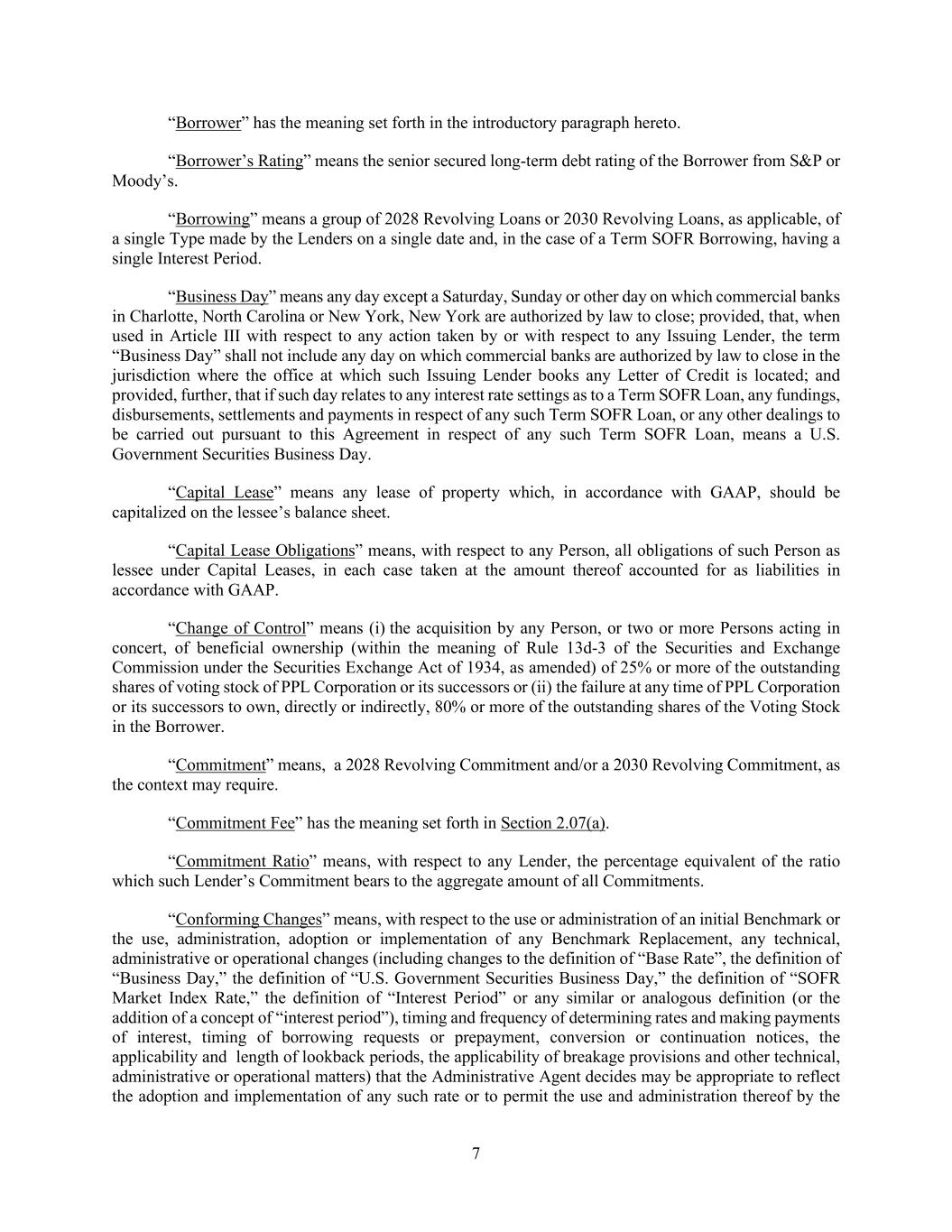7 “Borrower” has the meaning set forth in the introductory paragraph hereto. “Borrower’s Rating” means the senior secured long-term debt rating of the Borrower from S&P or Moody’s. “Borrowing” means a group of 2028 Revolving Loans or 2030 Revolving Loans, as applicable, of a single Type made by the Lenders on a single date and, in the case of a Term SOFR Borrowing, having a single Interest Period. “Business Day” means any day except a Saturday, Sunday or other day on which commercial banks in Charlotte, North Carolina or New York, New York are authorized by law to close; provided, that, when used in Article III with respect to any action taken by or with respect to any Issuing Lender, the term “Business Day” shall not include any day on which commercial banks are authorized by law to close in the jurisdiction where the office at which such Issuing Lender books any Letter of Credit is located; and provided, further, that if such day relates to any interest rate settings as to a Term SOFR Loan, any fundings, disbursements, settlements and payments in respect of any such Term SOFR Loan, or any other dealings to be carried out pursuant to this Agreement in respect of any such Term SOFR Loan, means a U.S. Government Securities Business Day. “Capital Lease” means any lease of property which, in accordance with GAAP, should be capitalized on the lessee’s balance sheet. “Capital Lease Obligations” means, with respect to any Person, all obligations of such Person as lessee under Capital Leases, in each case taken at the amount thereof accounted for as liabilities in accordance with GAAP. “Change of Control” means (i) the acquisition by any Person, or two or more Persons acting in concert, of beneficial ownership (within the meaning of Rule 13d-3 of the Securities and Exchange Commission under the Securities Exchange Act of 1934, as amended) of 25% or more of the outstanding shares of voting stock of PPL Corporation or its successors or (ii) the failure at any time of PPL Corporation or its successors to own, directly or indirectly, 80% or more of the outstanding shares of the Voting Stock in the Borrower. “Commitment” means, a 2028 Revolving Commitment and/or a 2030 Revolving Commitment, as the context may require. “Commitment Fee” has the meaning set forth in Section 2.07(a). “Commitment Ratio” means, with respect to any Lender, the percentage equivalent of the ratio which such Lender’s Commitment bears to the aggregate amount of all Commitments. “Conforming Changes” means, with respect to the use or administration of an initial Benchmark or the use, administration, adoption or implementation of any Benchmark Replacement, any technical, administrative or operational changes (including changes to the definition of “Base Rate”, the definition of “Business Day,” the definition of “U.S. Government Securities Business Day,” the definition of “SOFR Market Index Rate,” the definition of “Interest Period” or any similar or analogous definition (or the addition of a concept of “interest period”), timing and frequency of determining rates and making payments of interest, timing of borrowing requests or prepayment, conversion or continuation notices, the applicability and length of lookback periods, the applicability of breakage provisions and other technical, administrative or operational matters) that the Administrative Agent decides may be appropriate to reflect the adoption and implementation of any such rate or to permit the use and administration thereof by the