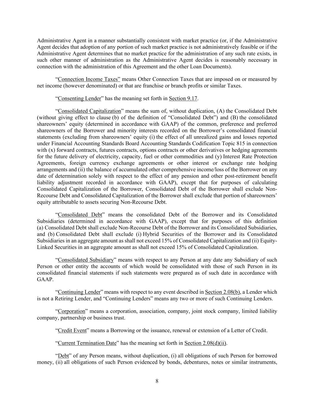 8 Administrative Agent in a manner substantially consistent with market practice (or, if the Administrative Agent decides that adoption of any portion of such market practice is not administratively feasible or if the Administrative Agent determines that no market practice for the administration of any such rate exists, in such other manner of administration as the Administrative Agent decides is reasonably necessary in connection with the administration of this Agreement and the other Loan Documents). “Connection Income Taxes” means Other Connection Taxes that are imposed on or measured by net income (however denominated) or that are franchise or branch profits or similar Taxes. “Consenting Lender” has the meaning set forth in Section 9.17. “Consolidated Capitalization” means the sum of, without duplication, (A) the Consolidated Debt (without giving effect to clause (b) of the definition of “Consolidated Debt”) and (B) the consolidated shareowners’ equity (determined in accordance with GAAP) of the common, preference and preferred shareowners of the Borrower and minority interests recorded on the Borrower’s consolidated financial statements (excluding from shareowners’ equity (i) the effect of all unrealized gains and losses reported under Financial Accounting Standards Board Accounting Standards Codification Topic 815 in connection with (x) forward contracts, futures contracts, options contracts or other derivatives or hedging agreements for the future delivery of electricity, capacity, fuel or other commodities and (y) Interest Rate Protection Agreements, foreign currency exchange agreements or other interest or exchange rate hedging arrangements and (ii) the balance of accumulated other comprehensive income/loss of the Borrower on any date of determination solely with respect to the effect of any pension and other post-retirement benefit liability adjustment recorded in accordance with GAAP), except that for purposes of calculating Consolidated Capitalization of the Borrower, Consolidated Debt of the Borrower shall exclude Non- Recourse Debt and Consolidated Capitalization of the Borrower shall exclude that portion of shareowners’ equity attributable to assets securing Non-Recourse Debt. “Consolidated Debt” means the consolidated Debt of the Borrower and its Consolidated Subsidiaries (determined in accordance with GAAP), except that for purposes of this definition (a) Consolidated Debt shall exclude Non-Recourse Debt of the Borrower and its Consolidated Subsidiaries, and (b) Consolidated Debt shall exclude (i) Hybrid Securities of the Borrower and its Consolidated Subsidiaries in an aggregate amount as shall not exceed 15% of Consolidated Capitalization and (ii) Equity- Linked Securities in an aggregate amount as shall not exceed 15% of Consolidated Capitalization. “Consolidated Subsidiary” means with respect to any Person at any date any Subsidiary of such Person or other entity the accounts of which would be consolidated with those of such Person in its consolidated financial statements if such statements were prepared as of such date in accordance with GAAP. “Continuing Lender” means with respect to any event described in Section 2.08(b), a Lender which is not a Retiring Lender, and “Continuing Lenders” means any two or more of such Continuing Lenders. “Corporation” means a corporation, association, company, joint stock company, limited liability company, partnership or business trust. “Credit Event” means a Borrowing or the issuance, renewal or extension of a Letter of Credit. “Current Termination Date” has the meaning set forth in Section 2.08(d)(ii). “Debt” of any Person means, without duplication, (i) all obligations of such Person for borrowed money, (ii) all obligations of such Person evidenced by bonds, debentures, notes or similar instruments,