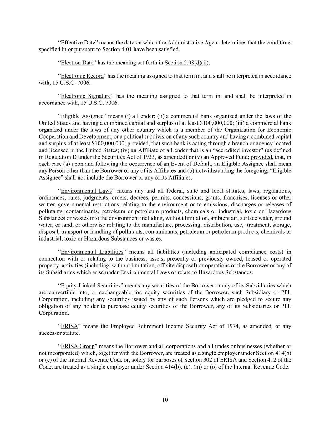 10 “Effective Date” means the date on which the Administrative Agent determines that the conditions specified in or pursuant to Section 4.01 have been satisfied. “Election Date” has the meaning set forth in Section 2.08(d)(ii). “Electronic Record” has the meaning assigned to that term in, and shall be interpreted in accordance with, 15 U.S.C. 7006. “Electronic Signature” has the meaning assigned to that term in, and shall be interpreted in accordance with, 15 U.S.C. 7006. “Eligible Assignee” means (i) a Lender; (ii) a commercial bank organized under the laws of the United States and having a combined capital and surplus of at least $100,000,000; (iii) a commercial bank organized under the laws of any other country which is a member of the Organization for Economic Cooperation and Development, or a political subdivision of any such country and having a combined capital and surplus of at least $100,000,000; provided, that such bank is acting through a branch or agency located and licensed in the United States; (iv) an Affiliate of a Lender that is an “accredited investor” (as defined in Regulation D under the Securities Act of 1933, as amended) or (v) an Approved Fund; provided, that, in each case (a) upon and following the occurrence of an Event of Default, an Eligible Assignee shall mean any Person other than the Borrower or any of its Affiliates and (b) notwithstanding the foregoing, “Eligible Assignee” shall not include the Borrower or any of its Affiliates. “Environmental Laws” means any and all federal, state and local statutes, laws, regulations, ordinances, rules, judgments, orders, decrees, permits, concessions, grants, franchises, licenses or other written governmental restrictions relating to the environment or to emissions, discharges or releases of pollutants, contaminants, petroleum or petroleum products, chemicals or industrial, toxic or Hazardous Substances or wastes into the environment including, without limitation, ambient air, surface water, ground water, or land, or otherwise relating to the manufacture, processing, distribution, use, treatment, storage, disposal, transport or handling of pollutants, contaminants, petroleum or petroleum products, chemicals or industrial, toxic or Hazardous Substances or wastes. “Environmental Liabilities” means all liabilities (including anticipated compliance costs) in connection with or relating to the business, assets, presently or previously owned, leased or operated property, activities (including, without limitation, off-site disposal) or operations of the Borrower or any of its Subsidiaries which arise under Environmental Laws or relate to Hazardous Substances. “Equity-Linked Securities” means any securities of the Borrower or any of its Subsidiaries which are convertible into, or exchangeable for, equity securities of the Borrower, such Subsidiary or PPL Corporation, including any securities issued by any of such Persons which are pledged to secure any obligation of any holder to purchase equity securities of the Borrower, any of its Subsidiaries or PPL Corporation. “ERISA” means the Employee Retirement Income Security Act of 1974, as amended, or any successor statute. “ERISA Group” means the Borrower and all corporations and all trades or businesses (whether or not incorporated) which, together with the Borrower, are treated as a single employer under Section 414(b) or (c) of the Internal Revenue Code or, solely for purposes of Section 302 of ERISA and Section 412 of the Code, are treated as a single employer under Section 414(b), (c), (m) or (o) of the Internal Revenue Code.