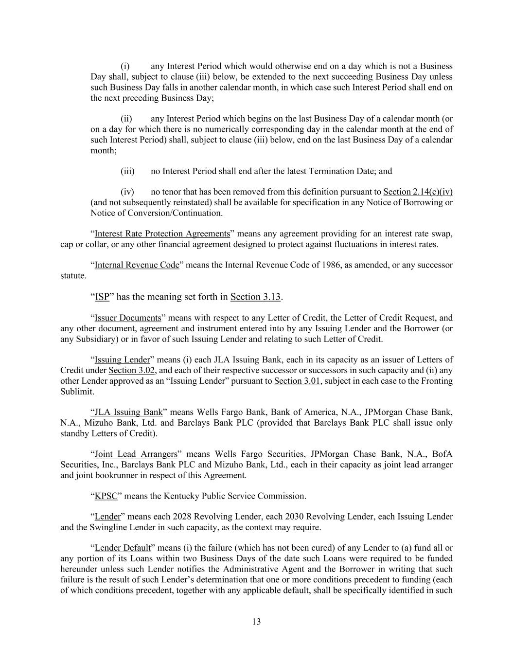 13 (i) any Interest Period which would otherwise end on a day which is not a Business Day shall, subject to clause (iii) below, be extended to the next succeeding Business Day unless such Business Day falls in another calendar month, in which case such Interest Period shall end on the next preceding Business Day; (ii) any Interest Period which begins on the last Business Day of a calendar month (or on a day for which there is no numerically corresponding day in the calendar month at the end of such Interest Period) shall, subject to clause (iii) below, end on the last Business Day of a calendar month; (iii) no Interest Period shall end after the latest Termination Date; and (iv) no tenor that has been removed from this definition pursuant to Section 2.14(c)(iv) (and not subsequently reinstated) shall be available for specification in any Notice of Borrowing or Notice of Conversion/Continuation. “Interest Rate Protection Agreements” means any agreement providing for an interest rate swap, cap or collar, or any other financial agreement designed to protect against fluctuations in interest rates. “Internal Revenue Code” means the Internal Revenue Code of 1986, as amended, or any successor statute. “ISP” has the meaning set forth in Section 3.13. “Issuer Documents” means with respect to any Letter of Credit, the Letter of Credit Request, and any other document, agreement and instrument entered into by any Issuing Lender and the Borrower (or any Subsidiary) or in favor of such Issuing Lender and relating to such Letter of Credit. “Issuing Lender” means (i) each JLA Issuing Bank, each in its capacity as an issuer of Letters of Credit under Section 3.02, and each of their respective successor or successors in such capacity and (ii) any other Lender approved as an “Issuing Lender” pursuant to Section 3.01, subject in each case to the Fronting Sublimit. “JLA Issuing Bank” means Wells Fargo Bank, Bank of America, N.A., JPMorgan Chase Bank, N.A., Mizuho Bank, Ltd. and Barclays Bank PLC (provided that Barclays Bank PLC shall issue only standby Letters of Credit). “Joint Lead Arrangers” means Wells Fargo Securities, JPMorgan Chase Bank, N.A., BofA Securities, Inc., Barclays Bank PLC and Mizuho Bank, Ltd., each in their capacity as joint lead arranger and joint bookrunner in respect of this Agreement. “KPSC” means the Kentucky Public Service Commission. “Lender” means each 2028 Revolving Lender, each 2030 Revolving Lender, each Issuing Lender and the Swingline Lender in such capacity, as the context may require. “Lender Default” means (i) the failure (which has not been cured) of any Lender to (a) fund all or any portion of its Loans within two Business Days of the date such Loans were required to be funded hereunder unless such Lender notifies the Administrative Agent and the Borrower in writing that such failure is the result of such Lender’s determination that one or more conditions precedent to funding (each of which conditions precedent, together with any applicable default, shall be specifically identified in such