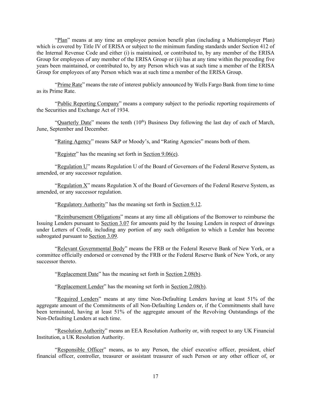 17 “Plan” means at any time an employee pension benefit plan (including a Multiemployer Plan) which is covered by Title IV of ERISA or subject to the minimum funding standards under Section 412 of the Internal Revenue Code and either (i) is maintained, or contributed to, by any member of the ERISA Group for employees of any member of the ERISA Group or (ii) has at any time within the preceding five years been maintained, or contributed to, by any Person which was at such time a member of the ERISA Group for employees of any Person which was at such time a member of the ERISA Group. “Prime Rate” means the rate of interest publicly announced by Wells Fargo Bank from time to time as its Prime Rate. “Public Reporting Company” means a company subject to the periodic reporting requirements of the Securities and Exchange Act of 1934. “Quarterly Date” means the tenth (10th) Business Day following the last day of each of March, June, September and December. “Rating Agency” means S&P or Moody’s, and “Rating Agencies” means both of them. “Register” has the meaning set forth in Section 9.06(e). “Regulation U” means Regulation U of the Board of Governors of the Federal Reserve System, as amended, or any successor regulation. “Regulation X” means Regulation X of the Board of Governors of the Federal Reserve System, as amended, or any successor regulation. “Regulatory Authority” has the meaning set forth in Section 9.12. “Reimbursement Obligations” means at any time all obligations of the Borrower to reimburse the Issuing Lenders pursuant to Section 3.07 for amounts paid by the Issuing Lenders in respect of drawings under Letters of Credit, including any portion of any such obligation to which a Lender has become subrogated pursuant to Section 3.09. “Relevant Governmental Body” means the FRB or the Federal Reserve Bank of New York, or a committee officially endorsed or convened by the FRB or the Federal Reserve Bank of New York, or any successor thereto. “Replacement Date” has the meaning set forth in Section 2.08(b). “Replacement Lender” has the meaning set forth in Section 2.08(b). “Required Lenders” means at any time Non-Defaulting Lenders having at least 51% of the aggregate amount of the Commitments of all Non-Defaulting Lenders or, if the Commitments shall have been terminated, having at least 51% of the aggregate amount of the Revolving Outstandings of the Non-Defaulting Lenders at such time. “Resolution Authority” means an EEA Resolution Authority or, with respect to any UK Financial Institution, a UK Resolution Authority. “Responsible Officer” means, as to any Person, the chief executive officer, president, chief financial officer, controller, treasurer or assistant treasurer of such Person or any other officer of, or