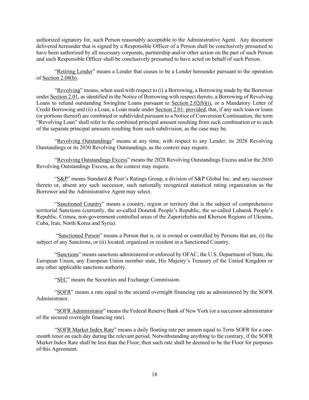 18 authorized signatory for, such Person reasonably acceptable to the Administrative Agent. Any document delivered hereunder that is signed by a Responsible Officer of a Person shall be conclusively presumed to have been authorized by all necessary corporate, partnership and/or other action on the part of such Person and such Responsible Officer shall be conclusively presumed to have acted on behalf of such Person. “Retiring Lender” means a Lender that ceases to be a Lender hereunder pursuant to the operation of Section 2.08(b). “Revolving” means, when used with respect to (i) a Borrowing, a Borrowing made by the Borrower under Section 2.01, as identified in the Notice of Borrowing with respect thereto, a Borrowing of Revolving Loans to refund outstanding Swingline Loans pursuant to Section 2.02(b)(i), or a Mandatory Letter of Credit Borrowing and (ii) a Loan, a Loan made under Section 2.01; provided, that, if any such loan or loans (or portions thereof) are combined or subdivided pursuant to a Notice of Conversion/Continuation, the term “Revolving Loan” shall refer to the combined principal amount resulting from such combination or to each of the separate principal amounts resulting from such subdivision, as the case may be. “Revolving Outstandings” means at any time, with respect to any Lender, its 2028 Revolving Outstandings or its 2030 Revolving Outstandings, as the context may require. “Revolving Outstandings Excess” means the 2028 Revolving Outstandings Excess and/or the 2030 Revolving Outstandings Excess, as the context may require. “S&P” means Standard & Poor’s Ratings Group, a division of S&P Global Inc. and any successor thereto or, absent any such successor, such nationally recognized statistical rating organization as the Borrower and the Administrative Agent may select. “Sanctioned Country” means a country, region or territory that is the subject of comprehensive territorial Sanctions (currently, the so-called Donetsk People’s Republic, the so-called Luhansk People’s Republic, Crimea, non-government controlled areas of the Zaporizhzhia and Kherson Regions of Ukraine, Cuba, Iran, North Korea and Syria). “Sanctioned Person” means a Person that is, or is owned or controlled by Persons that are, (i) the subject of any Sanctions, or (ii) located, organized or resident in a Sanctioned Country. “Sanctions” means sanctions administered or enforced by OFAC, the U.S. Department of State, the European Union, any European Union member state, His Majesty’s Treasury of the United Kingdom or any other applicable sanctions authority. “SEC” means the Securities and Exchange Commission. “SOFR” means a rate equal to the secured overnight financing rate as administered by the SOFR Administrator. “SOFR Administrator” means the Federal Reserve Bank of New York (or a successor administrator of the secured overnight financing rate). “SOFR Market Index Rate” means a daily floating rate per annum equal to Term SOFR for a one- month tenor on each day during the relevant period. Notwithstanding anything to the contrary, if the SOFR Market Index Rate shall be less than the Floor, then such rate shall be deemed to be the Floor for purposes of this Agreement.