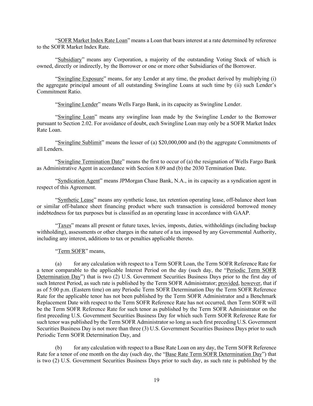 19 “SOFR Market Index Rate Loan” means a Loan that bears interest at a rate determined by reference to the SOFR Market Index Rate. “Subsidiary” means any Corporation, a majority of the outstanding Voting Stock of which is owned, directly or indirectly, by the Borrower or one or more other Subsidiaries of the Borrower. “Swingline Exposure” means, for any Lender at any time, the product derived by multiplying (i) the aggregate principal amount of all outstanding Swingline Loans at such time by (ii) such Lender’s Commitment Ratio. “Swingline Lender” means Wells Fargo Bank, in its capacity as Swingline Lender. “Swingline Loan” means any swingline loan made by the Swingline Lender to the Borrower pursuant to Section 2.02. For avoidance of doubt, each Swingline Loan may only be a SOFR Market Index Rate Loan. “Swingline Sublimit” means the lesser of (a) $20,000,000 and (b) the aggregate Commitments of all Lenders. “Swingline Termination Date” means the first to occur of (a) the resignation of Wells Fargo Bank as Administrative Agent in accordance with Section 8.09 and (b) the 2030 Termination Date. “Syndication Agent” means JPMorgan Chase Bank, N.A., in its capacity as a syndication agent in respect of this Agreement. “Synthetic Lease” means any synthetic lease, tax retention operating lease, off-balance sheet loan or similar off-balance sheet financing product where such transaction is considered borrowed money indebtedness for tax purposes but is classified as an operating lease in accordance with GAAP. “Taxes” means all present or future taxes, levies, imposts, duties, withholdings (including backup withholding), assessments or other charges in the nature of a tax imposed by any Governmental Authority, including any interest, additions to tax or penalties applicable thereto. “Term SOFR” means, (a) for any calculation with respect to a Term SOFR Loan, the Term SOFR Reference Rate for a tenor comparable to the applicable Interest Period on the day (such day, the “Periodic Term SOFR Determination Day”) that is two (2) U.S. Government Securities Business Days prior to the first day of such Interest Period, as such rate is published by the Term SOFR Administrator; provided, however, that if as of 5:00 p.m. (Eastern time) on any Periodic Term SOFR Determination Day the Term SOFR Reference Rate for the applicable tenor has not been published by the Term SOFR Administrator and a Benchmark Replacement Date with respect to the Term SOFR Reference Rate has not occurred, then Term SOFR will be the Term SOFR Reference Rate for such tenor as published by the Term SOFR Administrator on the first preceding U.S. Government Securities Business Day for which such Term SOFR Reference Rate for such tenor was published by the Term SOFR Administrator so long as such first preceding U.S. Government Securities Business Day is not more than three (3) U.S. Government Securities Business Days prior to such Periodic Term SOFR Determination Day, and (b) for any calculation with respect to a Base Rate Loan on any day, the Term SOFR Reference Rate for a tenor of one month on the day (such day, the “Base Rate Term SOFR Determination Day”) that is two (2) U.S. Government Securities Business Days prior to such day, as such rate is published by the