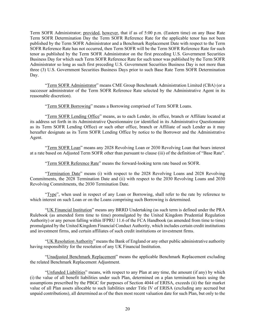 20 Term SOFR Administrator; provided, however, that if as of 5:00 p.m. (Eastern time) on any Base Rate Term SOFR Determination Day the Term SOFR Reference Rate for the applicable tenor has not been published by the Term SOFR Administrator and a Benchmark Replacement Date with respect to the Term SOFR Reference Rate has not occurred, then Term SOFR will be the Term SOFR Reference Rate for such tenor as published by the Term SOFR Administrator on the first preceding U.S. Government Securities Business Day for which such Term SOFR Reference Rate for such tenor was published by the Term SOFR Administrator so long as such first preceding U.S. Government Securities Business Day is not more than three (3) U.S. Government Securities Business Days prior to such Base Rate Term SOFR Determination Day. “Term SOFR Administrator” means CME Group Benchmark Administration Limited (CBA) (or a successor administrator of the Term SOFR Reference Rate selected by the Administrative Agent in its reasonable discretion). “Term SOFR Borrowing” means a Borrowing comprised of Term SOFR Loans. “Term SOFR Lending Office” means, as to each Lender, its office, branch or Affiliate located at its address set forth in its Administrative Questionnaire (or identified in its Administrative Questionnaire as its Term SOFR Lending Office) or such other office, branch or Affiliate of such Lender as it may hereafter designate as its Term SOFR Lending Office by notice to the Borrower and the Administrative Agent. “Term SOFR Loan” means any 2028 Revolving Loan or 2030 Revolving Loan that bears interest at a rate based on Adjusted Term SOFR other than pursuant to clause (iii) of the definition of “Base Rate”. “Term SOFR Reference Rate” means the forward-looking term rate based on SOFR. “Termination Date” means (i) with respect to the 2028 Revolving Loans and 2028 Revolving Commitments, the 2028 Termination Date and (ii) with respect to the 2030 Revolving Loans and 2030 Revolving Commitments, the 2030 Termination Date. “Type”, when used in respect of any Loan or Borrowing, shall refer to the rate by reference to which interest on such Loan or on the Loans comprising such Borrowing is determined. “UK Financial Institution” means any BRRD Undertaking (as such term is defined under the PRA Rulebook (as amended form time to time) promulgated by the United Kingdom Prudential Regulation Authority) or any person falling within IFPRU 11.6 of the FCA Handbook (as amended from time to time) promulgated by the United Kingdom Financial Conduct Authority, which includes certain credit institutions and investment firms, and certain affiliates of such credit institutions or investment firms. “UK Resolution Authority” means the Bank of England or any other public administrative authority having responsibility for the resolution of any UK Financial Institution. “Unadjusted Benchmark Replacement” means the applicable Benchmark Replacement excluding the related Benchmark Replacement Adjustment. “Unfunded Liabilities” means, with respect to any Plan at any time, the amount (if any) by which (i) the value of all benefit liabilities under such Plan, determined on a plan termination basis using the assumptions prescribed by the PBGC for purposes of Section 4044 of ERISA, exceeds (ii) the fair market value of all Plan assets allocable to such liabilities under Title IV of ERISA (excluding any accrued but unpaid contributions), all determined as of the then most recent valuation date for such Plan, but only to the