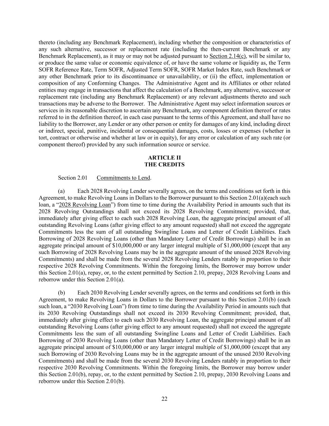 22 thereto (including any Benchmark Replacement), including whether the composition or characteristics of any such alternative, successor or replacement rate (including the then-current Benchmark or any Benchmark Replacement), as it may or may not be adjusted pursuant to Section 2.14(c), will be similar to, or produce the same value or economic equivalence of, or have the same volume or liquidity as, the Term SOFR Reference Rate, Term SOFR, Adjusted Term SOFR, SOFR Market Index Rate, such Benchmark or any other Benchmark prior to its discontinuance or unavailability, or (ii) the effect, implementation or composition of any Conforming Changes. The Administrative Agent and its Affiliates or other related entities may engage in transactions that affect the calculation of a Benchmark, any alternative, successor or replacement rate (including any Benchmark Replacement) or any relevant adjustments thereto and such transactions may be adverse to the Borrower. The Administrative Agent may select information sources or services in its reasonable discretion to ascertain any Benchmark, any component definition thereof or rates referred to in the definition thereof, in each case pursuant to the terms of this Agreement, and shall have no liability to the Borrower, any Lender or any other person or entity for damages of any kind, including direct or indirect, special, punitive, incidental or consequential damages, costs, losses or expenses (whether in tort, contract or otherwise and whether at law or in equity), for any error or calculation of any such rate (or component thereof) provided by any such information source or service. ARTICLE II THE CREDITS Section 2.01 Commitments to Lend. (a) Each 2028 Revolving Lender severally agrees, on the terms and conditions set forth in this Agreement, to make Revolving Loans in Dollars to the Borrower pursuant to this Section 2.01(a)(each such loan, a “2028 Revolving Loan”) from time to time during the Availability Period in amounts such that its 2028 Revolving Outstandings shall not exceed its 2028 Revolving Commitment; provided, that, immediately after giving effect to each such 2028 Revolving Loan, the aggregate principal amount of all outstanding Revolving Loans (after giving effect to any amount requested) shall not exceed the aggregate Commitments less the sum of all outstanding Swingline Loans and Letter of Credit Liabilities. Each Borrowing of 2028 Revolving Loans (other than Mandatory Letter of Credit Borrowings) shall be in an aggregate principal amount of $10,000,000 or any larger integral multiple of $1,000,000 (except that any such Borrowing of 2028 Revolving Loans may be in the aggregate amount of the unused 2028 Revolving Commitments) and shall be made from the several 2028 Revolving Lenders ratably in proportion to their respective 2028 Revolving Commitments. Within the foregoing limits, the Borrower may borrow under this Section 2.01(a), repay, or, to the extent permitted by Section 2.10, prepay, 2028 Revolving Loans and reborrow under this Section 2.01(a). (b) Each 2030 Revolving Lender severally agrees, on the terms and conditions set forth in this Agreement, to make Revolving Loans in Dollars to the Borrower pursuant to this Section 2.01(b) (each such loan, a “2030 Revolving Loan”) from time to time during the Availability Period in amounts such that its 2030 Revolving Outstandings shall not exceed its 2030 Revolving Commitment; provided, that, immediately after giving effect to each such 2030 Revolving Loan, the aggregate principal amount of all outstanding Revolving Loans (after giving effect to any amount requested) shall not exceed the aggregate Commitments less the sum of all outstanding Swingline Loans and Letter of Credit Liabilities. Each Borrowing of 2030 Revolving Loans (other than Mandatory Letter of Credit Borrowings) shall be in an aggregate principal amount of $10,000,000 or any larger integral multiple of $1,000,000 (except that any such Borrowing of 2030 Revolving Loans may be in the aggregate amount of the unused 2030 Revolving Commitments) and shall be made from the several 2030 Revolving Lenders ratably in proportion to their respective 2030 Revolving Commitments. Within the foregoing limits, the Borrower may borrow under this Section 2.01(b), repay, or, to the extent permitted by Section 2.10, prepay, 2030 Revolving Loans and reborrow under this Section 2.01(b).