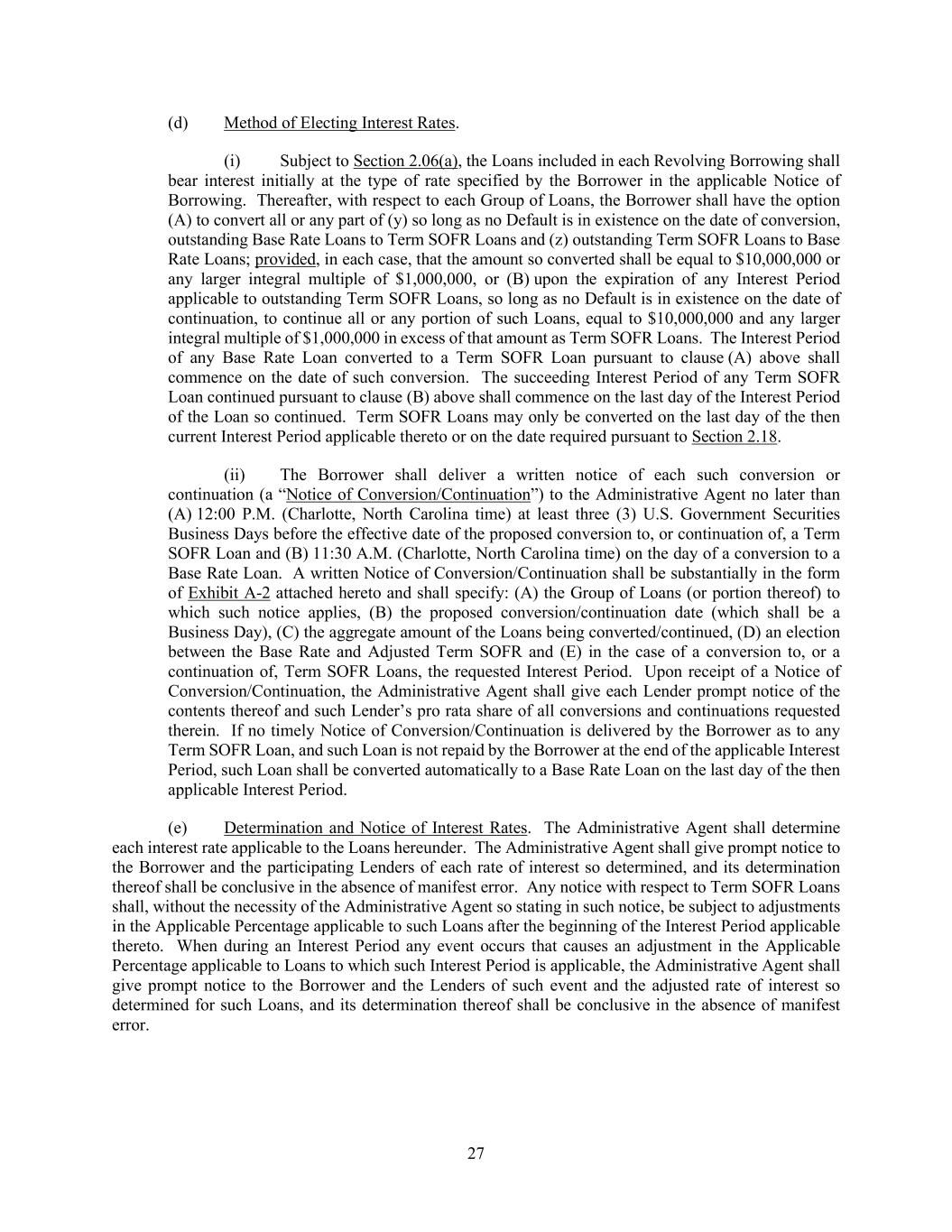 27 (d) Method of Electing Interest Rates. (i) Subject to Section 2.06(a), the Loans included in each Revolving Borrowing shall bear interest initially at the type of rate specified by the Borrower in the applicable Notice of Borrowing. Thereafter, with respect to each Group of Loans, the Borrower shall have the option (A) to convert all or any part of (y) so long as no Default is in existence on the date of conversion, outstanding Base Rate Loans to Term SOFR Loans and (z) outstanding Term SOFR Loans to Base Rate Loans; provided, in each case, that the amount so converted shall be equal to $10,000,000 or any larger integral multiple of $1,000,000, or (B) upon the expiration of any Interest Period applicable to outstanding Term SOFR Loans, so long as no Default is in existence on the date of continuation, to continue all or any portion of such Loans, equal to $10,000,000 and any larger integral multiple of $1,000,000 in excess of that amount as Term SOFR Loans. The Interest Period of any Base Rate Loan converted to a Term SOFR Loan pursuant to clause (A) above shall commence on the date of such conversion. The succeeding Interest Period of any Term SOFR Loan continued pursuant to clause (B) above shall commence on the last day of the Interest Period of the Loan so continued. Term SOFR Loans may only be converted on the last day of the then current Interest Period applicable thereto or on the date required pursuant to Section 2.18. (ii) The Borrower shall deliver a written notice of each such conversion or continuation (a “Notice of Conversion/Continuation”) to the Administrative Agent no later than (A) 12:00 P.M. (Charlotte, North Carolina time) at least three (3) U.S. Government Securities Business Days before the effective date of the proposed conversion to, or continuation of, a Term SOFR Loan and (B) 11:30 A.M. (Charlotte, North Carolina time) on the day of a conversion to a Base Rate Loan. A written Notice of Conversion/Continuation shall be substantially in the form of Exhibit A-2 attached hereto and shall specify: (A) the Group of Loans (or portion thereof) to which such notice applies, (B) the proposed conversion/continuation date (which shall be a Business Day), (C) the aggregate amount of the Loans being converted/continued, (D) an election between the Base Rate and Adjusted Term SOFR and (E) in the case of a conversion to, or a continuation of, Term SOFR Loans, the requested Interest Period. Upon receipt of a Notice of Conversion/Continuation, the Administrative Agent shall give each Lender prompt notice of the contents thereof and such Lender’s pro rata share of all conversions and continuations requested therein. If no timely Notice of Conversion/Continuation is delivered by the Borrower as to any Term SOFR Loan, and such Loan is not repaid by the Borrower at the end of the applicable Interest Period, such Loan shall be converted automatically to a Base Rate Loan on the last day of the then applicable Interest Period. (e) Determination and Notice of Interest Rates. The Administrative Agent shall determine each interest rate applicable to the Loans hereunder. The Administrative Agent shall give prompt notice to the Borrower and the participating Lenders of each rate of interest so determined, and its determination thereof shall be conclusive in the absence of manifest error. Any notice with respect to Term SOFR Loans shall, without the necessity of the Administrative Agent so stating in such notice, be subject to adjustments in the Applicable Percentage applicable to such Loans after the beginning of the Interest Period applicable thereto. When during an Interest Period any event occurs that causes an adjustment in the Applicable Percentage applicable to Loans to which such Interest Period is applicable, the Administrative Agent shall give prompt notice to the Borrower and the Lenders of such event and the adjusted rate of interest so determined for such Loans, and its determination thereof shall be conclusive in the absence of manifest error.