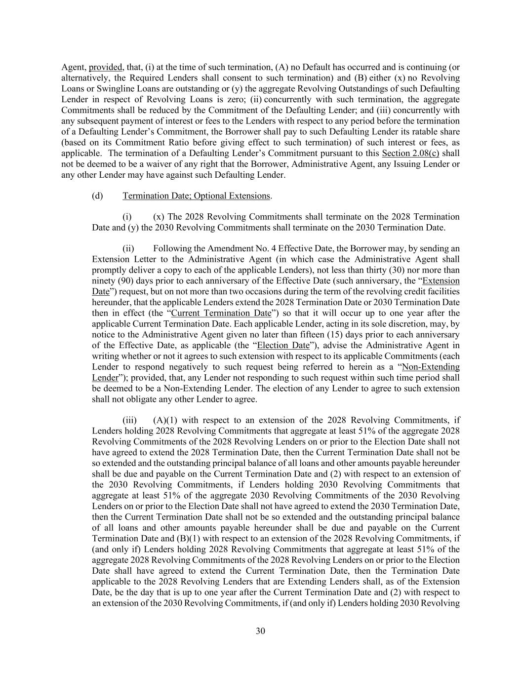 30 Agent, provided, that, (i) at the time of such termination, (A) no Default has occurred and is continuing (or alternatively, the Required Lenders shall consent to such termination) and (B) either (x) no Revolving Loans or Swingline Loans are outstanding or (y) the aggregate Revolving Outstandings of such Defaulting Lender in respect of Revolving Loans is zero; (ii) concurrently with such termination, the aggregate Commitments shall be reduced by the Commitment of the Defaulting Lender; and (iii) concurrently with any subsequent payment of interest or fees to the Lenders with respect to any period before the termination of a Defaulting Lender’s Commitment, the Borrower shall pay to such Defaulting Lender its ratable share (based on its Commitment Ratio before giving effect to such termination) of such interest or fees, as applicable. The termination of a Defaulting Lender’s Commitment pursuant to this Section 2.08(c) shall not be deemed to be a waiver of any right that the Borrower, Administrative Agent, any Issuing Lender or any other Lender may have against such Defaulting Lender. (d) Termination Date; Optional Extensions. (i) (x) The 2028 Revolving Commitments shall terminate on the 2028 Termination Date and (y) the 2030 Revolving Commitments shall terminate on the 2030 Termination Date. (ii) Following the Amendment No. 4 Effective Date, the Borrower may, by sending an Extension Letter to the Administrative Agent (in which case the Administrative Agent shall promptly deliver a copy to each of the applicable Lenders), not less than thirty (30) nor more than ninety (90) days prior to each anniversary of the Effective Date (such anniversary, the “Extension Date”) request, but on not more than two occasions during the term of the revolving credit facilities hereunder, that the applicable Lenders extend the 2028 Termination Date or 2030 Termination Date then in effect (the “Current Termination Date”) so that it will occur up to one year after the applicable Current Termination Date. Each applicable Lender, acting in its sole discretion, may, by notice to the Administrative Agent given no later than fifteen (15) days prior to each anniversary of the Effective Date, as applicable (the “Election Date”), advise the Administrative Agent in writing whether or not it agrees to such extension with respect to its applicable Commitments (each Lender to respond negatively to such request being referred to herein as a “Non-Extending Lender”); provided, that, any Lender not responding to such request within such time period shall be deemed to be a Non-Extending Lender. The election of any Lender to agree to such extension shall not obligate any other Lender to agree. (iii) (A)(1) with respect to an extension of the 2028 Revolving Commitments, if Lenders holding 2028 Revolving Commitments that aggregate at least 51% of the aggregate 2028 Revolving Commitments of the 2028 Revolving Lenders on or prior to the Election Date shall not have agreed to extend the 2028 Termination Date, then the Current Termination Date shall not be so extended and the outstanding principal balance of all loans and other amounts payable hereunder shall be due and payable on the Current Termination Date and (2) with respect to an extension of the 2030 Revolving Commitments, if Lenders holding 2030 Revolving Commitments that aggregate at least 51% of the aggregate 2030 Revolving Commitments of the 2030 Revolving Lenders on or prior to the Election Date shall not have agreed to extend the 2030 Termination Date, then the Current Termination Date shall not be so extended and the outstanding principal balance of all loans and other amounts payable hereunder shall be due and payable on the Current Termination Date and (B)(1) with respect to an extension of the 2028 Revolving Commitments, if (and only if) Lenders holding 2028 Revolving Commitments that aggregate at least 51% of the aggregate 2028 Revolving Commitments of the 2028 Revolving Lenders on or prior to the Election Date shall have agreed to extend the Current Termination Date, then the Termination Date applicable to the 2028 Revolving Lenders that are Extending Lenders shall, as of the Extension Date, be the day that is up to one year after the Current Termination Date and (2) with respect to an extension of the 2030 Revolving Commitments, if (and only if) Lenders holding 2030 Revolving