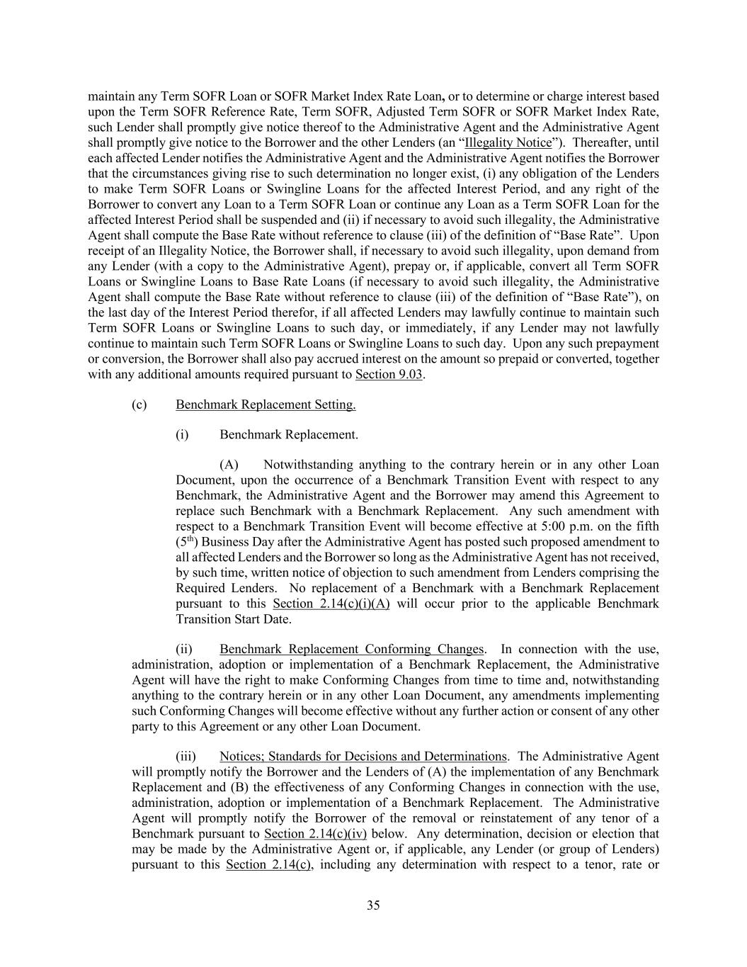 35 maintain any Term SOFR Loan or SOFR Market Index Rate Loan, or to determine or charge interest based upon the Term SOFR Reference Rate, Term SOFR, Adjusted Term SOFR or SOFR Market Index Rate, such Lender shall promptly give notice thereof to the Administrative Agent and the Administrative Agent shall promptly give notice to the Borrower and the other Lenders (an “Illegality Notice”). Thereafter, until each affected Lender notifies the Administrative Agent and the Administrative Agent notifies the Borrower that the circumstances giving rise to such determination no longer exist, (i) any obligation of the Lenders to make Term SOFR Loans or Swingline Loans for the affected Interest Period, and any right of the Borrower to convert any Loan to a Term SOFR Loan or continue any Loan as a Term SOFR Loan for the affected Interest Period shall be suspended and (ii) if necessary to avoid such illegality, the Administrative Agent shall compute the Base Rate without reference to clause (iii) of the definition of “Base Rate”. Upon receipt of an Illegality Notice, the Borrower shall, if necessary to avoid such illegality, upon demand from any Lender (with a copy to the Administrative Agent), prepay or, if applicable, convert all Term SOFR Loans or Swingline Loans to Base Rate Loans (if necessary to avoid such illegality, the Administrative Agent shall compute the Base Rate without reference to clause (iii) of the definition of “Base Rate”), on the last day of the Interest Period therefor, if all affected Lenders may lawfully continue to maintain such Term SOFR Loans or Swingline Loans to such day, or immediately, if any Lender may not lawfully continue to maintain such Term SOFR Loans or Swingline Loans to such day. Upon any such prepayment or conversion, the Borrower shall also pay accrued interest on the amount so prepaid or converted, together with any additional amounts required pursuant to Section 9.03. (c) Benchmark Replacement Setting. (i) Benchmark Replacement. (A) Notwithstanding anything to the contrary herein or in any other Loan Document, upon the occurrence of a Benchmark Transition Event with respect to any Benchmark, the Administrative Agent and the Borrower may amend this Agreement to replace such Benchmark with a Benchmark Replacement. Any such amendment with respect to a Benchmark Transition Event will become effective at 5:00 p.m. on the fifth (5th) Business Day after the Administrative Agent has posted such proposed amendment to all affected Lenders and the Borrower so long as the Administrative Agent has not received, by such time, written notice of objection to such amendment from Lenders comprising the Required Lenders. No replacement of a Benchmark with a Benchmark Replacement pursuant to this Section 2.14(c)(i)(A) will occur prior to the applicable Benchmark Transition Start Date. (ii) Benchmark Replacement Conforming Changes. In connection with the use, administration, adoption or implementation of a Benchmark Replacement, the Administrative Agent will have the right to make Conforming Changes from time to time and, notwithstanding anything to the contrary herein or in any other Loan Document, any amendments implementing such Conforming Changes will become effective without any further action or consent of any other party to this Agreement or any other Loan Document. (iii) Notices; Standards for Decisions and Determinations. The Administrative Agent will promptly notify the Borrower and the Lenders of (A) the implementation of any Benchmark Replacement and (B) the effectiveness of any Conforming Changes in connection with the use, administration, adoption or implementation of a Benchmark Replacement. The Administrative Agent will promptly notify the Borrower of the removal or reinstatement of any tenor of a Benchmark pursuant to Section 2.14(c)(iv) below. Any determination, decision or election that may be made by the Administrative Agent or, if applicable, any Lender (or group of Lenders) pursuant to this Section 2.14(c), including any determination with respect to a tenor, rate or