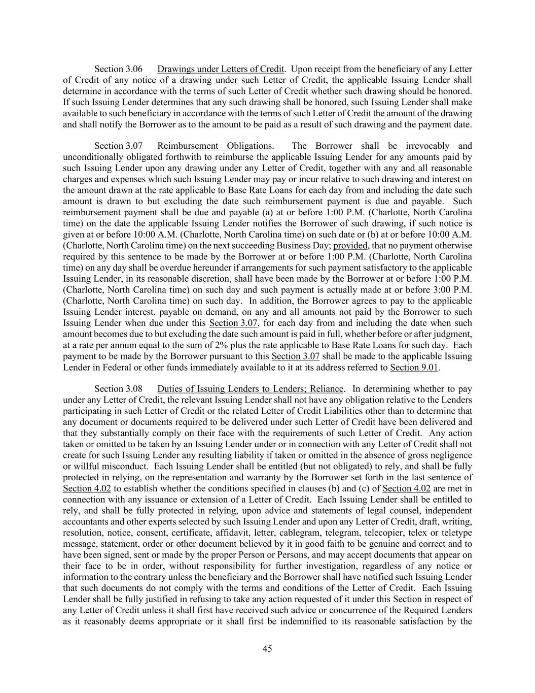 45 Section 3.06 Drawings under Letters of Credit. Upon receipt from the beneficiary of any Letter of Credit of any notice of a drawing under such Letter of Credit, the applicable Issuing Lender shall determine in accordance with the terms of such Letter of Credit whether such drawing should be honored. If such Issuing Lender determines that any such drawing shall be honored, such Issuing Lender shall make available to such beneficiary in accordance with the terms of such Letter of Credit the amount of the drawing and shall notify the Borrower as to the amount to be paid as a result of such drawing and the payment date. Section 3.07 Reimbursement Obligations. The Borrower shall be irrevocably and unconditionally obligated forthwith to reimburse the applicable Issuing Lender for any amounts paid by such Issuing Lender upon any drawing under any Letter of Credit, together with any and all reasonable charges and expenses which such Issuing Lender may pay or incur relative to such drawing and interest on the amount drawn at the rate applicable to Base Rate Loans for each day from and including the date such amount is drawn to but excluding the date such reimbursement payment is due and payable. Such reimbursement payment shall be due and payable (a) at or before 1:00 P.M. (Charlotte, North Carolina time) on the date the applicable Issuing Lender notifies the Borrower of such drawing, if such notice is given at or before 10:00 A.M. (Charlotte, North Carolina time) on such date or (b) at or before 10:00 A.M. (Charlotte, North Carolina time) on the next succeeding Business Day; provided, that no payment otherwise required by this sentence to be made by the Borrower at or before 1:00 P.M. (Charlotte, North Carolina time) on any day shall be overdue hereunder if arrangements for such payment satisfactory to the applicable Issuing Lender, in its reasonable discretion, shall have been made by the Borrower at or before 1:00 P.M. (Charlotte, North Carolina time) on such day and such payment is actually made at or before 3:00 P.M. (Charlotte, North Carolina time) on such day. In addition, the Borrower agrees to pay to the applicable Issuing Lender interest, payable on demand, on any and all amounts not paid by the Borrower to such Issuing Lender when due under this Section 3.07, for each day from and including the date when such amount becomes due to but excluding the date such amount is paid in full, whether before or after judgment, at a rate per annum equal to the sum of 2% plus the rate applicable to Base Rate Loans for such day. Each payment to be made by the Borrower pursuant to this Section 3.07 shall be made to the applicable Issuing Lender in Federal or other funds immediately available to it at its address referred to Section 9.01. Section 3.08 Duties of Issuing Lenders to Lenders; Reliance. In determining whether to pay under any Letter of Credit, the relevant Issuing Lender shall not have any obligation relative to the Lenders participating in such Letter of Credit or the related Letter of Credit Liabilities other than to determine that any document or documents required to be delivered under such Letter of Credit have been delivered and that they substantially comply on their face with the requirements of such Letter of Credit. Any action taken or omitted to be taken by an Issuing Lender under or in connection with any Letter of Credit shall not create for such Issuing Lender any resulting liability if taken or omitted in the absence of gross negligence or willful misconduct. Each Issuing Lender shall be entitled (but not obligated) to rely, and shall be fully protected in relying, on the representation and warranty by the Borrower set forth in the last sentence of Section 4.02 to establish whether the conditions specified in clauses (b) and (c) of Section 4.02 are met in connection with any issuance or extension of a Letter of Credit. Each Issuing Lender shall be entitled to rely, and shall be fully protected in relying, upon advice and statements of legal counsel, independent accountants and other experts selected by such Issuing Lender and upon any Letter of Credit, draft, writing, resolution, notice, consent, certificate, affidavit, letter, cablegram, telegram, telecopier, telex or teletype message, statement, order or other document believed by it in good faith to be genuine and correct and to have been signed, sent or made by the proper Person or Persons, and may accept documents that appear on their face to be in order, without responsibility for further investigation, regardless of any notice or information to the contrary unless the beneficiary and the Borrower shall have notified such Issuing Lender that such documents do not comply with the terms and conditions of the Letter of Credit. Each Issuing Lender shall be fully justified in refusing to take any action requested of it under this Section in respect of any Letter of Credit unless it shall first have received such advice or concurrence of the Required Lenders as it reasonably deems appropriate or it shall first be indemnified to its reasonable satisfaction by the