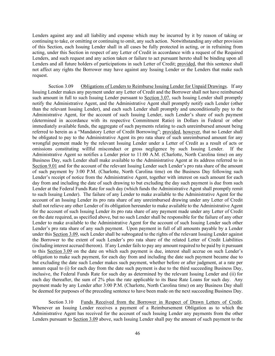 46 Lenders against any and all liability and expense which may be incurred by it by reason of taking or continuing to take, or omitting or continuing to omit, any such action. Notwithstanding any other provision of this Section, each Issuing Lender shall in all cases be fully protected in acting, or in refraining from acting, under this Section in respect of any Letter of Credit in accordance with a request of the Required Lenders, and such request and any action taken or failure to act pursuant hereto shall be binding upon all Lenders and all future holders of participations in such Letter of Credit; provided, that this sentence shall not affect any rights the Borrower may have against any Issuing Lender or the Lenders that make such request. Section 3.09 Obligations of Lenders to Reimburse Issuing Lender for Unpaid Drawings. If any Issuing Lender makes any payment under any Letter of Credit and the Borrower shall not have reimbursed such amount in full to such Issuing Lender pursuant to Section 3.07, such Issuing Lender shall promptly notify the Administrative Agent, and the Administrative Agent shall promptly notify each Lender (other than the relevant Issuing Lender), and each such Lender shall promptly and unconditionally pay to the Administrative Agent, for the account of such Issuing Lender, such Lender’s share of such payment (determined in accordance with its respective Commitment Ratio) in Dollars in Federal or other immediately available funds, the aggregate of such payments relating to each unreimbursed amount being referred to herein as a “Mandatory Letter of Credit Borrowing”; provided, however, that no Lender shall be obligated to pay to the Administrative Agent its pro rata share of such unreimbursed amount for any wrongful payment made by the relevant Issuing Lender under a Letter of Credit as a result of acts or omissions constituting willful misconduct or gross negligence by such Issuing Lender. If the Administrative Agent so notifies a Lender prior to 11:00 A.M. (Charlotte, North Carolina time) on any Business Day, such Lender shall make available to the Administrative Agent at its address referred to in Section 9.01 and for the account of the relevant Issuing Lender such Lender’s pro rata share of the amount of such payment by 3:00 P.M. (Charlotte, North Carolina time) on the Business Day following such Lender’s receipt of notice from the Administrative Agent, together with interest on such amount for each day from and including the date of such drawing to but excluding the day such payment is due from such Lender at the Federal Funds Rate for such day (which funds the Administrative Agent shall promptly remit to such Issuing Lender). The failure of any Lender to make available to the Administrative Agent for the account of an Issuing Lender its pro rata share of any unreimbursed drawing under any Letter of Credit shall not relieve any other Lender of its obligation hereunder to make available to the Administrative Agent for the account of such Issuing Lender its pro rata share of any payment made under any Letter of Credit on the date required, as specified above, but no such Lender shall be responsible for the failure of any other Lender to make available to the Administrative Agent for the account of such Issuing Lender such other Lender’s pro rata share of any such payment. Upon payment in full of all amounts payable by a Lender under this Section 3.09, such Lender shall be subrogated to the rights of the relevant Issuing Lender against the Borrower to the extent of such Lender’s pro rata share of the related Letter of Credit Liabilities (including interest accrued thereon). If any Lender fails to pay any amount required to be paid by it pursuant to this Section 3.09 on the date on which such payment is due, interest shall accrue on such Lender’s obligation to make such payment, for each day from and including the date such payment became due to but excluding the date such Lender makes such payment, whether before or after judgment, at a rate per annum equal to (i) for each day from the date such payment is due to the third succeeding Business Day, inclusive, the Federal Funds Rate for such day as determined by the relevant Issuing Lender and (ii) for each day thereafter, the sum of 2% plus the rate applicable to its Base Rate Loans for such day. Any payment made by any Lender after 3:00 P.M. (Charlotte, North Carolina time) on any Business Day shall be deemed for purposes of the preceding sentence to have been made on the next succeeding Business Day. Section 3.10 Funds Received from the Borrower in Respect of Drawn Letters of Credit. Whenever an Issuing Lender receives a payment of a Reimbursement Obligation as to which the Administrative Agent has received for the account of such Issuing Lender any payments from the other Lenders pursuant to Section 3.09 above, such Issuing Lender shall pay the amount of such payment to the
