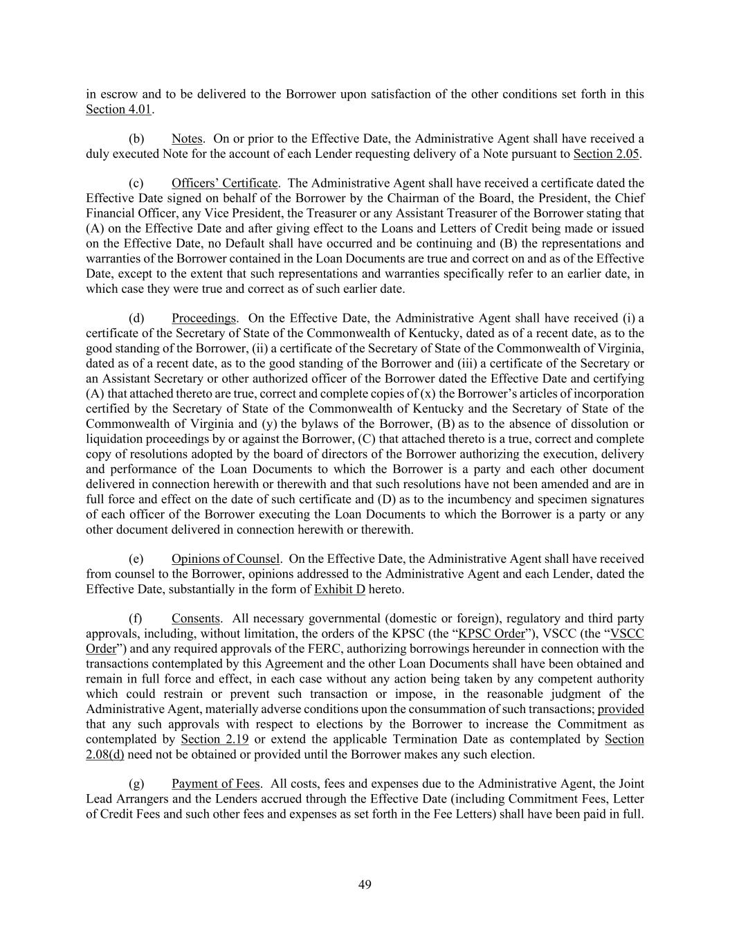 49 in escrow and to be delivered to the Borrower upon satisfaction of the other conditions set forth in this Section 4.01. (b) Notes. On or prior to the Effective Date, the Administrative Agent shall have received a duly executed Note for the account of each Lender requesting delivery of a Note pursuant to Section 2.05. (c) Officers’ Certificate. The Administrative Agent shall have received a certificate dated the Effective Date signed on behalf of the Borrower by the Chairman of the Board, the President, the Chief Financial Officer, any Vice President, the Treasurer or any Assistant Treasurer of the Borrower stating that (A) on the Effective Date and after giving effect to the Loans and Letters of Credit being made or issued on the Effective Date, no Default shall have occurred and be continuing and (B) the representations and warranties of the Borrower contained in the Loan Documents are true and correct on and as of the Effective Date, except to the extent that such representations and warranties specifically refer to an earlier date, in which case they were true and correct as of such earlier date. (d) Proceedings. On the Effective Date, the Administrative Agent shall have received (i) a certificate of the Secretary of State of the Commonwealth of Kentucky, dated as of a recent date, as to the good standing of the Borrower, (ii) a certificate of the Secretary of State of the Commonwealth of Virginia, dated as of a recent date, as to the good standing of the Borrower and (iii) a certificate of the Secretary or an Assistant Secretary or other authorized officer of the Borrower dated the Effective Date and certifying (A) that attached thereto are true, correct and complete copies of (x) the Borrower’s articles of incorporation certified by the Secretary of State of the Commonwealth of Kentucky and the Secretary of State of the Commonwealth of Virginia and (y) the bylaws of the Borrower, (B) as to the absence of dissolution or liquidation proceedings by or against the Borrower, (C) that attached thereto is a true, correct and complete copy of resolutions adopted by the board of directors of the Borrower authorizing the execution, delivery and performance of the Loan Documents to which the Borrower is a party and each other document delivered in connection herewith or therewith and that such resolutions have not been amended and are in full force and effect on the date of such certificate and (D) as to the incumbency and specimen signatures of each officer of the Borrower executing the Loan Documents to which the Borrower is a party or any other document delivered in connection herewith or therewith. (e) Opinions of Counsel. On the Effective Date, the Administrative Agent shall have received from counsel to the Borrower, opinions addressed to the Administrative Agent and each Lender, dated the Effective Date, substantially in the form of Exhibit D hereto. (f) Consents. All necessary governmental (domestic or foreign), regulatory and third party approvals, including, without limitation, the orders of the KPSC (the “KPSC Order”), VSCC (the “VSCC Order”) and any required approvals of the FERC, authorizing borrowings hereunder in connection with the transactions contemplated by this Agreement and the other Loan Documents shall have been obtained and remain in full force and effect, in each case without any action being taken by any competent authority which could restrain or prevent such transaction or impose, in the reasonable judgment of the Administrative Agent, materially adverse conditions upon the consummation of such transactions; provided that any such approvals with respect to elections by the Borrower to increase the Commitment as contemplated by Section 2.19 or extend the applicable Termination Date as contemplated by Section 2.08(d) need not be obtained or provided until the Borrower makes any such election. (g) Payment of Fees. All costs, fees and expenses due to the Administrative Agent, the Joint Lead Arrangers and the Lenders accrued through the Effective Date (including Commitment Fees, Letter of Credit Fees and such other fees and expenses as set forth in the Fee Letters) shall have been paid in full.