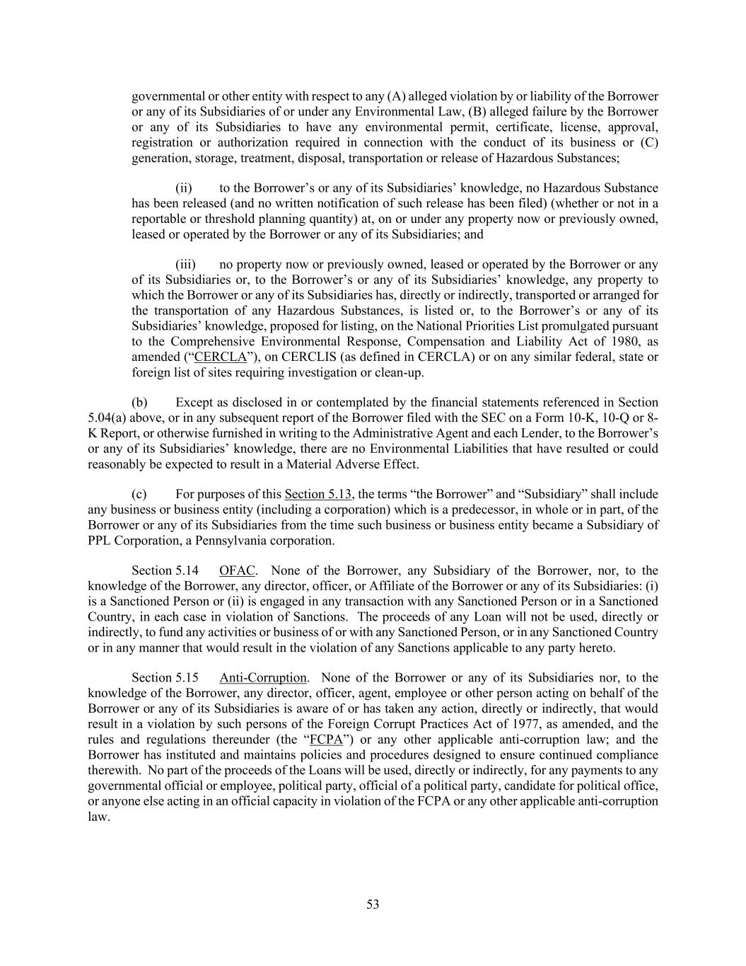 53 governmental or other entity with respect to any (A) alleged violation by or liability of the Borrower or any of its Subsidiaries of or under any Environmental Law, (B) alleged failure by the Borrower or any of its Subsidiaries to have any environmental permit, certificate, license, approval, registration or authorization required in connection with the conduct of its business or (C) generation, storage, treatment, disposal, transportation or release of Hazardous Substances; (ii) to the Borrower’s or any of its Subsidiaries’ knowledge, no Hazardous Substance has been released (and no written notification of such release has been filed) (whether or not in a reportable or threshold planning quantity) at, on or under any property now or previously owned, leased or operated by the Borrower or any of its Subsidiaries; and (iii) no property now or previously owned, leased or operated by the Borrower or any of its Subsidiaries or, to the Borrower’s or any of its Subsidiaries’ knowledge, any property to which the Borrower or any of its Subsidiaries has, directly or indirectly, transported or arranged for the transportation of any Hazardous Substances, is listed or, to the Borrower’s or any of its Subsidiaries’ knowledge, proposed for listing, on the National Priorities List promulgated pursuant to the Comprehensive Environmental Response, Compensation and Liability Act of 1980, as amended (“CERCLA”), on CERCLIS (as defined in CERCLA) or on any similar federal, state or foreign list of sites requiring investigation or clean-up. (b) Except as disclosed in or contemplated by the financial statements referenced in Section 5.04(a) above, or in any subsequent report of the Borrower filed with the SEC on a Form 10-K, 10-Q or 8- K Report, or otherwise furnished in writing to the Administrative Agent and each Lender, to the Borrower’s or any of its Subsidiaries’ knowledge, there are no Environmental Liabilities that have resulted or could reasonably be expected to result in a Material Adverse Effect. (c) For purposes of this Section 5.13, the terms “the Borrower” and “Subsidiary” shall include any business or business entity (including a corporation) which is a predecessor, in whole or in part, of the Borrower or any of its Subsidiaries from the time such business or business entity became a Subsidiary of PPL Corporation, a Pennsylvania corporation. Section 5.14 OFAC. None of the Borrower, any Subsidiary of the Borrower, nor, to the knowledge of the Borrower, any director, officer, or Affiliate of the Borrower or any of its Subsidiaries: (i) is a Sanctioned Person or (ii) is engaged in any transaction with any Sanctioned Person or in a Sanctioned Country, in each case in violation of Sanctions. The proceeds of any Loan will not be used, directly or indirectly, to fund any activities or business of or with any Sanctioned Person, or in any Sanctioned Country or in any manner that would result in the violation of any Sanctions applicable to any party hereto. Section 5.15 Anti-Corruption. None of the Borrower or any of its Subsidiaries nor, to the knowledge of the Borrower, any director, officer, agent, employee or other person acting on behalf of the Borrower or any of its Subsidiaries is aware of or has taken any action, directly or indirectly, that would result in a violation by such persons of the Foreign Corrupt Practices Act of 1977, as amended, and the rules and regulations thereunder (the “FCPA”) or any other applicable anti-corruption law; and the Borrower has instituted and maintains policies and procedures designed to ensure continued compliance therewith. No part of the proceeds of the Loans will be used, directly or indirectly, for any payments to any governmental official or employee, political party, official of a political party, candidate for political office, or anyone else acting in an official capacity in violation of the FCPA or any other applicable anti-corruption law.