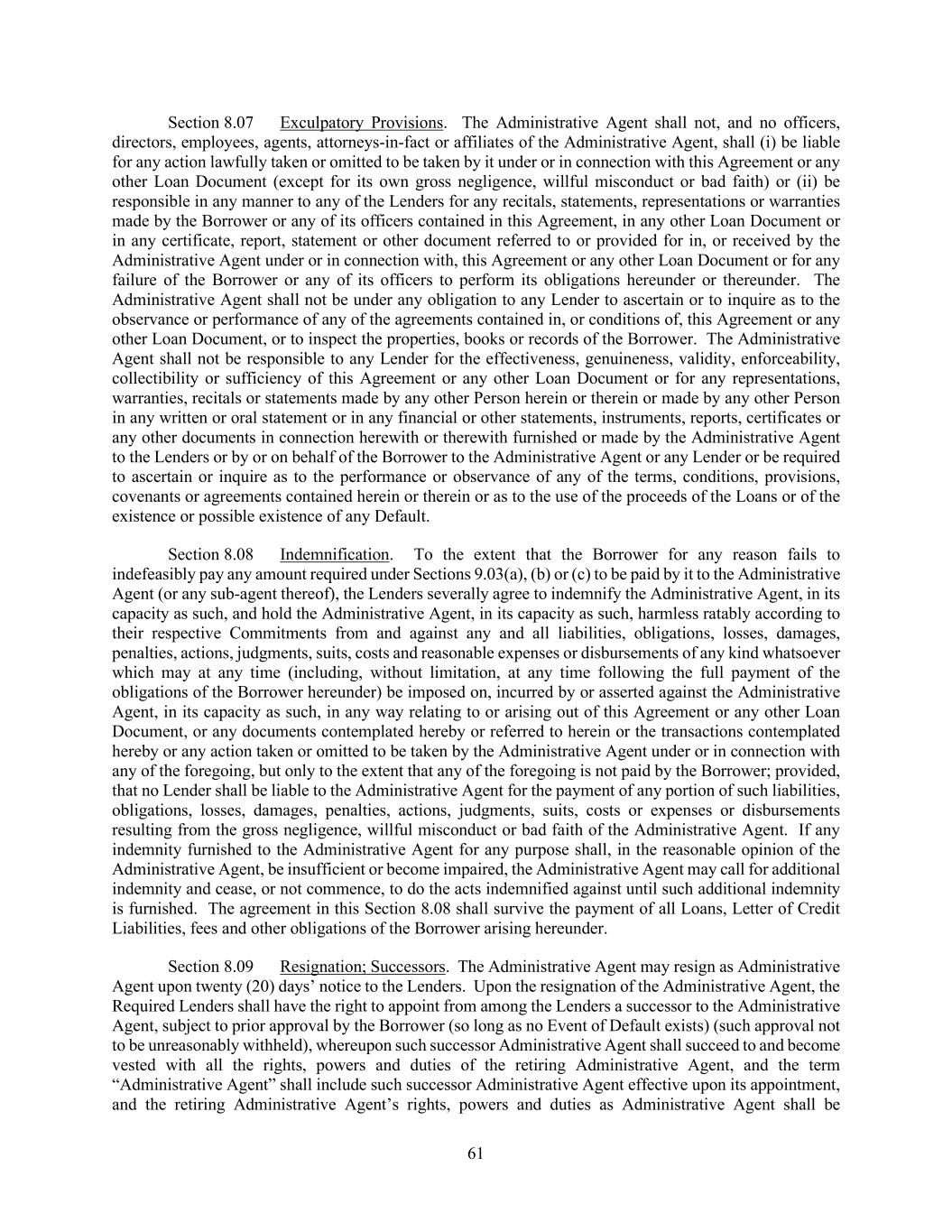 61 Section 8.07 Exculpatory Provisions. The Administrative Agent shall not, and no officers, directors, employees, agents, attorneys-in-fact or affiliates of the Administrative Agent, shall (i) be liable for any action lawfully taken or omitted to be taken by it under or in connection with this Agreement or any other Loan Document (except for its own gross negligence, willful misconduct or bad faith) or (ii) be responsible in any manner to any of the Lenders for any recitals, statements, representations or warranties made by the Borrower or any of its officers contained in this Agreement, in any other Loan Document or in any certificate, report, statement or other document referred to or provided for in, or received by the Administrative Agent under or in connection with, this Agreement or any other Loan Document or for any failure of the Borrower or any of its officers to perform its obligations hereunder or thereunder. The Administrative Agent shall not be under any obligation to any Lender to ascertain or to inquire as to the observance or performance of any of the agreements contained in, or conditions of, this Agreement or any other Loan Document, or to inspect the properties, books or records of the Borrower. The Administrative Agent shall not be responsible to any Lender for the effectiveness, genuineness, validity, enforceability, collectibility or sufficiency of this Agreement or any other Loan Document or for any representations, warranties, recitals or statements made by any other Person herein or therein or made by any other Person in any written or oral statement or in any financial or other statements, instruments, reports, certificates or any other documents in connection herewith or therewith furnished or made by the Administrative Agent to the Lenders or by or on behalf of the Borrower to the Administrative Agent or any Lender or be required to ascertain or inquire as to the performance or observance of any of the terms, conditions, provisions, covenants or agreements contained herein or therein or as to the use of the proceeds of the Loans or of the existence or possible existence of any Default. Section 8.08 Indemnification. To the extent that the Borrower for any reason fails to indefeasibly pay any amount required under Sections 9.03(a), (b) or (c) to be paid by it to the Administrative Agent (or any sub-agent thereof), the Lenders severally agree to indemnify the Administrative Agent, in its capacity as such, and hold the Administrative Agent, in its capacity as such, harmless ratably according to their respective Commitments from and against any and all liabilities, obligations, losses, damages, penalties, actions, judgments, suits, costs and reasonable expenses or disbursements of any kind whatsoever which may at any time (including, without limitation, at any time following the full payment of the obligations of the Borrower hereunder) be imposed on, incurred by or asserted against the Administrative Agent, in its capacity as such, in any way relating to or arising out of this Agreement or any other Loan Document, or any documents contemplated hereby or referred to herein or the transactions contemplated hereby or any action taken or omitted to be taken by the Administrative Agent under or in connection with any of the foregoing, but only to the extent that any of the foregoing is not paid by the Borrower; provided, that no Lender shall be liable to the Administrative Agent for the payment of any portion of such liabilities, obligations, losses, damages, penalties, actions, judgments, suits, costs or expenses or disbursements resulting from the gross negligence, willful misconduct or bad faith of the Administrative Agent. If any indemnity furnished to the Administrative Agent for any purpose shall, in the reasonable opinion of the Administrative Agent, be insufficient or become impaired, the Administrative Agent may call for additional indemnity and cease, or not commence, to do the acts indemnified against until such additional indemnity is furnished. The agreement in this Section 8.08 shall survive the payment of all Loans, Letter of Credit Liabilities, fees and other obligations of the Borrower arising hereunder. Section 8.09 Resignation; Successors. The Administrative Agent may resign as Administrative Agent upon twenty (20) days’ notice to the Lenders. Upon the resignation of the Administrative Agent, the Required Lenders shall have the right to appoint from among the Lenders a successor to the Administrative Agent, subject to prior approval by the Borrower (so long as no Event of Default exists) (such approval not to be unreasonably withheld), whereupon such successor Administrative Agent shall succeed to and become vested with all the rights, powers and duties of the retiring Administrative Agent, and the term “Administrative Agent” shall include such successor Administrative Agent effective upon its appointment, and the retiring Administrative Agent’s rights, powers and duties as Administrative Agent shall be