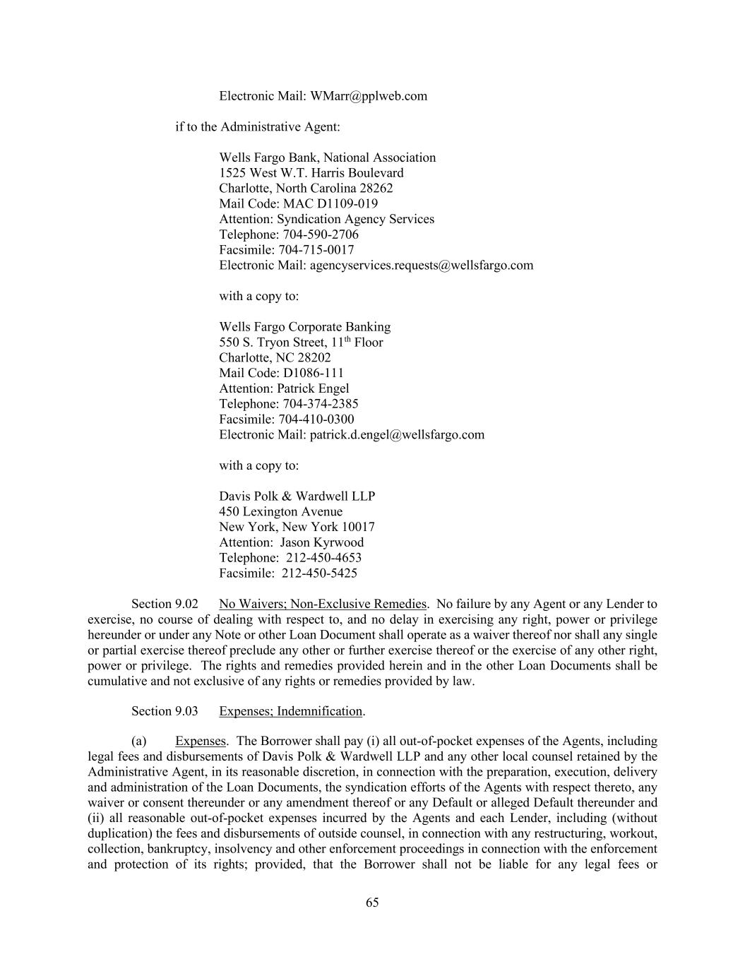65 Electronic Mail: WMarr@pplweb.com if to the Administrative Agent: Wells Fargo Bank, National Association 1525 West W.T. Harris Boulevard Charlotte, North Carolina 28262 Mail Code: MAC D1109-019 Attention: Syndication Agency Services Telephone: 704-590-2706 Facsimile: 704-715-0017 Electronic Mail: agencyservices.requests@wellsfargo.com with a copy to: Wells Fargo Corporate Banking 550 S. Tryon Street, 11th Floor Charlotte, NC 28202 Mail Code: D1086-111 Attention: Patrick Engel Telephone: 704-374-2385 Facsimile: 704-410-0300 Electronic Mail: patrick.d.engel@wellsfargo.com with a copy to: Davis Polk & Wardwell LLP 450 Lexington Avenue New York, New York 10017 Attention: Jason Kyrwood Telephone: 212-450-4653 Facsimile: 212-450-5425 Section 9.02 No Waivers; Non-Exclusive Remedies. No failure by any Agent or any Lender to exercise, no course of dealing with respect to, and no delay in exercising any right, power or privilege hereunder or under any Note or other Loan Document shall operate as a waiver thereof nor shall any single or partial exercise thereof preclude any other or further exercise thereof or the exercise of any other right, power or privilege. The rights and remedies provided herein and in the other Loan Documents shall be cumulative and not exclusive of any rights or remedies provided by law. Section 9.03 Expenses; Indemnification. (a) Expenses. The Borrower shall pay (i) all out-of-pocket expenses of the Agents, including legal fees and disbursements of Davis Polk & Wardwell LLP and any other local counsel retained by the Administrative Agent, in its reasonable discretion, in connection with the preparation, execution, delivery and administration of the Loan Documents, the syndication efforts of the Agents with respect thereto, any waiver or consent thereunder or any amendment thereof or any Default or alleged Default thereunder and (ii) all reasonable out-of-pocket expenses incurred by the Agents and each Lender, including (without duplication) the fees and disbursements of outside counsel, in connection with any restructuring, workout, collection, bankruptcy, insolvency and other enforcement proceedings in connection with the enforcement and protection of its rights; provided, that the Borrower shall not be liable for any legal fees or