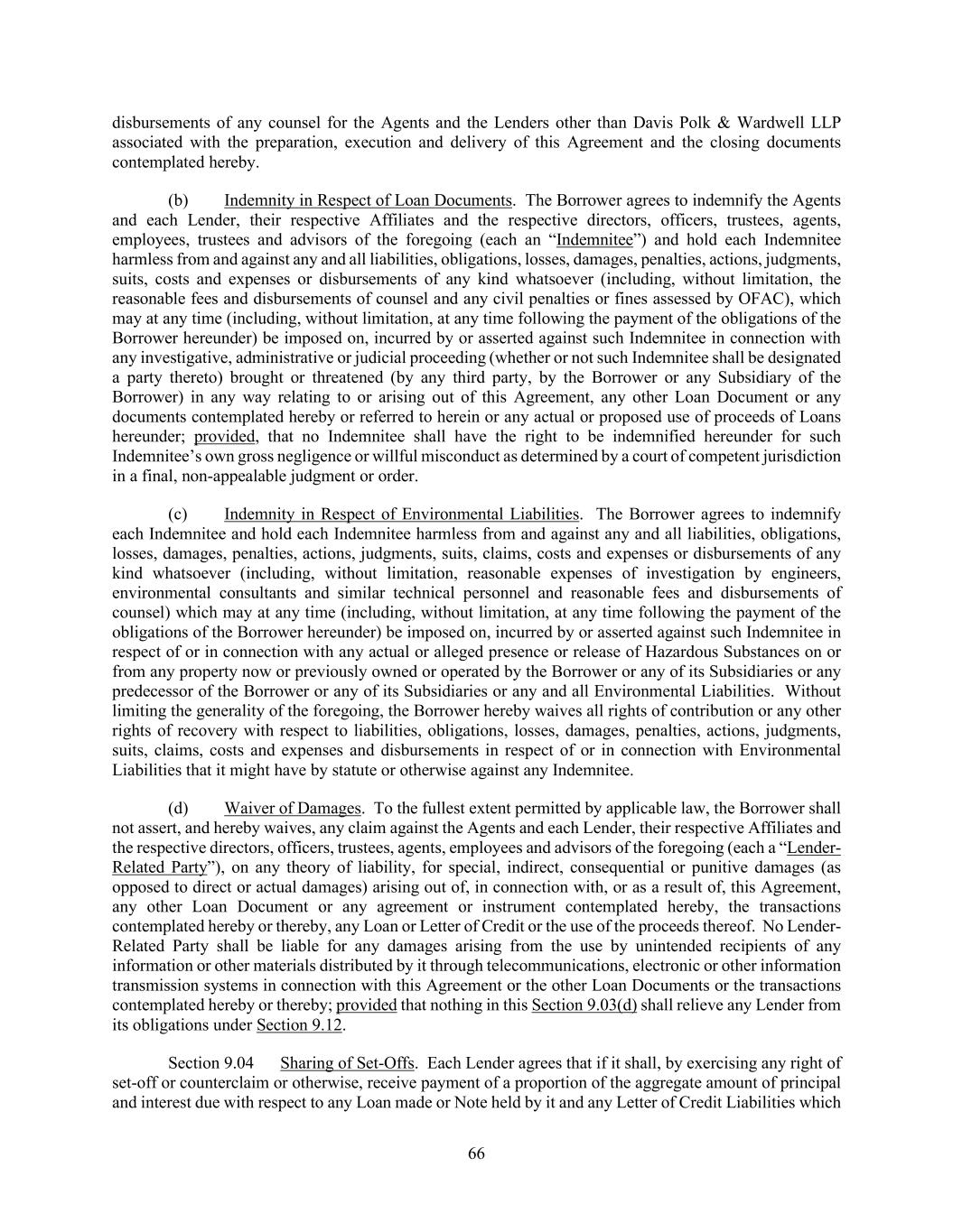 66 disbursements of any counsel for the Agents and the Lenders other than Davis Polk & Wardwell LLP associated with the preparation, execution and delivery of this Agreement and the closing documents contemplated hereby. (b) Indemnity in Respect of Loan Documents. The Borrower agrees to indemnify the Agents and each Lender, their respective Affiliates and the respective directors, officers, trustees, agents, employees, trustees and advisors of the foregoing (each an “Indemnitee”) and hold each Indemnitee harmless from and against any and all liabilities, obligations, losses, damages, penalties, actions, judgments, suits, costs and expenses or disbursements of any kind whatsoever (including, without limitation, the reasonable fees and disbursements of counsel and any civil penalties or fines assessed by OFAC), which may at any time (including, without limitation, at any time following the payment of the obligations of the Borrower hereunder) be imposed on, incurred by or asserted against such Indemnitee in connection with any investigative, administrative or judicial proceeding (whether or not such Indemnitee shall be designated a party thereto) brought or threatened (by any third party, by the Borrower or any Subsidiary of the Borrower) in any way relating to or arising out of this Agreement, any other Loan Document or any documents contemplated hereby or referred to herein or any actual or proposed use of proceeds of Loans hereunder; provided, that no Indemnitee shall have the right to be indemnified hereunder for such Indemnitee’s own gross negligence or willful misconduct as determined by a court of competent jurisdiction in a final, non-appealable judgment or order. (c) Indemnity in Respect of Environmental Liabilities. The Borrower agrees to indemnify each Indemnitee and hold each Indemnitee harmless from and against any and all liabilities, obligations, losses, damages, penalties, actions, judgments, suits, claims, costs and expenses or disbursements of any kind whatsoever (including, without limitation, reasonable expenses of investigation by engineers, environmental consultants and similar technical personnel and reasonable fees and disbursements of counsel) which may at any time (including, without limitation, at any time following the payment of the obligations of the Borrower hereunder) be imposed on, incurred by or asserted against such Indemnitee in respect of or in connection with any actual or alleged presence or release of Hazardous Substances on or from any property now or previously owned or operated by the Borrower or any of its Subsidiaries or any predecessor of the Borrower or any of its Subsidiaries or any and all Environmental Liabilities. Without limiting the generality of the foregoing, the Borrower hereby waives all rights of contribution or any other rights of recovery with respect to liabilities, obligations, losses, damages, penalties, actions, judgments, suits, claims, costs and expenses and disbursements in respect of or in connection with Environmental Liabilities that it might have by statute or otherwise against any Indemnitee. (d) Waiver of Damages. To the fullest extent permitted by applicable law, the Borrower shall not assert, and hereby waives, any claim against the Agents and each Lender, their respective Affiliates and the respective directors, officers, trustees, agents, employees and advisors of the foregoing (each a “Lender- Related Party”), on any theory of liability, for special, indirect, consequential or punitive damages (as opposed to direct or actual damages) arising out of, in connection with, or as a result of, this Agreement, any other Loan Document or any agreement or instrument contemplated hereby, the transactions contemplated hereby or thereby, any Loan or Letter of Credit or the use of the proceeds thereof. No Lender- Related Party shall be liable for any damages arising from the use by unintended recipients of any information or other materials distributed by it through telecommunications, electronic or other information transmission systems in connection with this Agreement or the other Loan Documents or the transactions contemplated hereby or thereby; provided that nothing in this Section 9.03(d) shall relieve any Lender from its obligations under Section 9.12. Section 9.04 Sharing of Set-Offs. Each Lender agrees that if it shall, by exercising any right of set-off or counterclaim or otherwise, receive payment of a proportion of the aggregate amount of principal and interest due with respect to any Loan made or Note held by it and any Letter of Credit Liabilities which