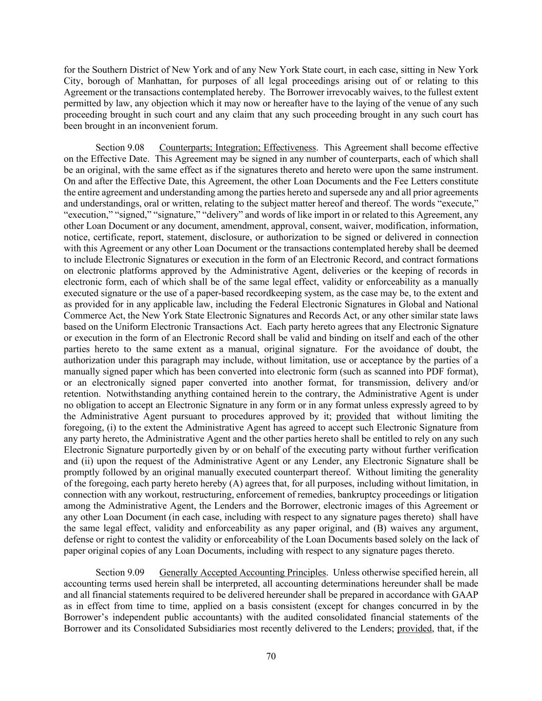 70 for the Southern District of New York and of any New York State court, in each case, sitting in New York City, borough of Manhattan, for purposes of all legal proceedings arising out of or relating to this Agreement or the transactions contemplated hereby. The Borrower irrevocably waives, to the fullest extent permitted by law, any objection which it may now or hereafter have to the laying of the venue of any such proceeding brought in such court and any claim that any such proceeding brought in any such court has been brought in an inconvenient forum. Section 9.08 Counterparts; Integration; Effectiveness. This Agreement shall become effective on the Effective Date. This Agreement may be signed in any number of counterparts, each of which shall be an original, with the same effect as if the signatures thereto and hereto were upon the same instrument. On and after the Effective Date, this Agreement, the other Loan Documents and the Fee Letters constitute the entire agreement and understanding among the parties hereto and supersede any and all prior agreements and understandings, oral or written, relating to the subject matter hereof and thereof. The words “execute,” “execution,” “signed,” “signature,” “delivery” and words of like import in or related to this Agreement, any other Loan Document or any document, amendment, approval, consent, waiver, modification, information, notice, certificate, report, statement, disclosure, or authorization to be signed or delivered in connection with this Agreement or any other Loan Document or the transactions contemplated hereby shall be deemed to include Electronic Signatures or execution in the form of an Electronic Record, and contract formations on electronic platforms approved by the Administrative Agent, deliveries or the keeping of records in electronic form, each of which shall be of the same legal effect, validity or enforceability as a manually executed signature or the use of a paper-based recordkeeping system, as the case may be, to the extent and as provided for in any applicable law, including the Federal Electronic Signatures in Global and National Commerce Act, the New York State Electronic Signatures and Records Act, or any other similar state laws based on the Uniform Electronic Transactions Act. Each party hereto agrees that any Electronic Signature or execution in the form of an Electronic Record shall be valid and binding on itself and each of the other parties hereto to the same extent as a manual, original signature. For the avoidance of doubt, the authorization under this paragraph may include, without limitation, use or acceptance by the parties of a manually signed paper which has been converted into electronic form (such as scanned into PDF format), or an electronically signed paper converted into another format, for transmission, delivery and/or retention. Notwithstanding anything contained herein to the contrary, the Administrative Agent is under no obligation to accept an Electronic Signature in any form or in any format unless expressly agreed to by the Administrative Agent pursuant to procedures approved by it; provided that without limiting the foregoing, (i) to the extent the Administrative Agent has agreed to accept such Electronic Signature from any party hereto, the Administrative Agent and the other parties hereto shall be entitled to rely on any such Electronic Signature purportedly given by or on behalf of the executing party without further verification and (ii) upon the request of the Administrative Agent or any Lender, any Electronic Signature shall be promptly followed by an original manually executed counterpart thereof. Without limiting the generality of the foregoing, each party hereto hereby (A) agrees that, for all purposes, including without limitation, in connection with any workout, restructuring, enforcement of remedies, bankruptcy proceedings or litigation among the Administrative Agent, the Lenders and the Borrower, electronic images of this Agreement or any other Loan Document (in each case, including with respect to any signature pages thereto) shall have the same legal effect, validity and enforceability as any paper original, and (B) waives any argument, defense or right to contest the validity or enforceability of the Loan Documents based solely on the lack of paper original copies of any Loan Documents, including with respect to any signature pages thereto. Section 9.09 Generally Accepted Accounting Principles. Unless otherwise specified herein, all accounting terms used herein shall be interpreted, all accounting determinations hereunder shall be made and all financial statements required to be delivered hereunder shall be prepared in accordance with GAAP as in effect from time to time, applied on a basis consistent (except for changes concurred in by the Borrower’s independent public accountants) with the audited consolidated financial statements of the Borrower and its Consolidated Subsidiaries most recently delivered to the Lenders; provided, that, if the