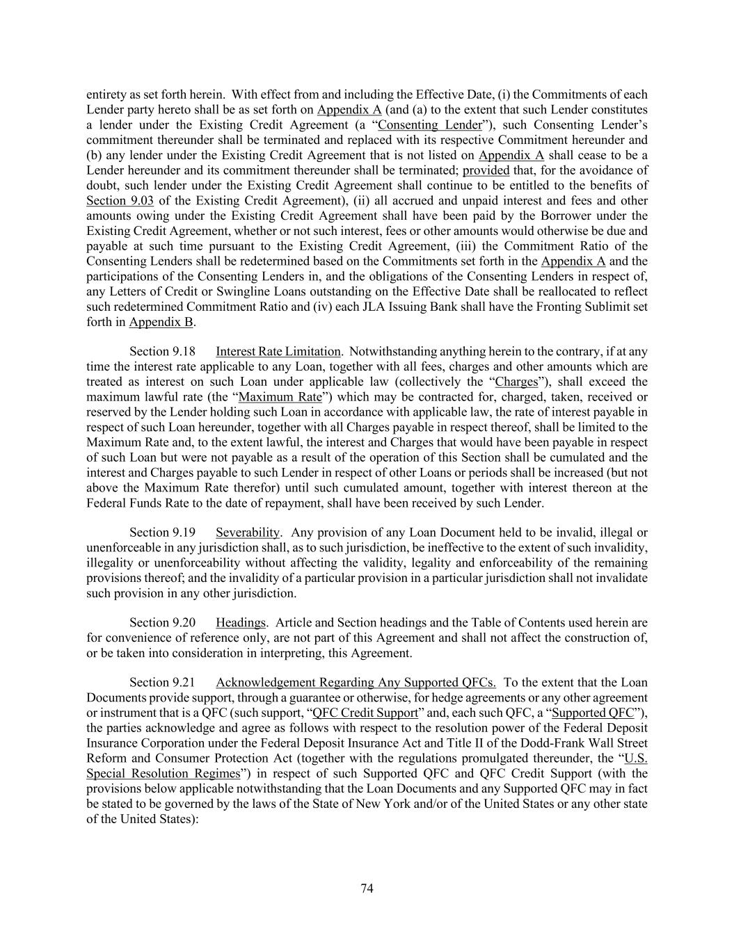 74 entirety as set forth herein. With effect from and including the Effective Date, (i) the Commitments of each Lender party hereto shall be as set forth on Appendix A (and (a) to the extent that such Lender constitutes a lender under the Existing Credit Agreement (a “Consenting Lender”), such Consenting Lender’s commitment thereunder shall be terminated and replaced with its respective Commitment hereunder and (b) any lender under the Existing Credit Agreement that is not listed on Appendix A shall cease to be a Lender hereunder and its commitment thereunder shall be terminated; provided that, for the avoidance of doubt, such lender under the Existing Credit Agreement shall continue to be entitled to the benefits of Section 9.03 of the Existing Credit Agreement), (ii) all accrued and unpaid interest and fees and other amounts owing under the Existing Credit Agreement shall have been paid by the Borrower under the Existing Credit Agreement, whether or not such interest, fees or other amounts would otherwise be due and payable at such time pursuant to the Existing Credit Agreement, (iii) the Commitment Ratio of the Consenting Lenders shall be redetermined based on the Commitments set forth in the Appendix A and the participations of the Consenting Lenders in, and the obligations of the Consenting Lenders in respect of, any Letters of Credit or Swingline Loans outstanding on the Effective Date shall be reallocated to reflect such redetermined Commitment Ratio and (iv) each JLA Issuing Bank shall have the Fronting Sublimit set forth in Appendix B. Section 9.18 Interest Rate Limitation. Notwithstanding anything herein to the contrary, if at any time the interest rate applicable to any Loan, together with all fees, charges and other amounts which are treated as interest on such Loan under applicable law (collectively the “Charges”), shall exceed the maximum lawful rate (the “Maximum Rate”) which may be contracted for, charged, taken, received or reserved by the Lender holding such Loan in accordance with applicable law, the rate of interest payable in respect of such Loan hereunder, together with all Charges payable in respect thereof, shall be limited to the Maximum Rate and, to the extent lawful, the interest and Charges that would have been payable in respect of such Loan but were not payable as a result of the operation of this Section shall be cumulated and the interest and Charges payable to such Lender in respect of other Loans or periods shall be increased (but not above the Maximum Rate therefor) until such cumulated amount, together with interest thereon at the Federal Funds Rate to the date of repayment, shall have been received by such Lender. Section 9.19 Severability. Any provision of any Loan Document held to be invalid, illegal or unenforceable in any jurisdiction shall, as to such jurisdiction, be ineffective to the extent of such invalidity, illegality or unenforceability without affecting the validity, legality and enforceability of the remaining provisions thereof; and the invalidity of a particular provision in a particular jurisdiction shall not invalidate such provision in any other jurisdiction. Section 9.20 Headings. Article and Section headings and the Table of Contents used herein are for convenience of reference only, are not part of this Agreement and shall not affect the construction of, or be taken into consideration in interpreting, this Agreement. Section 9.21 Acknowledgement Regarding Any Supported QFCs. To the extent that the Loan Documents provide support, through a guarantee or otherwise, for hedge agreements or any other agreement or instrument that is a QFC (such support, “QFC Credit Support” and, each such QFC, a “Supported QFC”), the parties acknowledge and agree as follows with respect to the resolution power of the Federal Deposit Insurance Corporation under the Federal Deposit Insurance Act and Title II of the Dodd-Frank Wall Street Reform and Consumer Protection Act (together with the regulations promulgated thereunder, the “U.S. Special Resolution Regimes”) in respect of such Supported QFC and QFC Credit Support (with the provisions below applicable notwithstanding that the Loan Documents and any Supported QFC may in fact be stated to be governed by the laws of the State of New York and/or of the United States or any other state of the United States):
