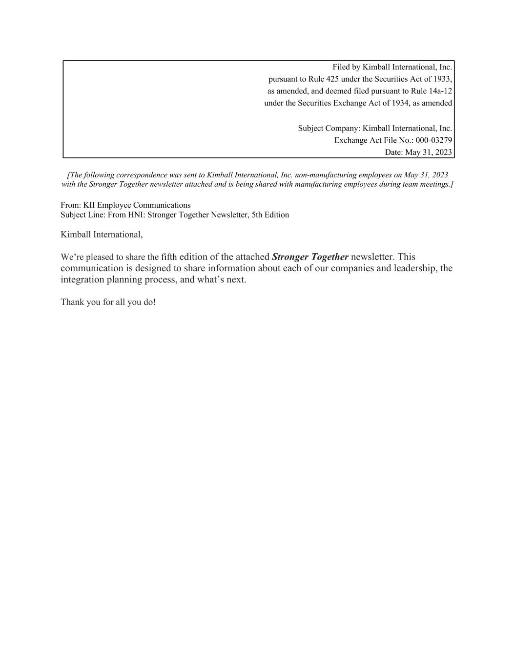 Filed by Kimball International, Inc. pursuant to Rule 425 under the Securities Act of 1933, as amended, and deemed filed pursuant to Rule 14a-12 under the Securities Exchange Act of 1934, as amended Subject Company: Kimball International, Inc. Exchange Act File No.: 000-03279 Date: May 31, 2023 [The following correspondence was sent to Kimball International, Inc. non-manufacturing employees on May 31, 2023 with the Stronger Together newsletter attached and is being shared with manufacturing employees during team meetings.] From: KII Employee Communications Subject Line: From HNI: Stronger Together Newsletter, 5th Edition Kimball International, We’re pleased to share the fifth edition of the attached Stronger Together newsletter. This communication is designed to share information about each of our companies and leadership, the integration planning process, and what’s next. Thank you for all you do!