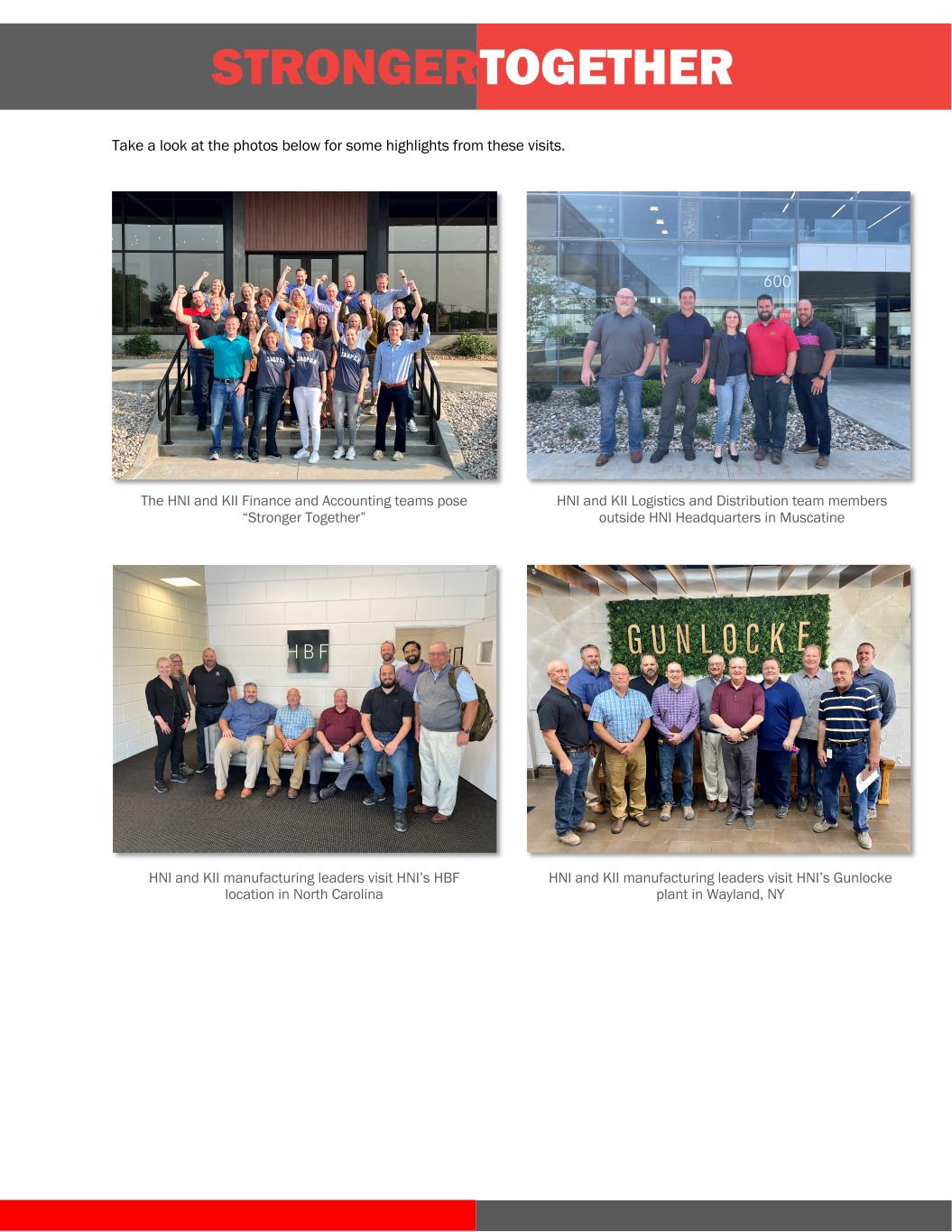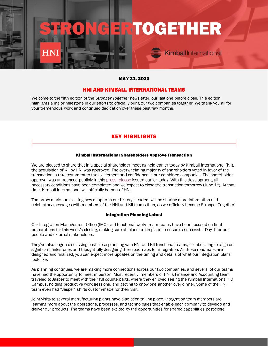 MAY 31, 2023 HNI AND KIMBALL INTERNATIONAL TEAMS Welcome to the fifth edition of the Stronger Together newsletter, our last one before close. This edition highlights a major milestone in our efforts to officially bring our two companies together. We thank you all for your tremendous work and continued dedication over these past few months. KEY HIGHLIGHTS Kimball International Shareholders Approve Transaction We are pleased to share that in a special shareholder meeting held earlier today by Kimball International (KII), the acquisition of KII by HNI was approved. The overwhelming majority of shareholders voted in favor of the transaction, a true testament to the excitement and confidence in our combined companies. The shareholder approval was announced publicly in this press release issued earlier today. With this development, all necessary conditions have been completed and we expect to close the transaction tomorrow (June 1st). At that time, Kimball International will officially be part of HNI. Tomorrow marks an exciting new chapter in our history. Leaders will be sharing more information and celebratory messages with members of the HNI and KII teams then, as we officially become Stronger Together! Integration Planning Latest Our Integration Management Office (IMO) and functional workstream teams have been focused on final preparations for this week’s closing, making sure all plans are in place to ensure a successful Day 1 for our people and external stakeholders. They’ve also begun discussing post-close planning with HNI and KII functional teams, collaborating to align on significant milestones and thoughtfully designing their roadmaps for integration. As those roadmaps are designed and finalized, you can expect more updates on the timing and details of what our integration plans look like. As planning continues, we are making more connections across our two companies, and several of our teams have had the opportunity to meet in person. Most recently, members of HNI’s Finance and Accounting team traveled to Jasper to meet with their KII counterparts, where they enjoyed seeing the Kimball International HQ Campus, holding productive work sessions, and getting to know one another over dinner. Some of the HNI team even had “Jasper” shirts custom-made for their visit! Joint visits to several manufacturing plants have also been taking place. Integration team members are learning more about the operations, processes, and technologies that enable each company to develop and deliver our products. The teams have been excited by the opportunities for shared capabilities post-close.