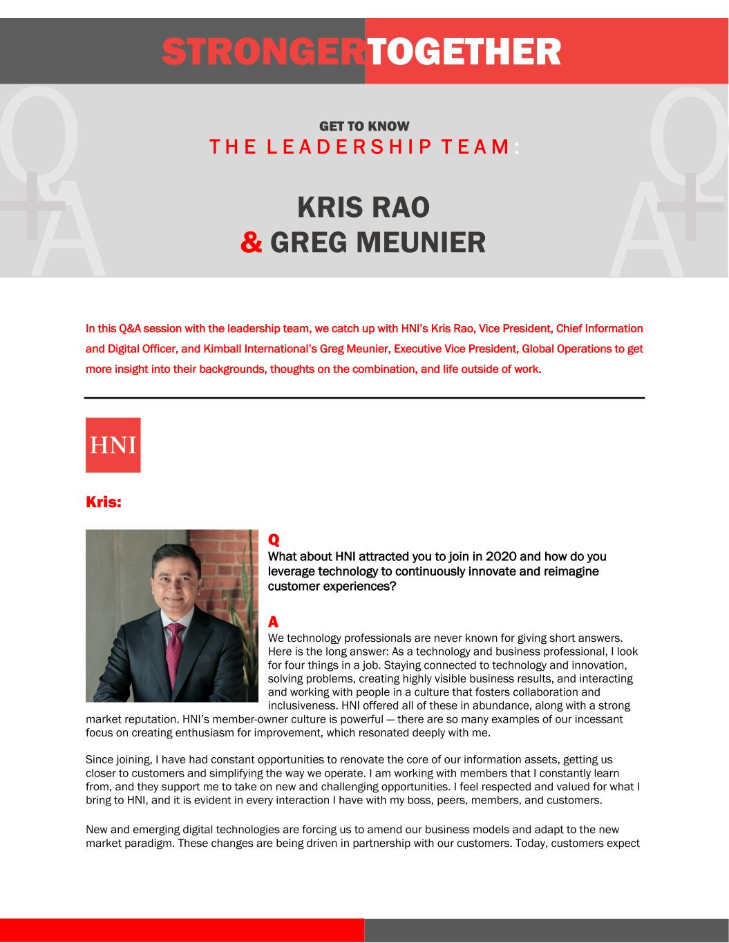 GET TO KNOW T H E L E A D E R S H I P T E A M : In this Q&A session with the leadership team, we catch up with HNI’s Kris Rao, Vice President, Chief Information and Digital Officer, and Kimball International’s Greg Meunier, Executive Vice President, Global Operations to get more insight into their backgrounds, thoughts on the combination, and life outside of work. Kris: Q What about HNI attracted you to join in 2020 and how do you leverage technology to continuously innovate and reimagine customer experiences? A We technology professionals are never known for giving short answers. Here is the long answer: As a technology and business professional, I look for four things in a job. Staying connected to technology and innovation, solving problems, creating highly visible business results, and interacting and working with people in a culture that fosters collaboration and inclusiveness. HNI offered all of these in abundance, along with a strong market reputation. HNI’s member-owner culture is powerful — there are so many examples of our incessant focus on creating enthusiasm for improvement, which resonated deeply with me. Since joining, I have had constant opportunities to renovate the core of our information assets, getting us closer to customers and simplifying the way we operate. I am working with members that I constantly learn from, and they support me to take on new and challenging opportunities. I feel respected and valued for what I bring to HNI, and it is evident in every interaction I have with my boss, peers, members, and customers. New and emerging digital technologies are forcing us to amend our business models and adapt to the new market paradigm. These changes are being driven in partnership with our customers. Today, customers expect Q A + KRIS RAO & GREG MEUNIER Q A +