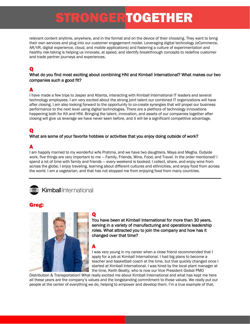 relevant content anytime, anywhere, and in the format and on the device of their choosing. They want to bring their own services and plug into our customer engagement model. Leveraging digital technology (eCommerce, AR/VR, digital experience, cloud, and mobile applications) and fostering a culture of experimentation and healthy risk-taking is helping us innovate, at speed, and identify breakthrough concepts to redefine customer and trade partner journeys and experiences. Q What do you find most exciting about combining HNI and Kimball International? What makes our two companies such a good fit? A I have made a few trips to Jasper and Atlanta, interacting with Kimball International IT leaders and several technology employees. I am very excited about the strong joint talent our combined IT organizations will have after closing. I am also looking forward to the opportunity to co-create synergies that will propel our business performance to the next level using digital technologies. There are a plethora of technology innovations happening both for KII and HNI. Bringing the talent, innovation, and assets of our companies together after closing will give us leverage we have never seen before, and it will be a significant competitive advantage. Q What are some of your favorite hobbies or activities that you enjoy doing outside of work? A I am happily married to my wonderful wife Pratima, and we have two daughters, Maya and Megha. Outside work, five things are very important to me — Family, Friends, Wine, Food, and Travel. In the order mentioned! I spend a lot of time with family and friends — every weekend is booked; I collect, share, and enjoy wine from across the globe; I enjoy traveling, learning about different cultures and ethnicities, and enjoy food from across the world. I am a vegetarian, and that has not stopped me from enjoying food from many countries. Greg: Q You have been at Kimball International for more than 30 years, serving in a variety of manufacturing and operations leadership roles. What attracted you to join the company and how has it changed over that time? A I was very young in my career when a close friend recommended that I apply for a job at Kimball International. I had big plans to become a teacher and basketball coach at the time, but that quickly changed once I started at Kimball International. I was hired by the local plant manager at the time, Keith Beatty, who is now our Vice President Global PMO Distribution & Transportation! What really excited me about Kimball International and what has kept me here all these years are the company’s values and the longstanding commitment to those values. We really put our people at the center of everything we do, helping to empower and develop them. I’m a true example of that,