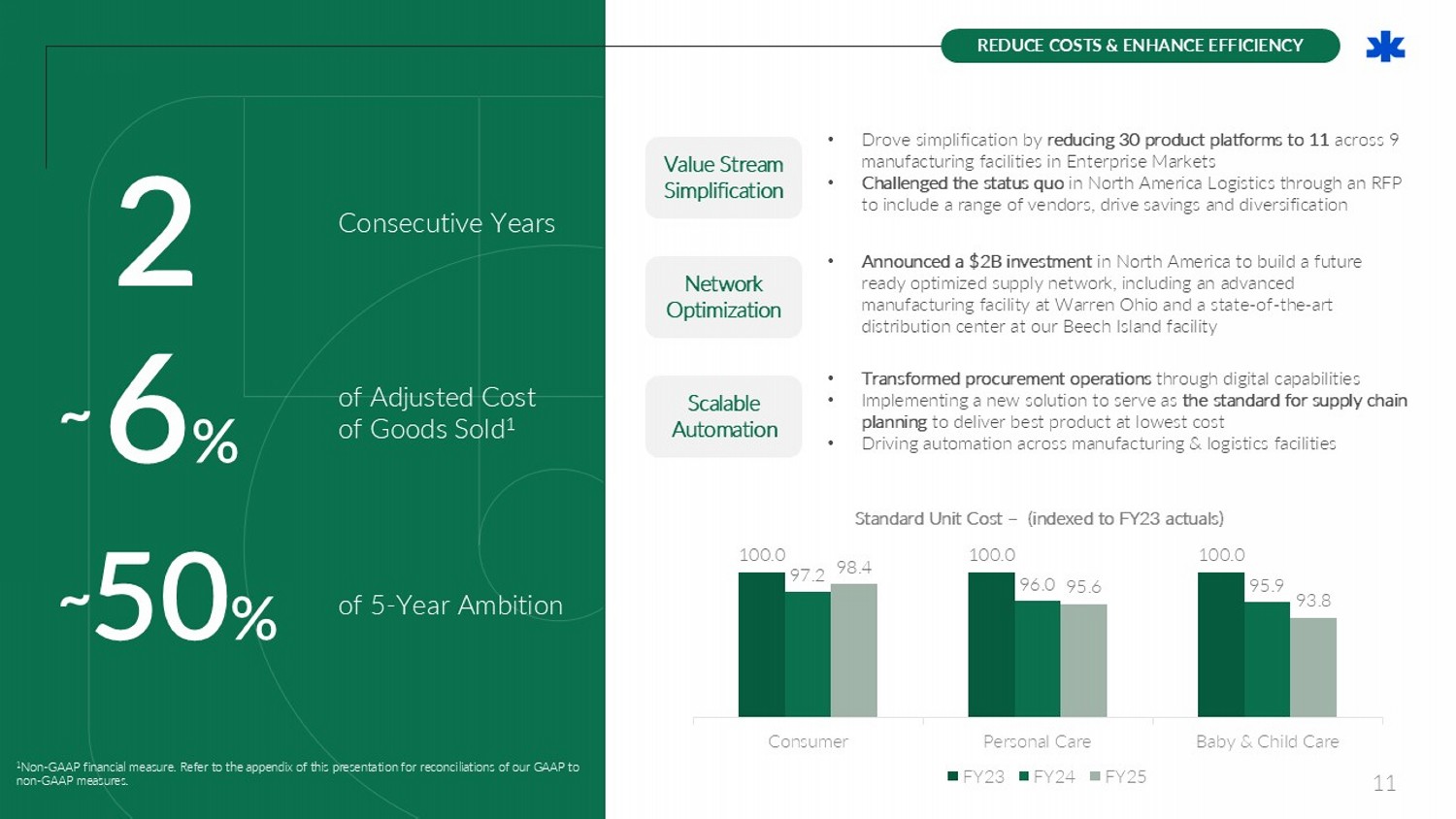 10 Stepping Up Gross Productivity Savings Gross Productivity includes Productivity generated from end - to - end Integrated Margin Management and from Procurement initiatives REDUCE COSTS & ENHANCE EFFICIENCY Exceeded the targeted range of 5 - 6% Gross Productivity Savings in 2025 2 Value Stream: Design to Value initiatives including standardized product platforms and strong price negotiations unlocking value Network Optimization: Optimizing manufacturing and distribution footprint including external contract manufacturing among others Scalable Automation: Unlocking efficiencies through automation 7.2% of Adj COGS 1 Q4 Actuals FY25 Actuals Automation Network Optimization Value Stream 1 Non - GAAP financial measures. Refer to the appendix of this presentation for reconciliations of our GAAP to non - GAAP measures. 2 Kimberly - Clark does not provide a reconciliation of these forward - looking non - GAAP financial measures to the most directly comp arable GAAP financial measures on a forward - looking basis because it is unable to predict certain adjustment items without unreasonable effort. 6.2% of Adj COGS 1