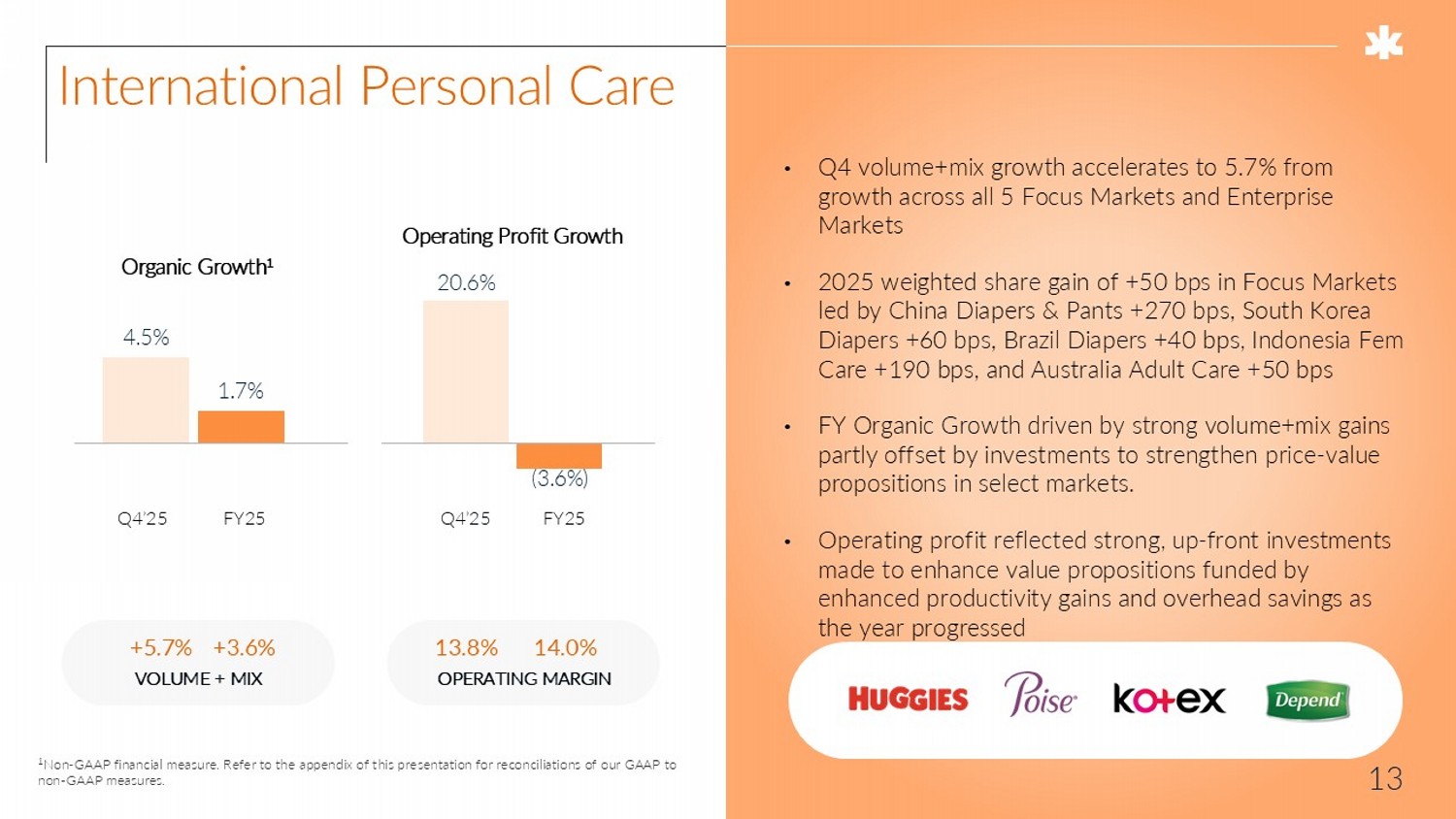 13.1% 0.1% 2.1% 1.7% Q4’25 Broad - based volume growth while brands gained global weighted share +10 bps Strong gross productivity and overhead efficiency deliver solid operating profit performance in a challenging environment Stable, consistent earnings delivery reflecting structural stability, disciplined execution Strong operating cash generation funding stepped - up capital investments, delivering another year of strong Adjusted Free Cash Flow 1 Organic Sales Growth 1 2025: Durable Delivery in a Turbulent Environment Adjusted Operating Profit Growth 1 Q4’25 Adjusted EPS Growth 1 attributable to Kimberly - Clark 24.0% 3.2% Q4’25 Adjusted Free Cash Flow 1 FY25 $1.9B 1 Non - GAAP financial measures. Refer to the appendix of this presentation for reconciliations of our GAAP to non - GAAP measures. 13.0% Constant - Currency 1 Constant - Currency 1 FY25 FY25 FY25 0.8% 22.0% 3.8% +3 .0 % Volume + Mix +2.6%